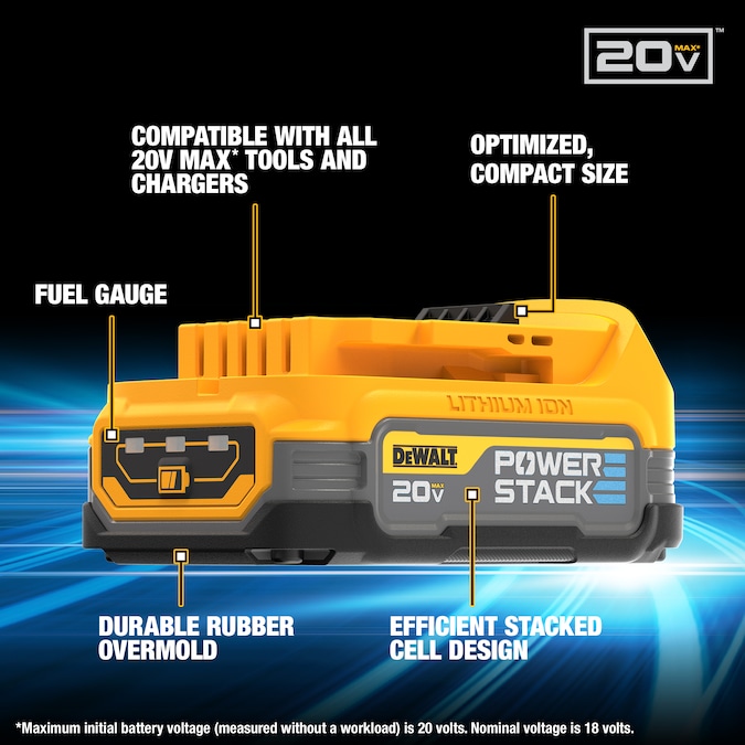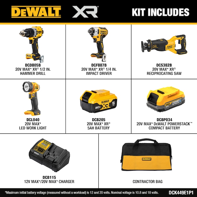 This 20V MAX XR® Brushless Cordless Combo Kit includes 4 tools, two 20V MAX batteries, charger, and kit bag. The DCD805, 1/2-in Drill/Driver is designed to help you complete demanding fastening and drilling projects, this 20V MAX XR® Brushless 1/2-in Hammer Drill/Driver delivers the durability and performance professionals need on jobsite. Quickly drive fasteners into thick material with its powerful brushless motor, which outputs up to 40% more Unit Watts Out compared to DCD796B using DCB205 battery or DCBP034 DEWALT POWERSTACK™ compact battery. DCD805 will help you Speed through masonry drilling applications with up to 34,000 bpm thanks to an integrated hammer mode function. Both Tools are equipped with LED lights for better visibility, The 3-position pivoting LED on the Drill Driver is designed to enhance visibility in dimly lit work areas with its 3 mode settings and up to 70 Lumens of brightness. The 1/4-in Brushless Cordless 3-Speed Impact Driver Compact size (5.3-in front-to-back length) and lightweight (3.4 lb) design for working in confined spaces. Though the Impact Driver is lightweight and compact in size, it does not sacrifice performance with its brushless motor that delivers up to 1,825 in-lb of torque and 3,250 rpm for driving large-diameter screws. The DCS382 Reciprocating Saw has a stroke length of 1-1/8-in and a variable-speed trigger delivering up to 2,900 strokes per min helping you cut through any job. The DCL040 LED Work Light has a bright output of up to 110 lumens to illuminate your work surface. This kit is backed by a 3-year, limited warranty so you can buy with confidence. This cordless kit includes one of our most powerful, most compact, and lightest weight 20V MAX battery, with 50% more power, 25% more compact, and 15% less weight than the DCB203. The DEWALT POWERSTACK™ compact battery works with all DEWALT® 20V MAX power tools and chargers.