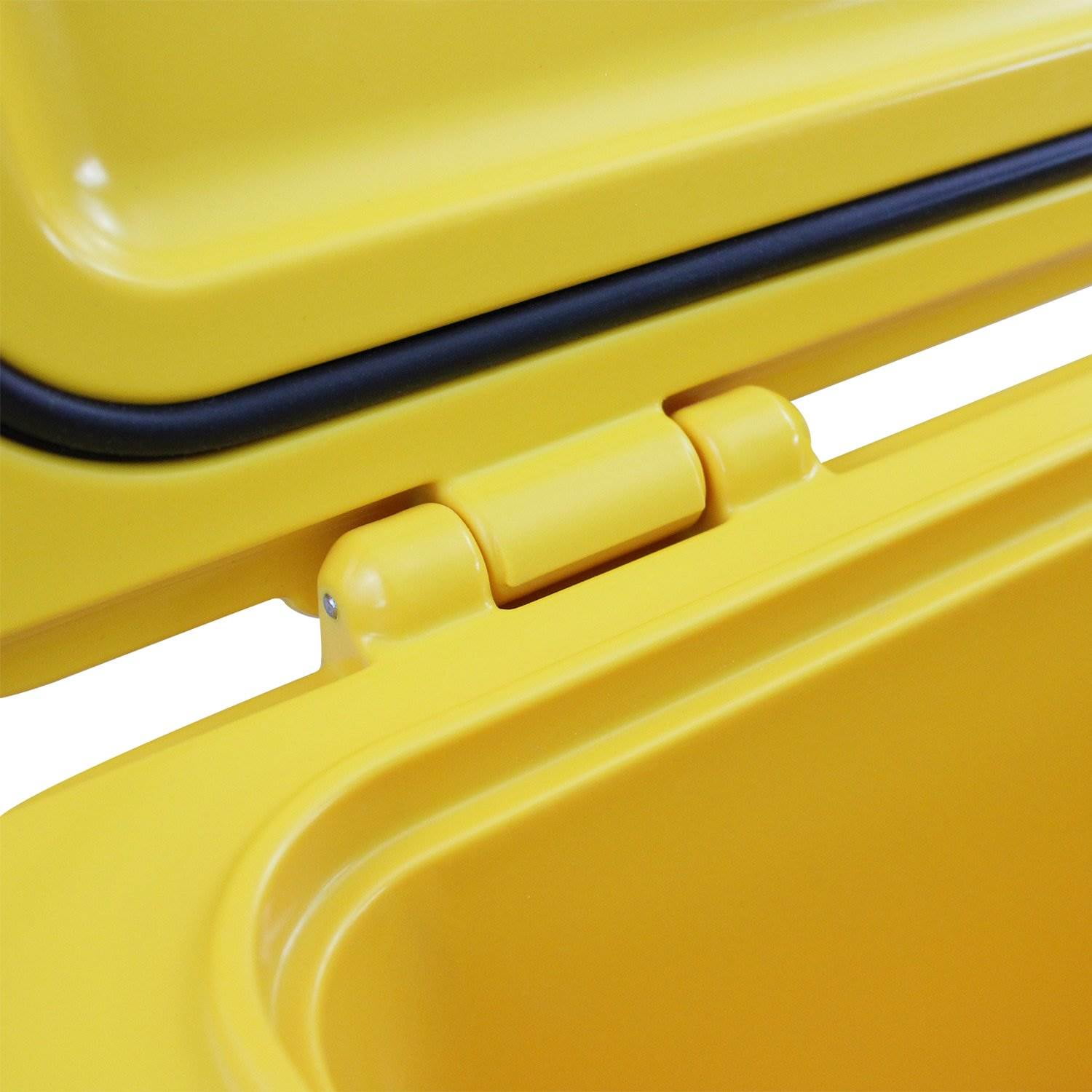 T.O.U.G.H. Roto-Mold design stands up to rough treatment and ensures temperature optimization under great heat Reinforced insulation keeps ice cold to keep food and drinks cold for days Heavy-duty metal handle for easy transporting Integrated bottle opener for convenience Easy-open latch system provides secure closure Features 2 cup holders on the outside of the lid Designed to store an optional ice pack on the inside Color: Yellow Dimensions (L x W x H): 22.24 x 14.09 x 13.82 inches Weight: 18.1 pounds Manufacturer warranty: 5-year warranty