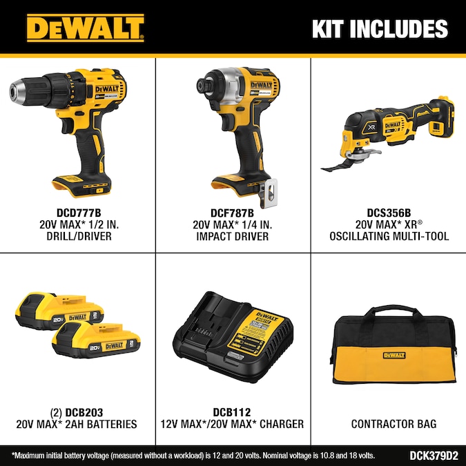 - Includes (1) DCD777 20V MAX* Brushless 1/2-in Cordless Drill/Driver, (1) DCF787 20V MAX* Brushless 1/4-in Cordless Impact Driver, (1) DCS356 20V MAX* XR Brushless 3-Speed Cordless Oscillating Multi-Tool, (1) DCB107 Charger, (1) Contractor Kit Bag, (2) DCB203 20V MAX* Lithium-Ion 2 Ah Batteries