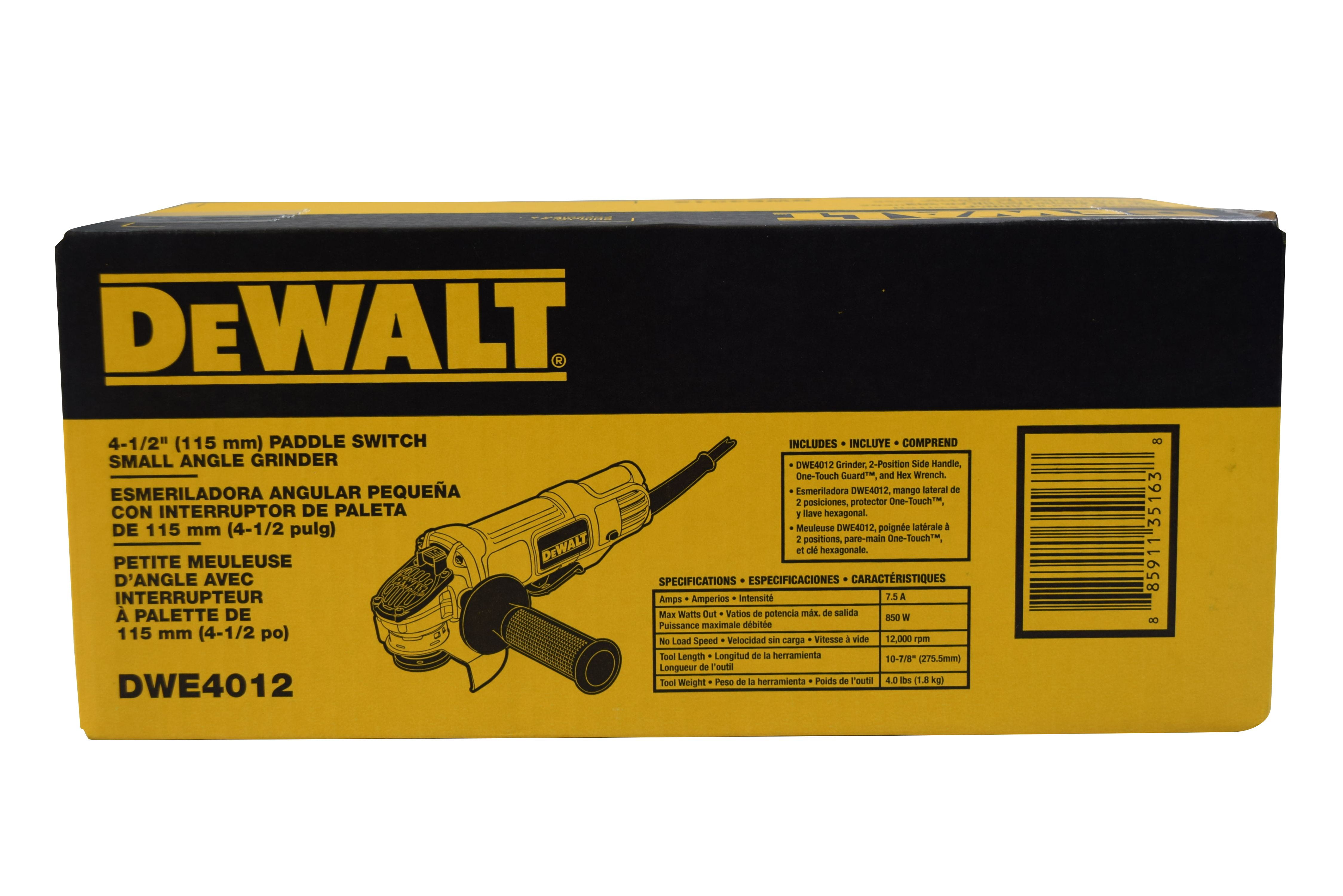 DEWALT 7-Amp 12000 RPM Paddle Switch Small Angle Grinder DWE4012. Description: The DEWALT DWE4012 Angle Grinder is designed with a 7 Amp AC/DC, 12,000 RPM motor for faster material removal and higher overload protection. One-touch guard allows for a single action to adjust the guard – no buttons or levers – just turn the guard to position it. There are two position removable side handles that provide increased comfort and control.