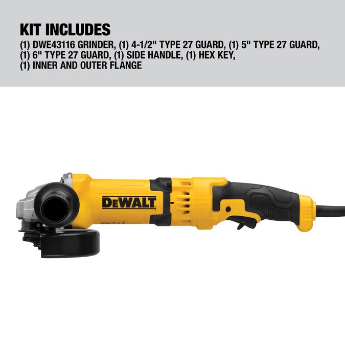 - Includes: (1) DWE43116 Grinder; (1) Side Handle; (1) Inner and Outer Flanges; (1) 5-in Type 27 Guard; 4.5-in Type 27 Guard; 6-in Type 27 Guard