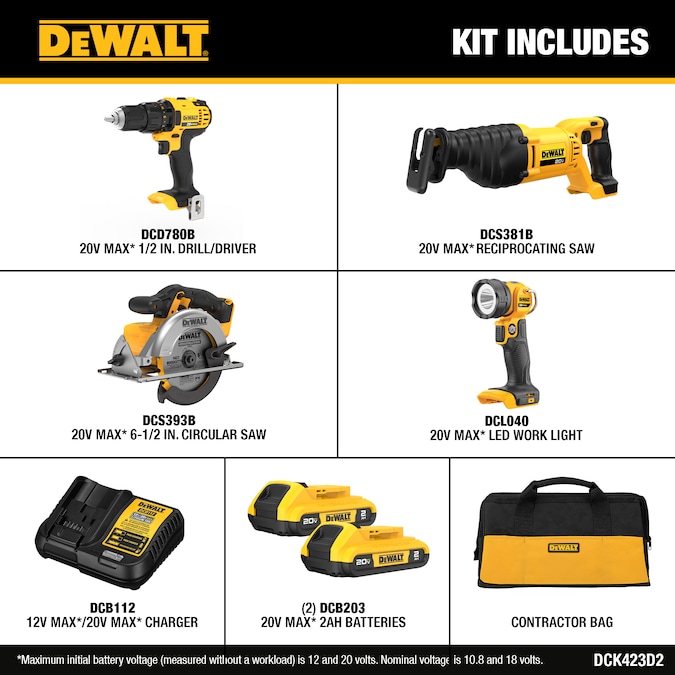 - The DEWALT 4-Tool combo kit includes: one DCD780 drill/driver, one DCS381 reciprocating saw, one DCS393 circular saw, one DCL040 worklight, two 20V MAX 2.0Ah lithium-ion battery packs, one 20V MAX charger, and one contractor bag