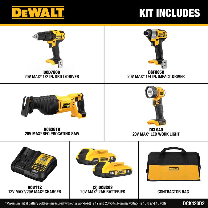 - Includes DCD780 drill/driver, 1/4-in impact driver, DCS381 reciprocating saw, DCL040 LED work light, two 20-volt MAX 2.0 Ah lithium ion batteries, a charger and a contractor bag