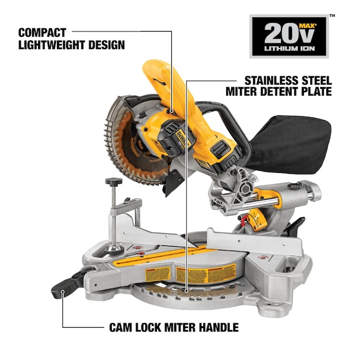 The DCS361M1 20-volt MAX 7-1/4-in sliding miter saw comes with a battery and charger which provides on average 183 cuts of 2 x 4 pine or 275 cuts of 3-1/4 pine baseboard. Adjustable stainless steel miter detent plate with 11 positive stops improves productivity and ensures cutting accuracy.