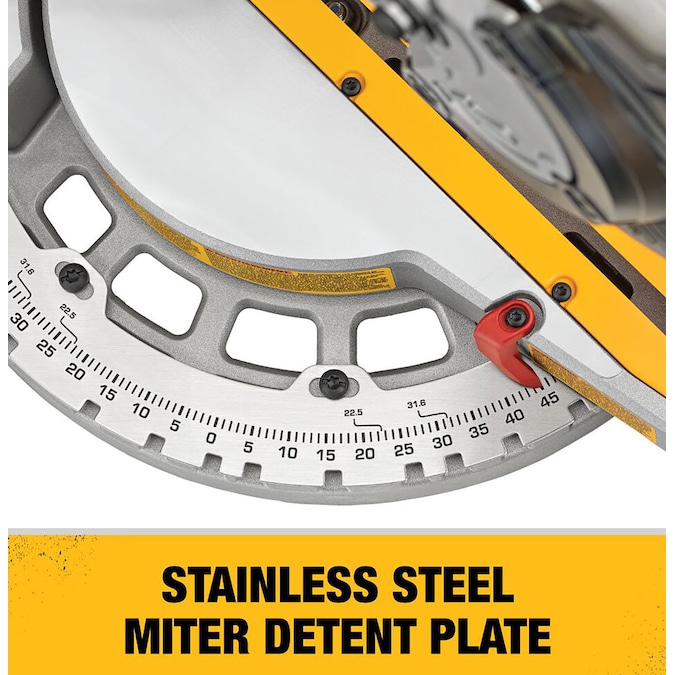 The DCS361B 20-volt MAX 7-1/4-in sliding miter saw features an adjustment free cut line indication for better accuracy and visibility. Adjustable stainless steel miter detent plate with 11 positive stops improves productivity and ensures cutting accuracy. Compact and lightweight construction for easy transporting and storage.