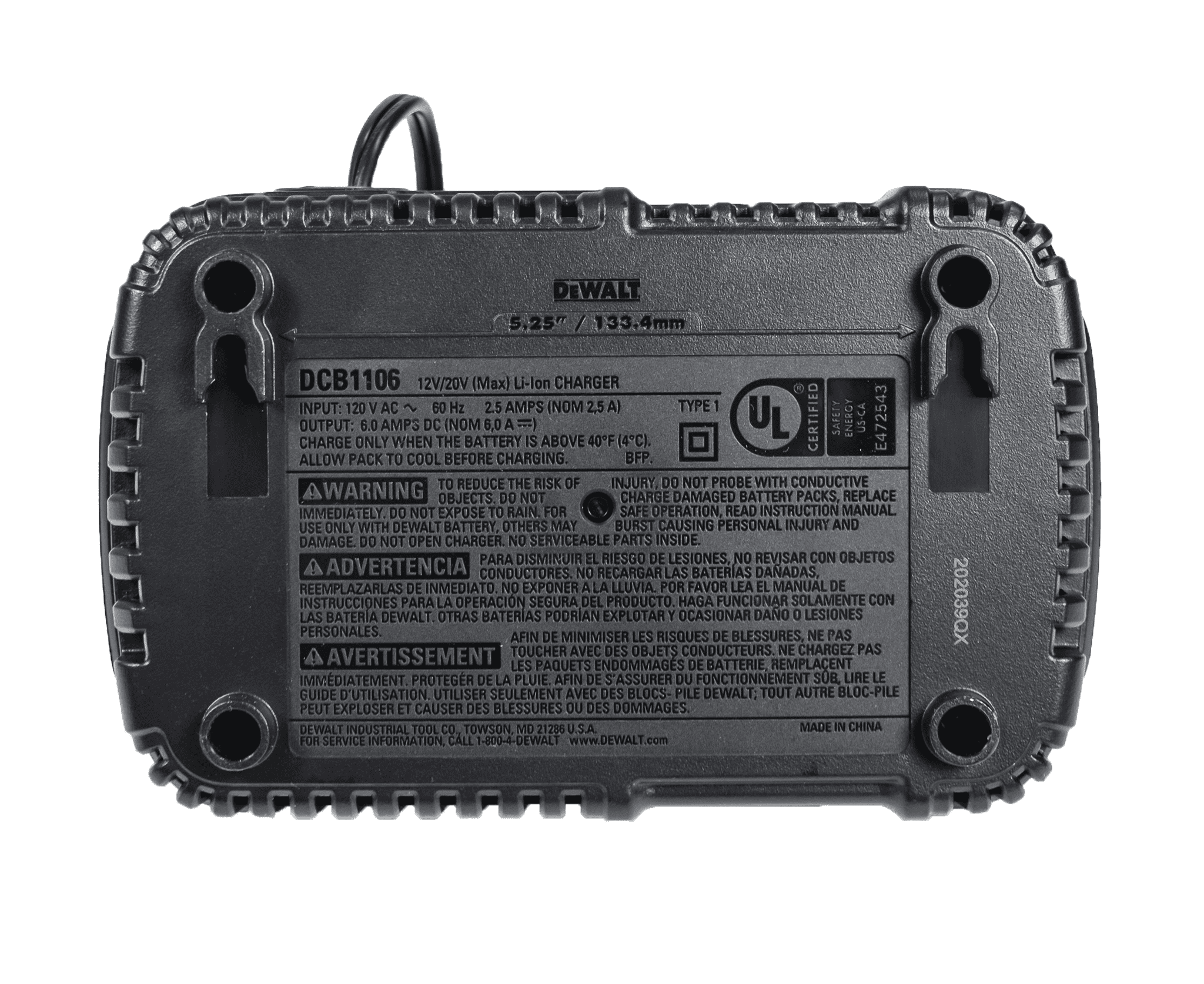 Not in Retail Packaging Charger only, battery NOT included Compatible with all 12V MAX*, 20V MAX*, and FLEXVOLT Batteries Latching for safe portability with battery Installed Stage 1 and 2 LED format communicates more to the user about the batteries state of charge Through-hole wall mounts Double-insulated design Not in Retail Packaging Charger only, battery NOT included Compatible with all 12V MAX*, 20V MAX*, and FLEX-VOLT Batteries Latching for safe portability with battery Installed Stage 1 and 2 LED format communicates more to the user about the batteries state of charge Through-hole wall mounts Double-insulated design