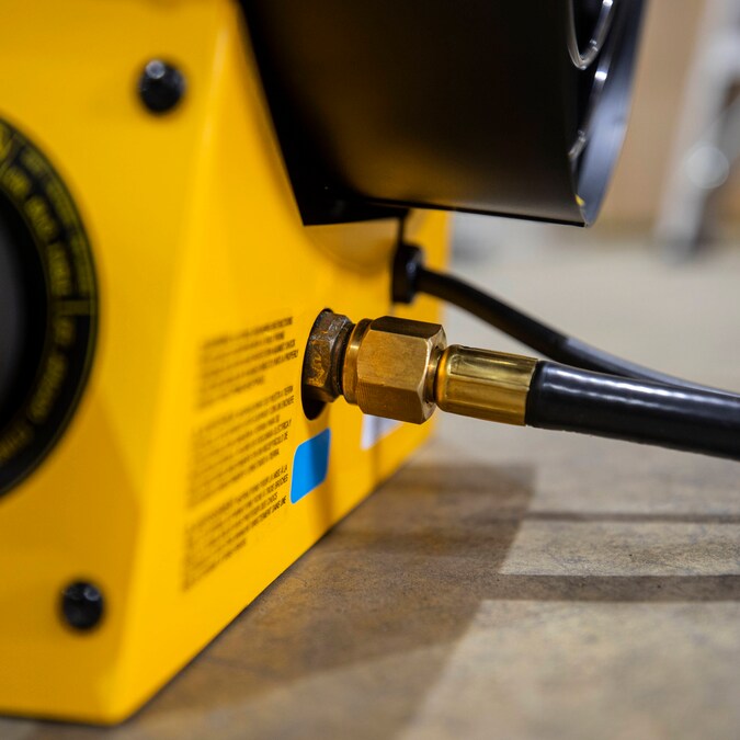 The DEWALT 125,000 BTU portable forced air propane heater is constructed with heavy-duty steel and has a glove-friendly handle, making it the perfect solution for job sites, workshops, garages, warehouses, and barns. Variable output from 75,000 to 125,000 BTUs heats up to 3,125 square feet, with continuous electronic ignition for quick and reliable starting. Have peace of mind with an overheat detection system and a thermo-electric safety valve that shuts off gas flow if the flame goes out, so you can focus on the task at hand. Also features an adjustable heat angle allowing for greater control. Includes a 10 ft. hose and regulator with an approximate 11-hour run time on low with a 40 lb. propane tank, so you can stay warm and comfortable while getting the job done.
