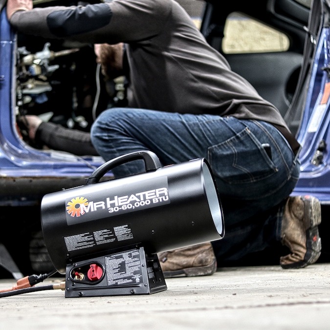 Mr. Heater forced air propane heaters provide instant heat even and feature Quiet Burner Technology, making them 50% quieter than a standard propane heater. The 60,000 BTU model heats up to 1,500 sq ft quick and effortlessly. Also features variable output from 30,000 to 60,000 BTUs, a continuous electronic ignition for quick and reliable starting. Equipped with a high temperature safety shut-off switch and thermo-electric safety valve to shut down the unit in unsafe conditions, so you’ll have peace of mind to focus on the task at hand. Includes a 10 ft hose and regulator with an approximate 12 hours of run time on a 20 lb propane tank, so whether on the work site or in the garage, stay comfortably warm while getting the job done.