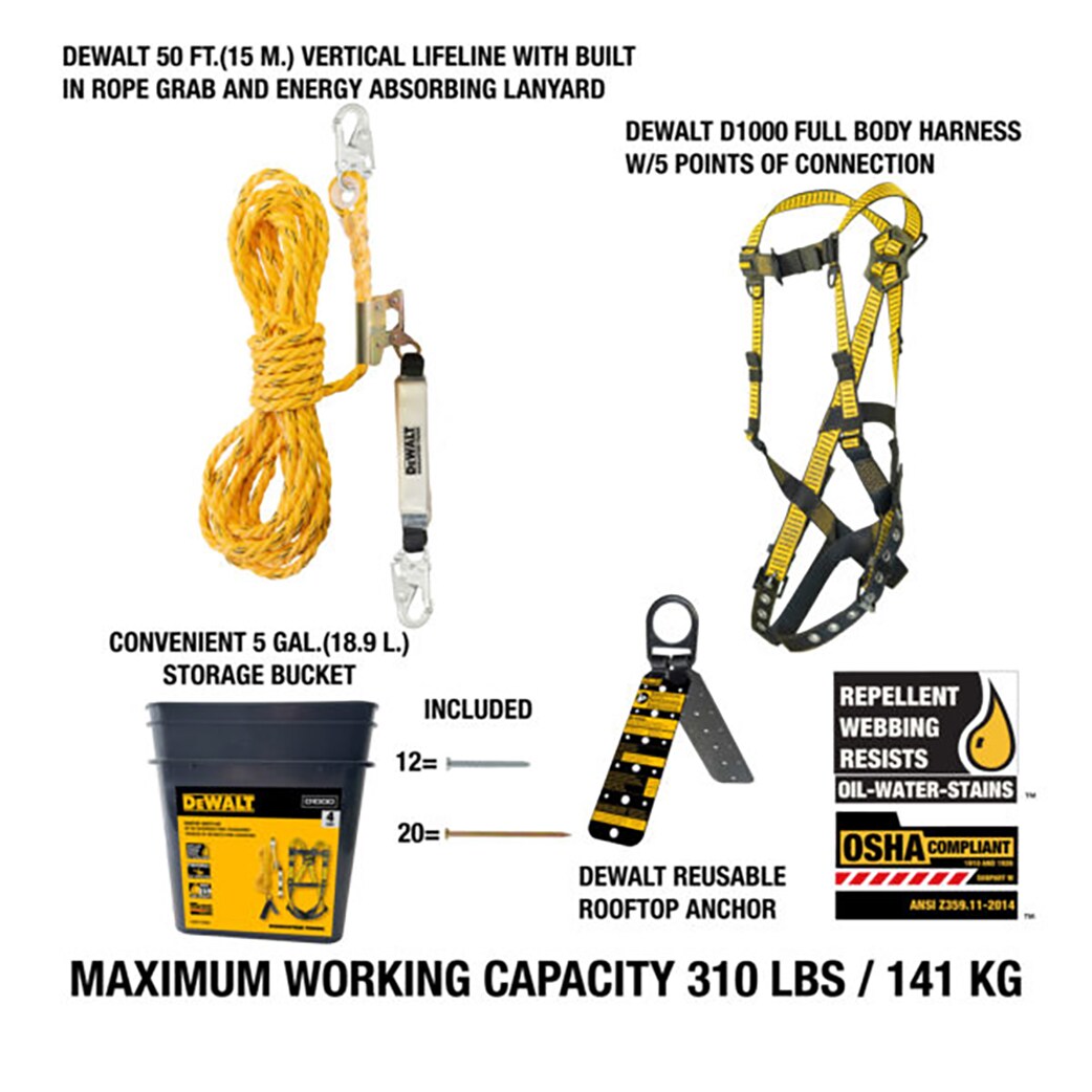 The DEWALT Rooftop safety kit offers a complete setup for roofing applications. It includes our D1000 harness with 5 pts of adjustment and tongue buckle leg buckle connections, a reusable rooftop anchor and a 50 ft. (15 m) lifeline with an integrated energy absorber for full compliance and safety on the job. It all comes in a convenient container for easy storage.