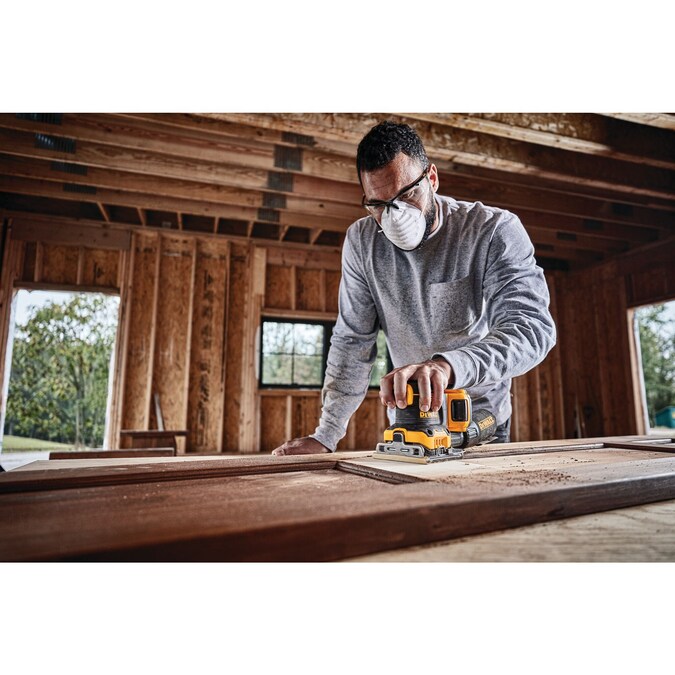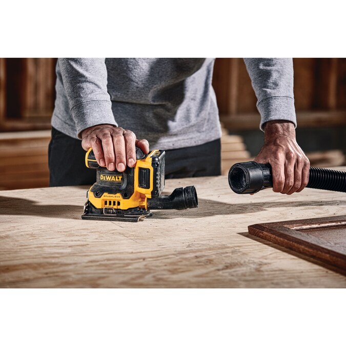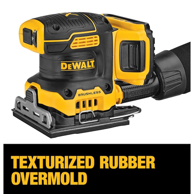 The 20V MAX XR brushless cordless 1/4-in sheet variable speed sander provides you with the power and runtime needed to get the job done. A variable speed dial provides speed control from 8,000-14,000-OPM for a variety of applicant. One-handed locking dust bag attaches securely to the sander to aid in dust collection or the user can attach the sander directly to the DWV010 or DWV012 dust collectors. Rubber overmold grip provides comfortable sanding. Paper clamp designed to hold paper securely and for ease of installation.