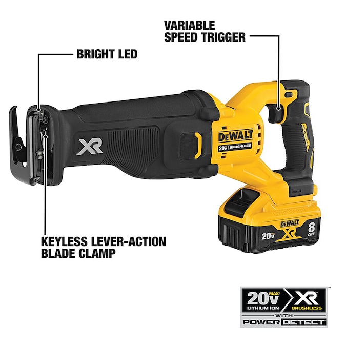 Maximize performance when using high-capacity XR® batteries with tools featuring POWER DETECT™ tool technology. The 20V MAX* XR® Brushless Cordless Reciprocating Saw with POWER DETECT™ technology delivers up to 44% more power* for tough jobs when paired with a 20V MAX* 8Ah battery.