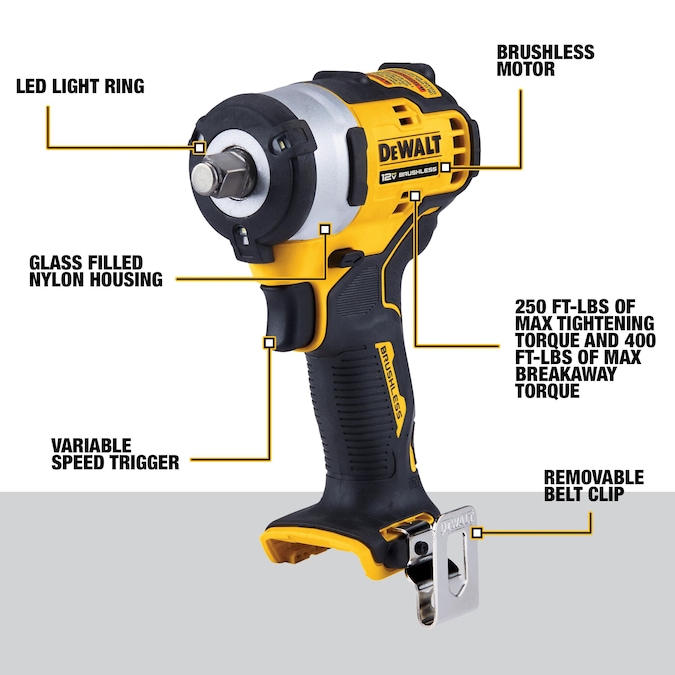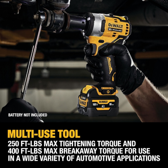 Ideal for use in a wide variety of automotive applications, the XTREME 12V MAX Brushless 1/2-in Cordless Impact Wrench delivers 250 ft-lbs of max tightening torque and 400 ft-lbs of max breakaway torque to tackle stuck and stubborn fasteners. Access tight areas with its compact design while the LED ring illuminates your workspace. With a glass-filled nylon housing that resists harsh chemicals and solvents, this tool will deliver quality performance day in and day out. Includes the tool only.