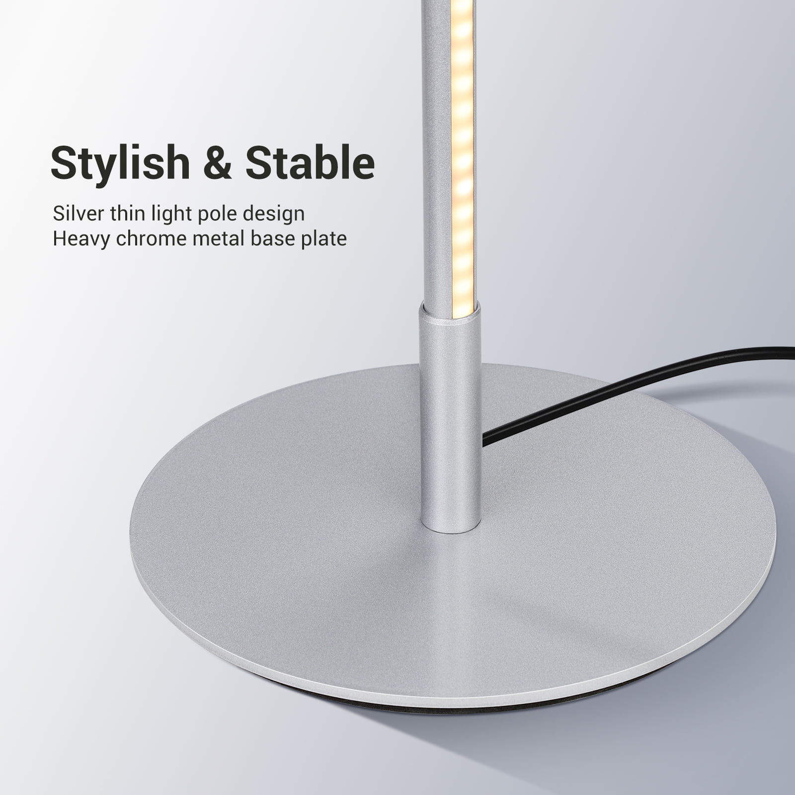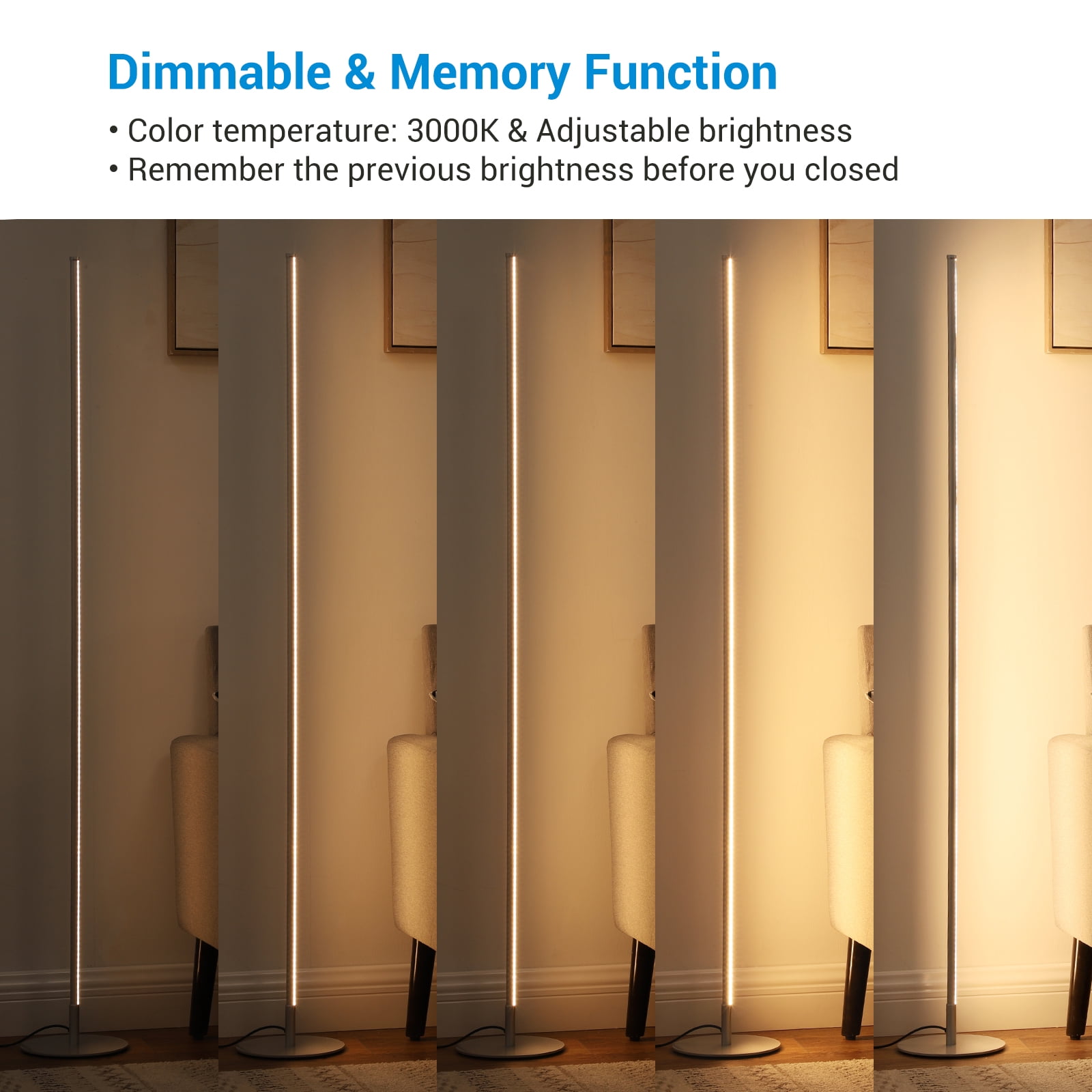 Stepless Dimmable– Adjust the brightness from 10-100% to provide comfortable light, allowing you to customize the brightness according to life or work needs, such as living room, bedroom, office, foyer, den, and study room. Foot Switch & Memory Function– One-button operation with foot switch control. Short press to turn it on/off; Long press to adjust the brightness. The corner lamp can also memorize the pattern you set up before closes. Simple Slim Tall Lamp– The mood floor lamp is space-saving, this small lamp doesn’t take up much space. Just put this standing lamp beside a corner or a couch, showing a refined and modern interior design. Stable and Sturdy– Made of high-quality aluminum, a heavy chrome metal base plate keeps the lamp sturdy in place and wobble-free, which prevents it from tipping over when moving it or an accident occurs. Long Lasting and Safety– Features over 30,000 hours long life with normal use, the LED floor lamp never needs to replace a bulb and is energy saving. It will never overheat and stay cool to avoid accidental burns. Specifications: Product Height: 57.5 IN Base Length: 7.8 IN Wire Length: 70 IN Color Temperature: 3000K Materials: Iron, ABS Input Voltage: AC 100V-240V 60Hz Max.Load Power: 19W