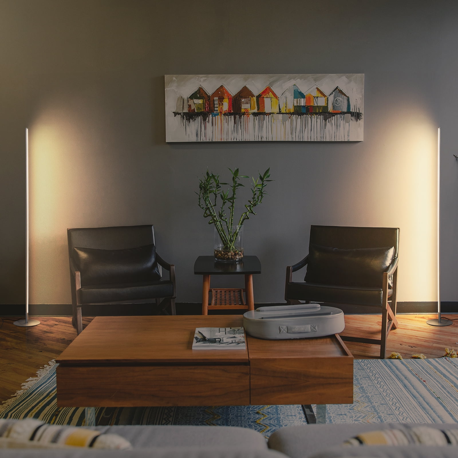 DEWENWILS 2-Set 57.5″ Modern LED Corner Floor Lamps for Living Room, Dimmable, Minimalist Standing Lamps Set for Bedroom,Office, Metal Silver