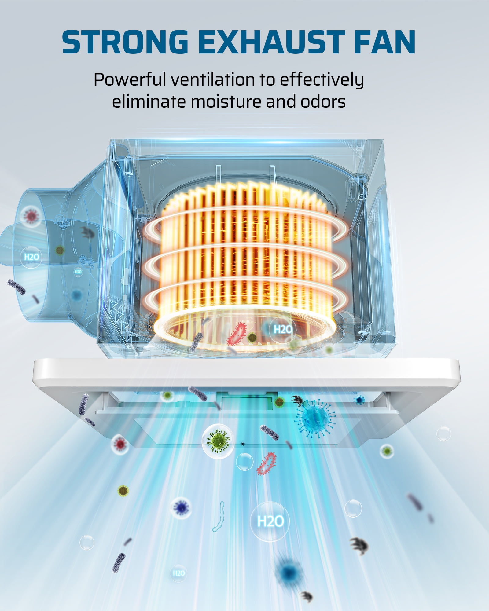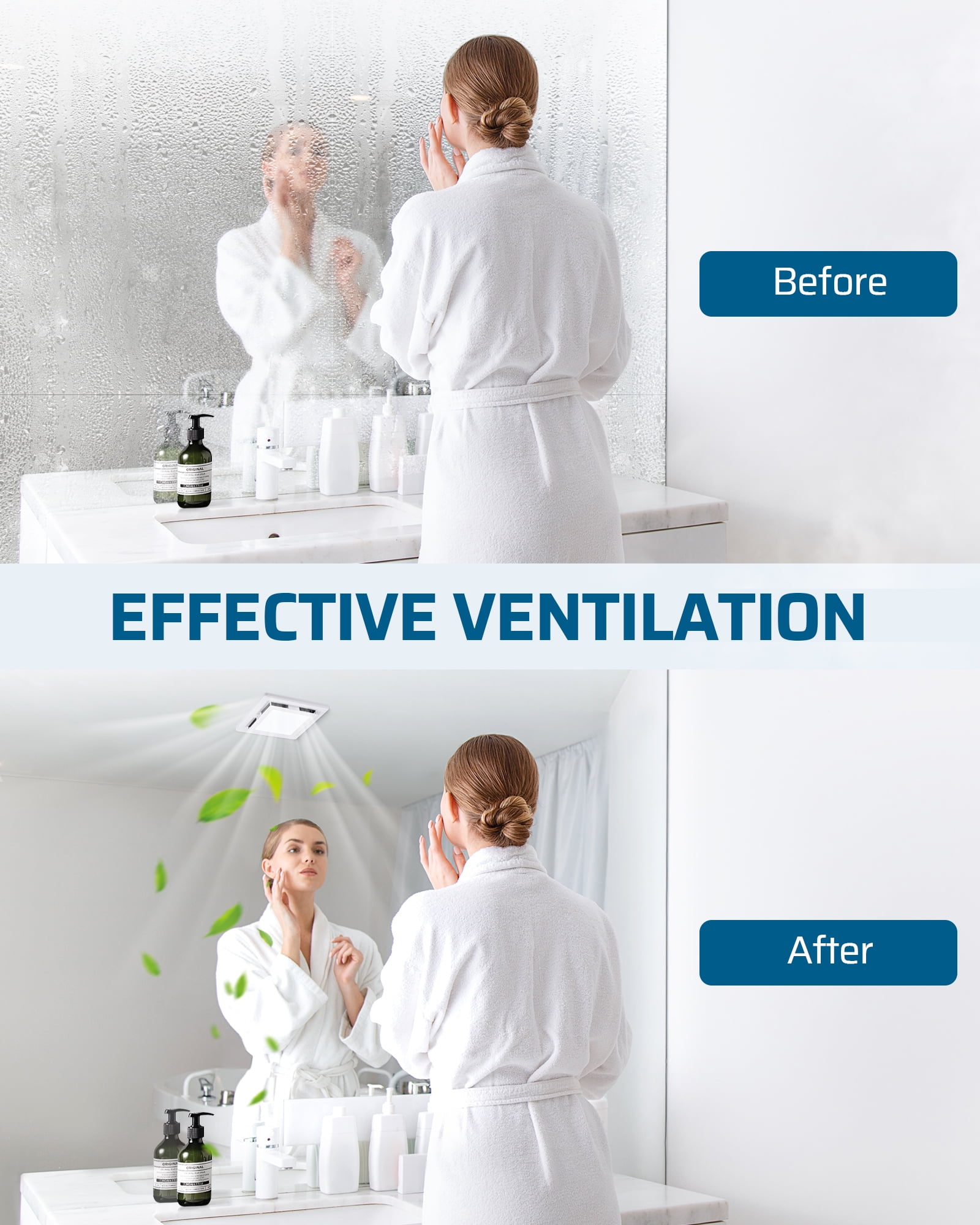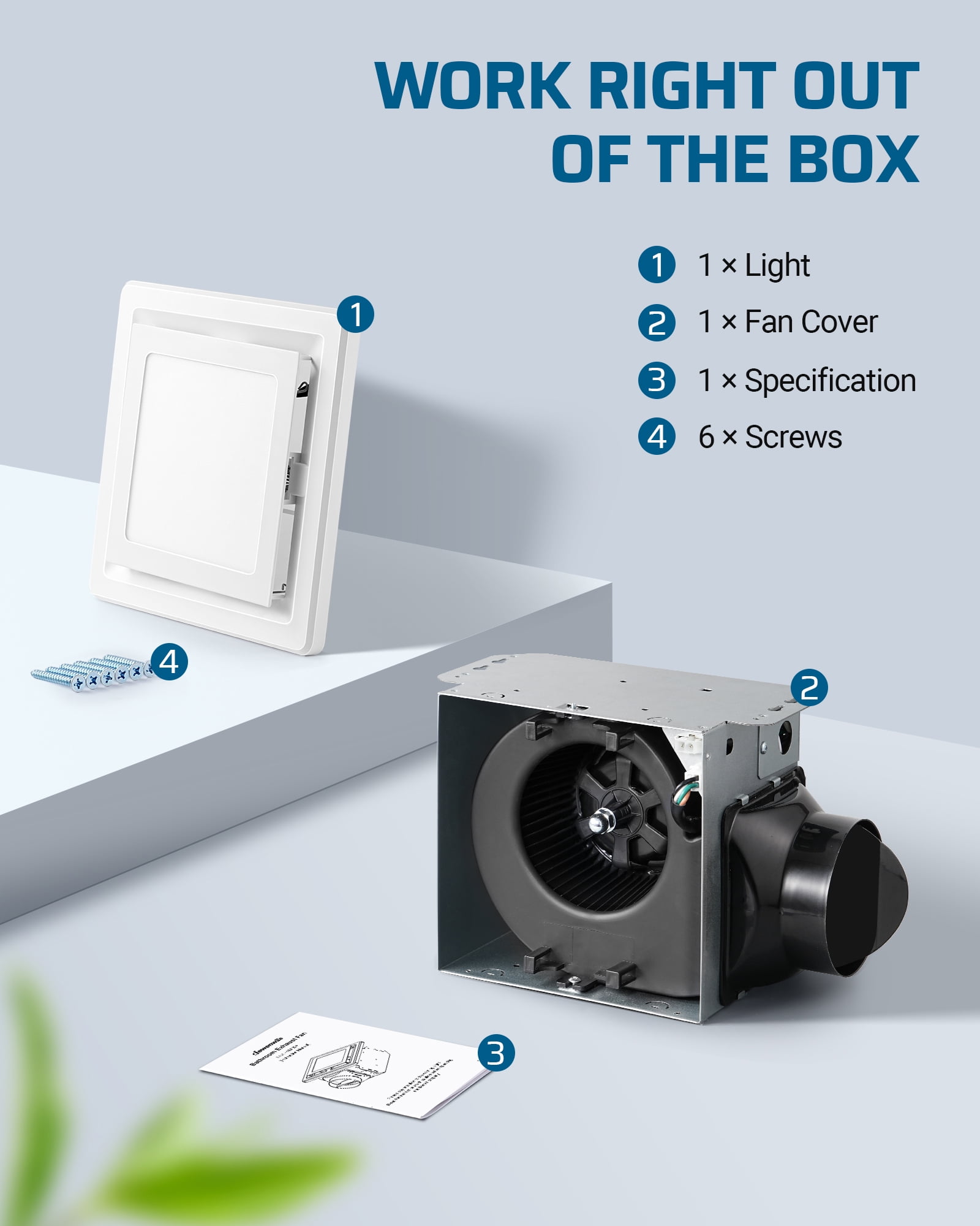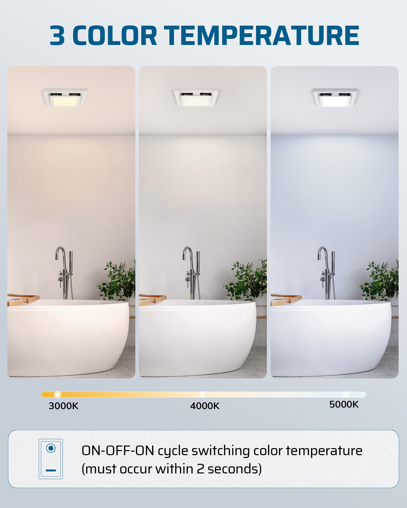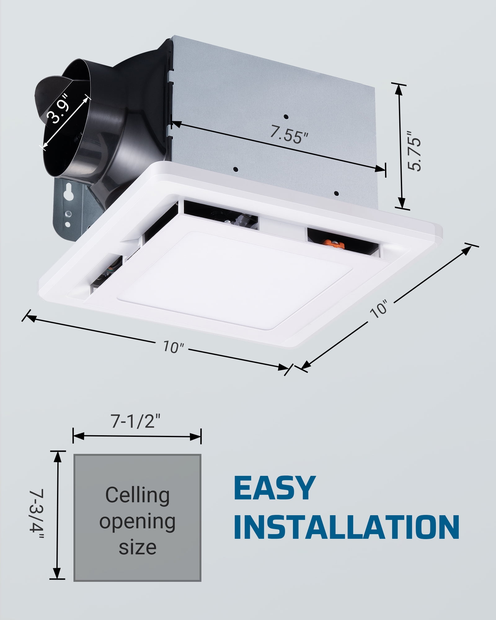 Powerful Airflow & Quiet– This bathroom fan with light boasts an impressive airflow of 80 CFM while maintaining a low noise level of just 1.5 Sones 3CCT Adjustable Light– Customize your adjustable bathroom fan lighting to your favorite color with 3 options: 3000K/4000K/5000K; enjoy a high brightness of 800 lumens (14W) and cycle through ON-OFF-ON to change the color temperature Easy to Install– DIY your bathroom light as needed, this bathroom exhaust fan can be installed quickly and easily without tools; Improve humid environments with poor ventilation, note that the ceiling opening size is 7.75×7.5 inches Modern Design & Durable– This lightweight and corrosion-resistant exhaust fan features a square light fixture, and simple white plastic casing, suitable for bathroom, loft, or entertainment room, fits any decor style; durable ABS material for years of use Safe & Warranty– The high-quality housing of the ventilation fan is made of fire-resistant material, which ensures the safety and comfort of your home without worrying about residual water vapor in the bathroom when using the hairdryer; UL listed, 1-Year Warranty Specifications: Input Voltage: 120VAC 60Hz Fan: 28W 80CFM 1.5Sones Light: 14W 800lm 3000K/4000K/5000K 3CCT Adjustable as ON/OFF/ON in 2 seconds