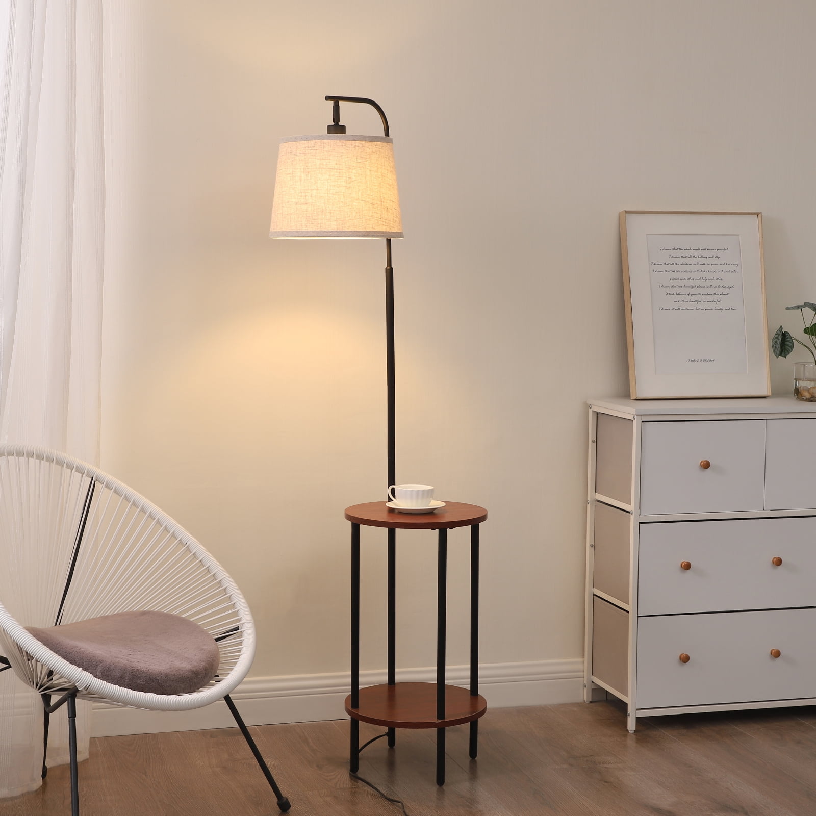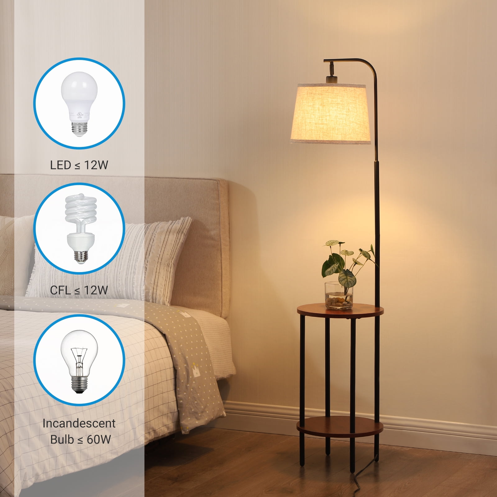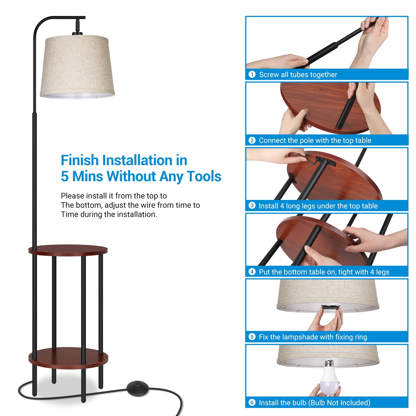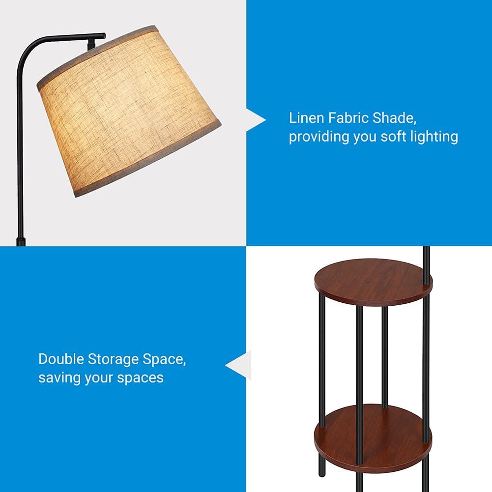 2 Storage Tables – Lamp shelf combo comprises of 2 round Red Wood tables which can be used to place any decorative stuff . Saving Space- The diameter of the table is 13.18“, saving space and is ideal for small rooms e.g. kids room, guest room, offices Foot Switch – The foot switch is easy to access and allows you to quickly turn on/off the light without having to bend down, save your waist Adjustable Head – With the adjustable shade, you can direct the light anywhere you need it Perfect Floor Lamp for Your Room- Painted in Black accented with Red Brown wooden storage trays for minimalists taste Specifications: Product Height: 62 IN Wire Length: 8.2FT Materials: Metal, Wood, Linen Input Voltage: 120VAC 60Hz Max. load Power: LED/CFL ≤ 12W; Incandescent Bulb ≤ 60W Socket Type: Standard Medium E26 (bulbs not included)