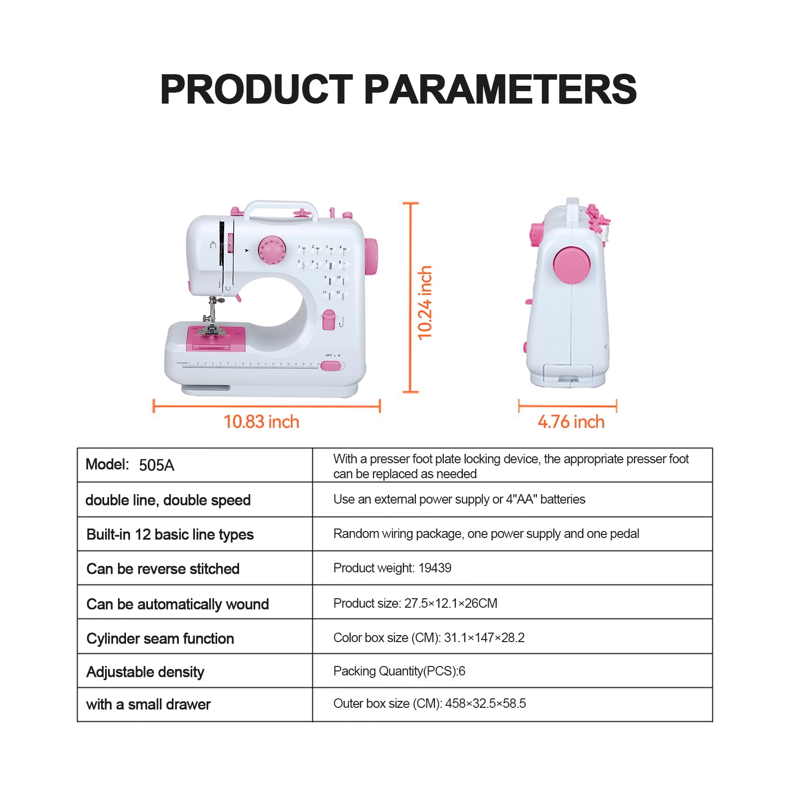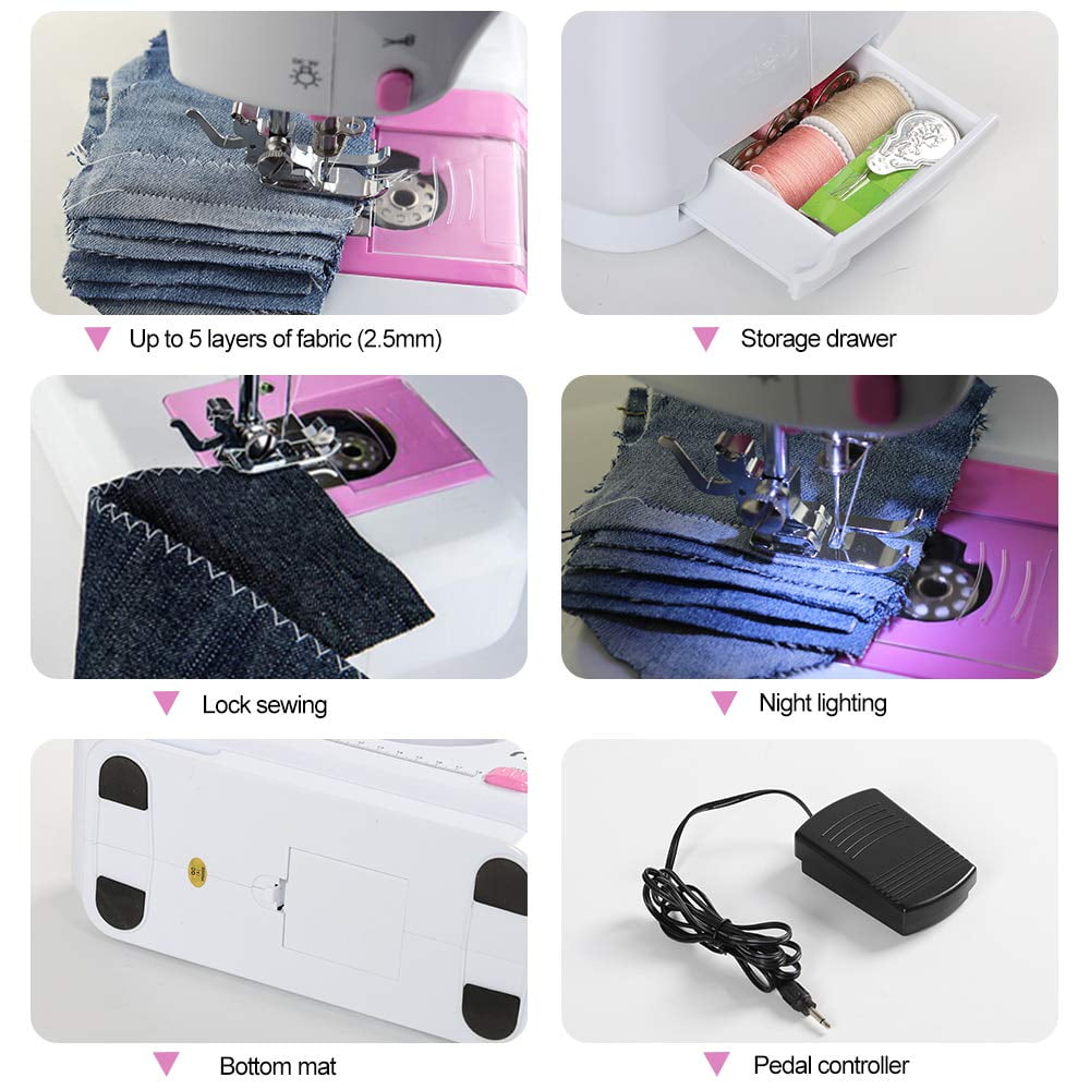 ????【Mini Size & Multifunction】:The size of this portable sewing machine is 10.83″x4.76″x10.24″, exceptionally small, light weight and compact, easy to handle and use. Replaceable presser foot design, by changing different presser feet, to achieve more special functions for sewing.The equipment adopts metal hook tip design, which is durable and does not jumper. ????【Full Accessories】:The mini sewing machine provides extra support for your sewing and quilting projects. With US Power supply, threader, bottom line, Surface line, pedal, presser foot, needle, manual and expansion board.Let you more convenient and stable while sewing. ????【Suitable for Daily Use】:Suitable for cotton fabric, linen, silk, ployester, thin demin and thin jeans, like t-shirt, toys and apron etc. due to this sewing machine is relatively small and compact, please make sure the fabric is not too thick or hard.Pullable storage, small drawer design, convenient storage and placement of parts and accessories ????【Easy to Use】:Dual power options powered by 4 AA batteries (not included in the package) or power adapter but please don’t use these 2 power supply modes at the same time. Double thread stitching make it easy to finish sewing without knotting. Low/high speed button is equipped for selection to keep safe and powerful. ????【Great Gift】:Made of upgraded eco-friendly material, You can DIY your handbags, clothes, curtains, sheets, tablecloths, shopping bags, lunch bags, pillow dolls and other fabrics. Cute and sleek look makes it an ideal gift for your daughter, sister, mother, on Children’s Day,Birthday, Mother’s Day, Valentine’s Day, Thanksgiving Day, Christmas.