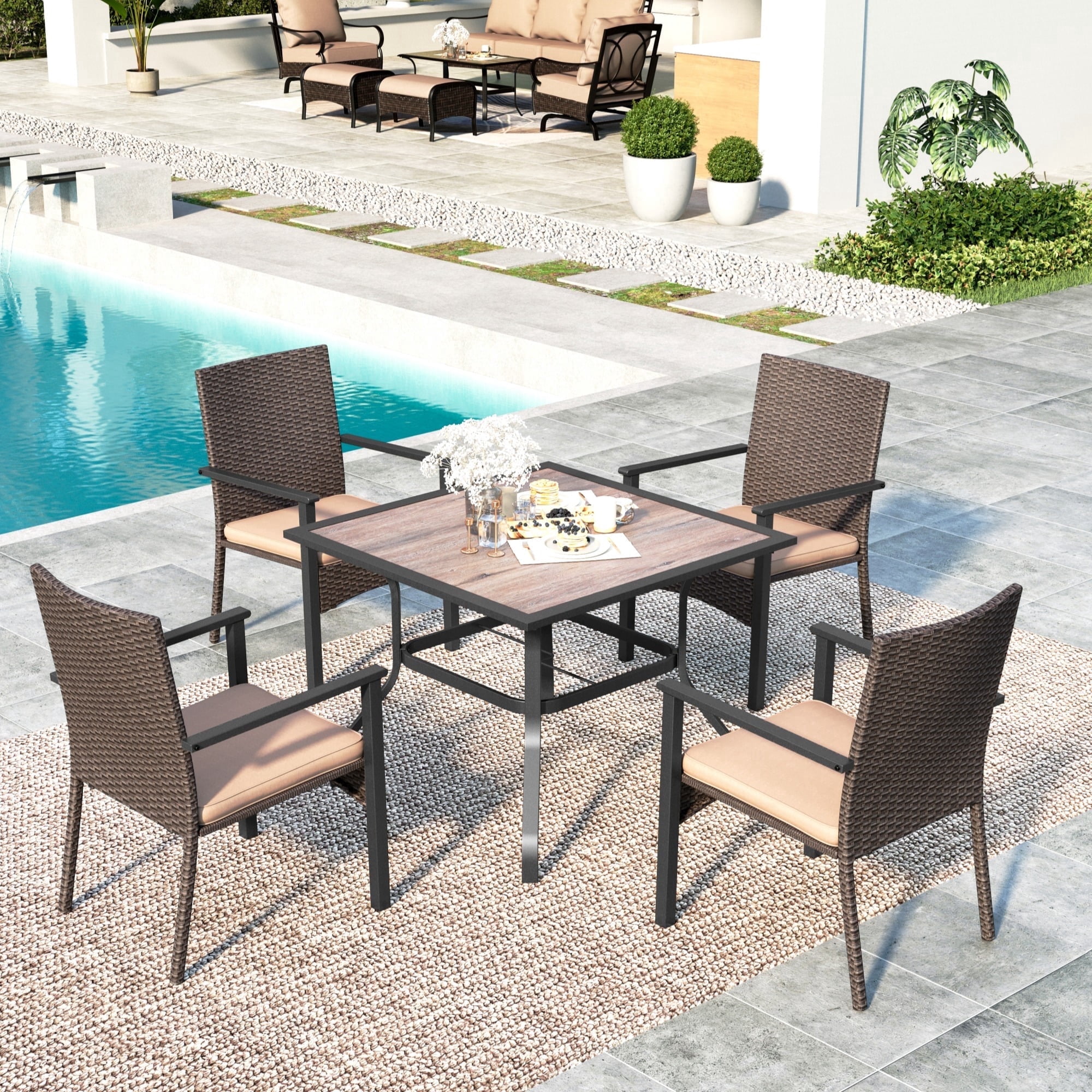 Includes: Two (2) Rocking Chairs Material: Acacia Wood Cushion Material: Water Resistant Fabric Fabric Composition: 100% Polyester Finish: Teak Cushion Color: Peachy Beige Hand-Crafted Details Assembly Required Dimensions: 33.25 inches deep x 24.00 inches wide x 35.75 inches high Seat Dimensions: 19.00 inches deep x 20.75 inches wide x 16.50 inches high Arm Height: 26.75 inches