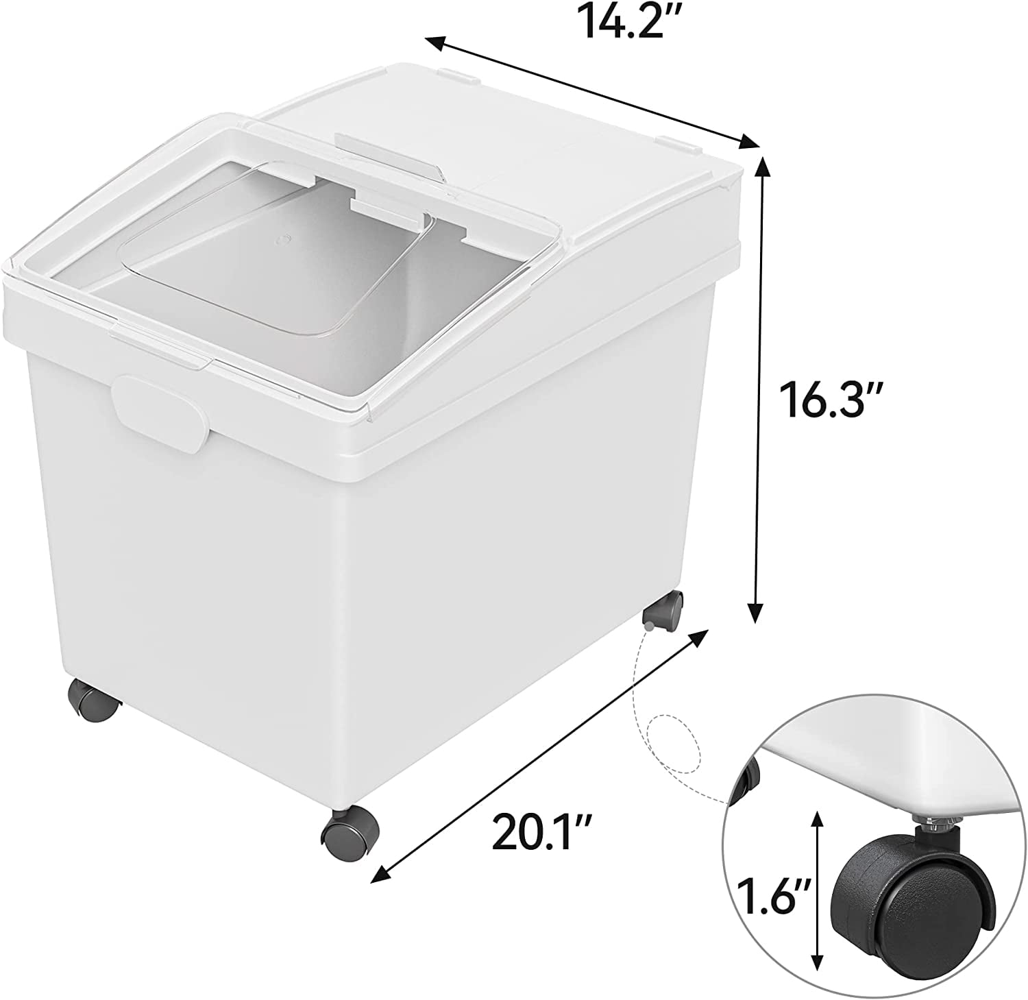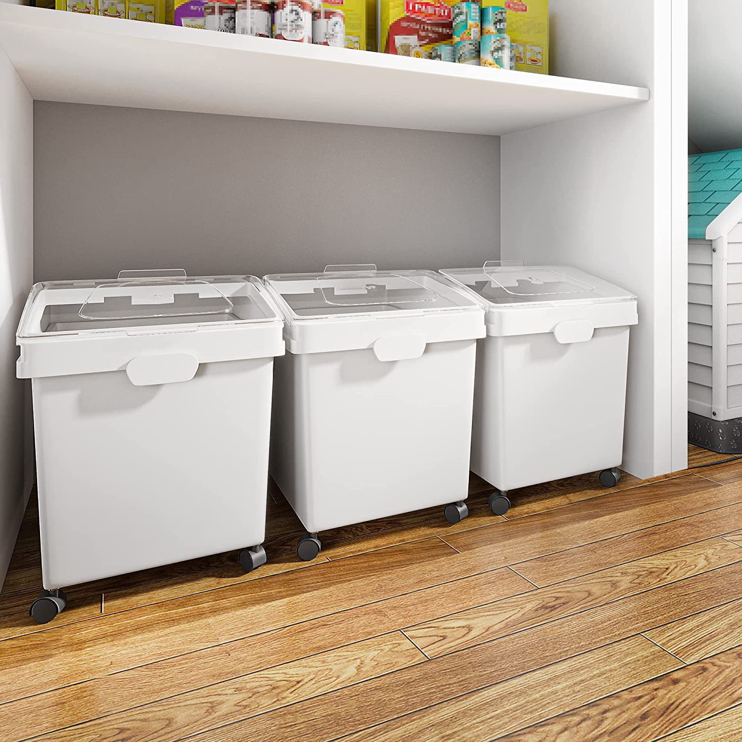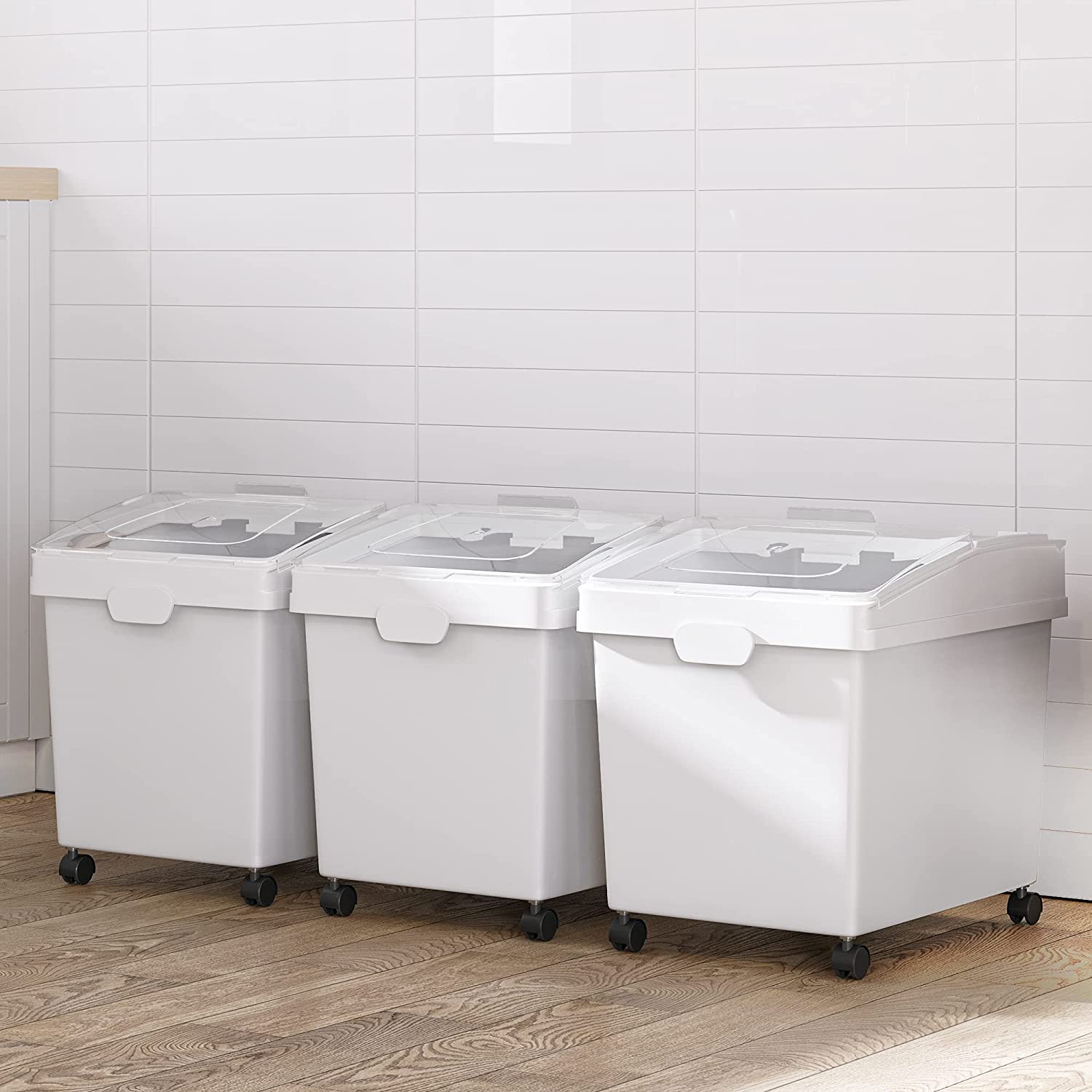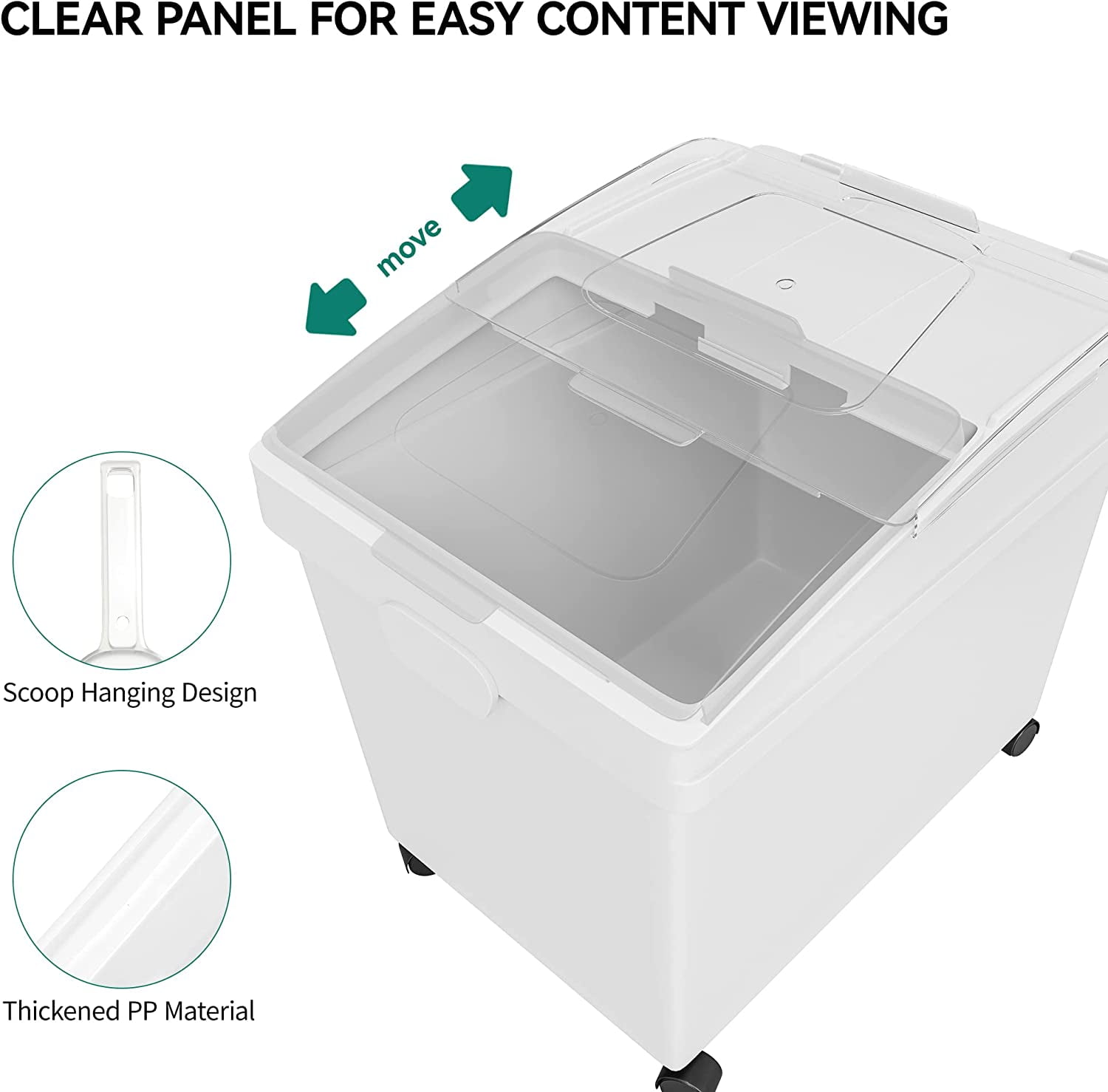 Large Storage Capacity: This shelf ingredient bin features a large capacity of 10.5*3 gallons; A set of 3 so you can store different ingredients separately such as baking sugar, flour or pet food Convenient Shovels: The ingredient storage bin comes with 3 transparent shovels for greater convenience; Large transparent window at the top allows for easy observation of internal changes; Sliding lid allows you to easily access the ingredients with no need to frequently remove it from the cabinet Premium Materials: Made from premium PP material with no odor, sturdy and durable with a long service life; The cover is equipped with a lock catch to enhance sealing ability; Your trusty companion for baking and cooking; Simple internal structure without dead corners make it easy to clean and wipe Easy Movement: The flour bin is equipped with 4 detachable 360 degree rotatable wheels to be easily moved even when fully loaded; Allows for smooth movement and transportation around the kitchen or storage room; Use it according to your own needs Multifunctional Use: This storage bin is suitable for storing a large amount of dry ingredients such as baking ingredients, sugar, pasta, rice, various grains, and can also be used to store pet food; Also suitable for bakeries, restaurant, kitchens and coffee shops