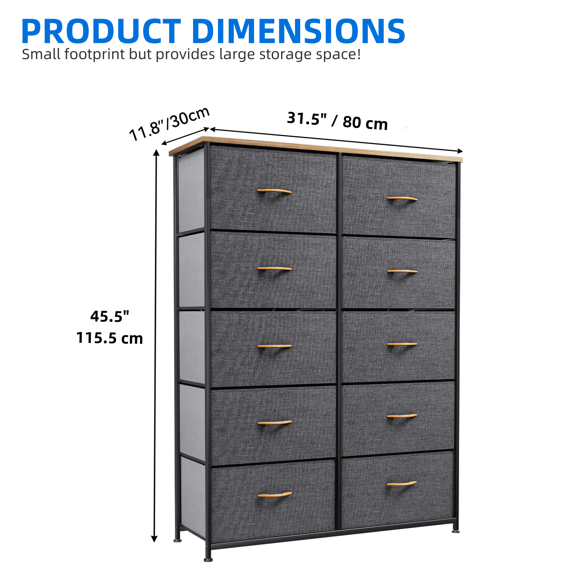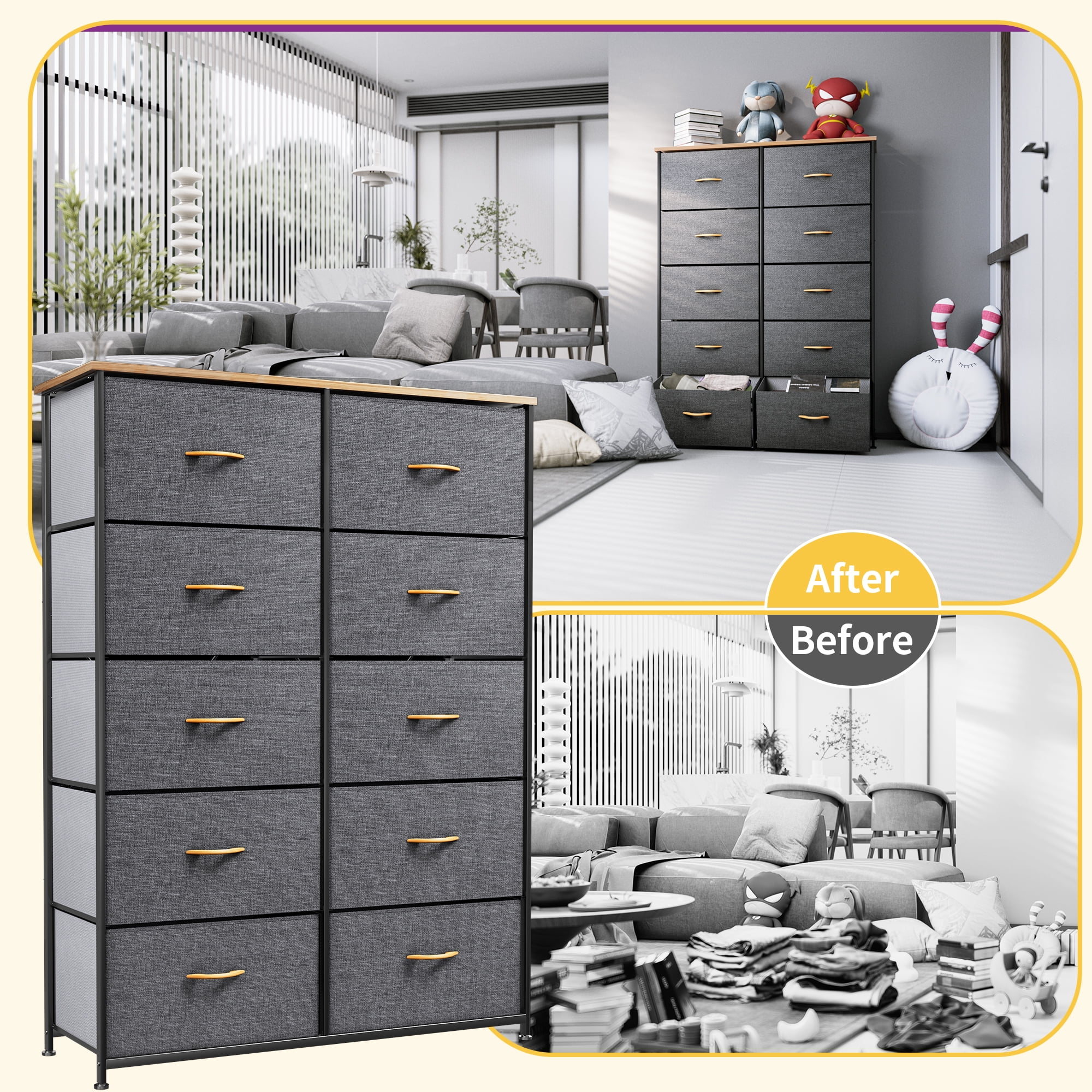 Quality Construction: Built with a robust metal frame and a durable MDF wooden top for long-lasting use. The dresser features 10 removable, foldable drawers with easy-to-pull wooden handles. Supported by 4 adjustable plastic legs that protect floors from scratches. The crossbar design on the back enhances stability, and the dresser can be securely anchored to a wall for safety. Durable Fabric: Each drawer’s front is crafted from premium cationic polyester fabric, while the sides are covered in breathable, non-woven synthetic fabric. Designed for easy maintenance—simply wipe clean with a damp cloth and air dry. Easy Assembly: The dresser comes with clear instructions and all necessary tools for a quick, hassle-free installation. Assembly requires only fastening a few screws, allowing for a smooth setup process. Versatile Design: Features a sleek, modern design with charcoal-colored fabric drawers, a sturdy black metal frame, and a waterproof MDF wooden top. This stylish storage unit is suitable for various spaces, including bedrooms, living rooms, hallways, closets, entryways, and nurseries. Ample Storage Capacity: Offers large storage space with 10 deep drawers, ideal for organizing clothes, scarves, socks, T-shirts, pants, sunglasses, books, small toys, and more. Overall dimensions: 33.9″ L x 11.8″ W x 47.2″ H; Drawer dimensions: 15.6″ L x 11.0″ W x 8.5″ H. Age Group: Suitable for Adults—designed to accommodate the storage needs of adult users while enhancing home organization.