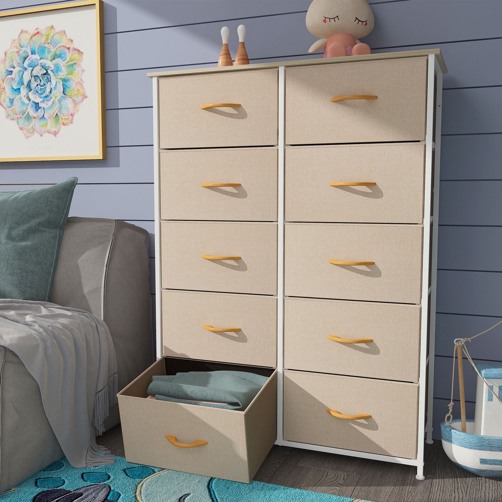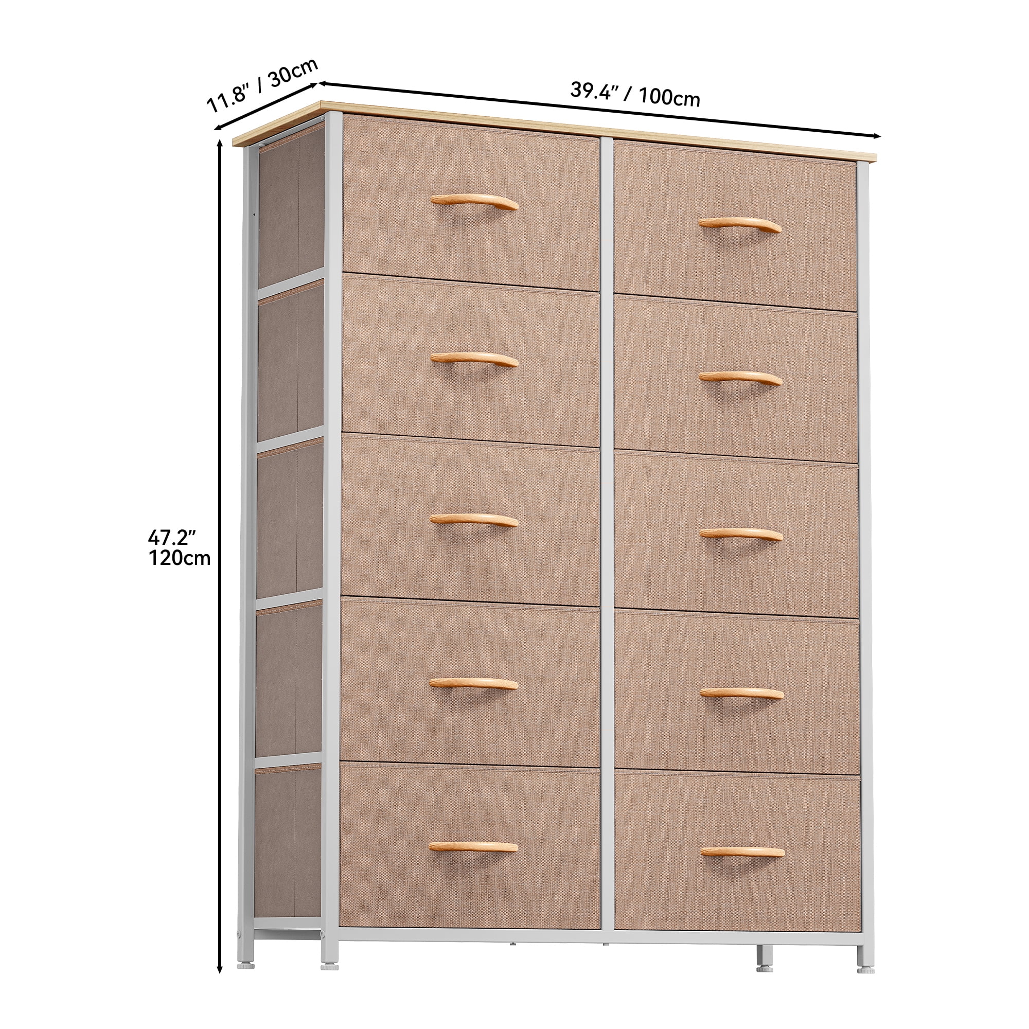 Color: Beige Overall dimensions: 34″ L x 11.8″ W x 47.2″ H Drawer dimensions: 15.4″ L x 11.2″ W x 8.7″ H Dresser’s chest is designed with 10 drawers to offer ample storage Great for bedroom, laundry room, living room, hallway, entryway, or closet Linen storage drawers can be folded when not in use Steel frame and MDF top offer reliable strength and stability Keep control of clutter & create a spacious, tidy home