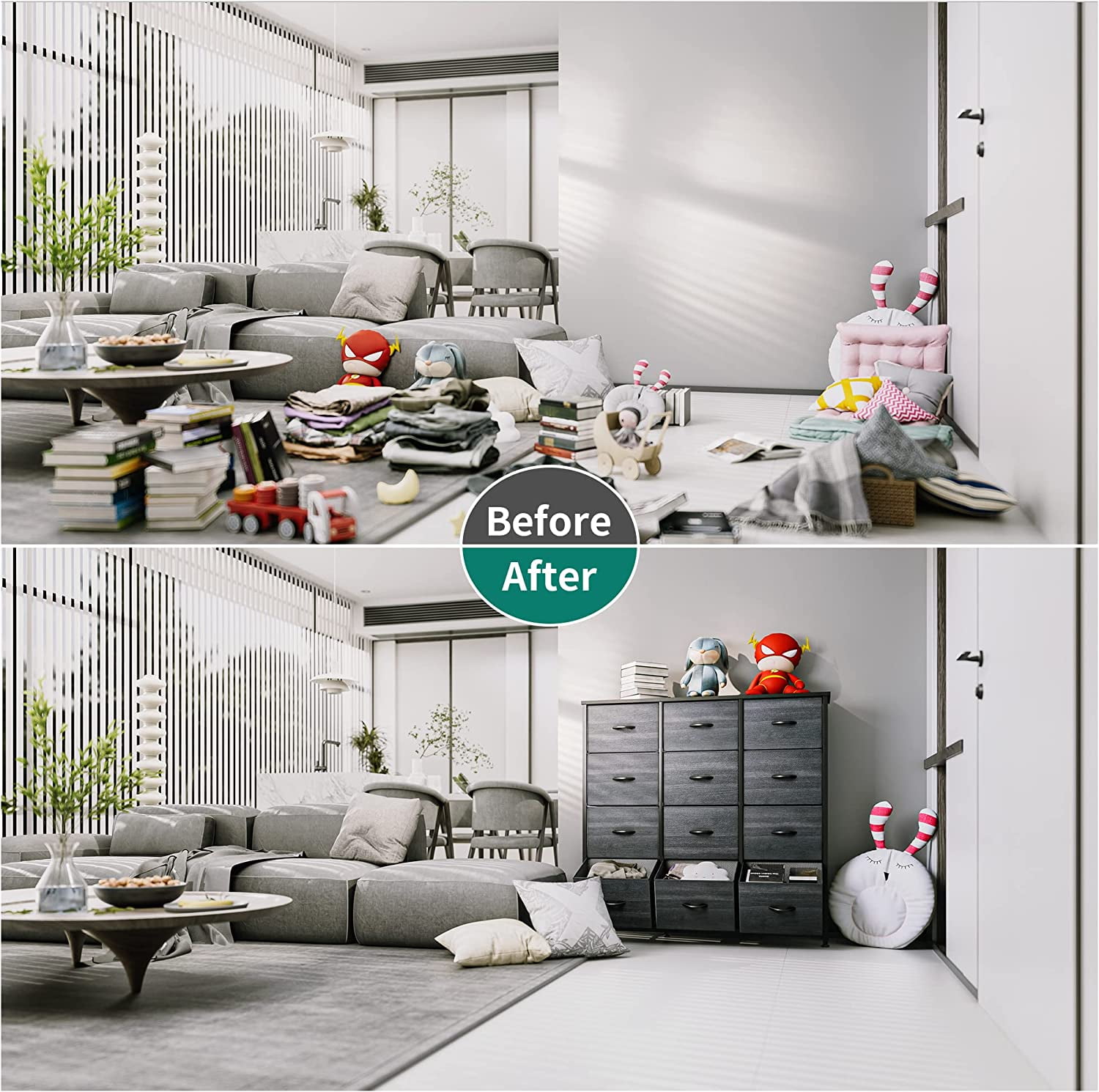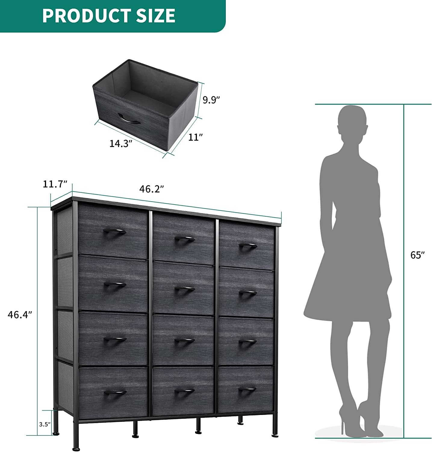 QUALITY CONSTRUCTION – Structured with a powerful metal frame and a durable MDF wooden top; Contains 12 detachable and foldable drawers with easy-to-pull wooden handles; Held up by 4 adjustable plastic legs that prevent scratches to your floor; The innovative crossbar design on the back enhances product stability; The dresser can be secured to a wall with screws. DURABLE FABRIC – The drawer’s front side is constructed with premium cationic polyester fabric; The surrounding sides are covered by breathable, non-woven synthetic fabric; Allows for easy care – simply wipe clean with a damp cloth and let air dry EASY ASSEMBLY – Comes with detailed instructions and installation video for a hassle-free installation; All pieces and accessories are included in the package; Assembly only requires you to fasten a few screws VERSATILE COLOR SCHEME – Highlights a sleek, modern design combining premium charcoal fabric drawers, a sturdy black metal frame, innovative crossbar design on the back, and a wooden tabletop; Perfect for living rooms, bedrooms, hallways, entryways, closets, nurseries, etc.; Fix it to a wall with screws LARGE STORAGE CAPACITY- The Dextrus12-Drawer dresser conveniently organizes your clothes, scarves, socks, T-shirts, pants, sunglasses, books, small toys, etc.; Overall dimensions: 46.4″ L x 11.8″ W x 48.8″ H; Large drawer dimensions: 21.2″ L x 11″ W x 9.9″ H; Small drawer dimensions: 10″ L x 11″ W x 9.9″ H. Fixing the fabric dresser to the wall is well recommended. Please follow the instructions.