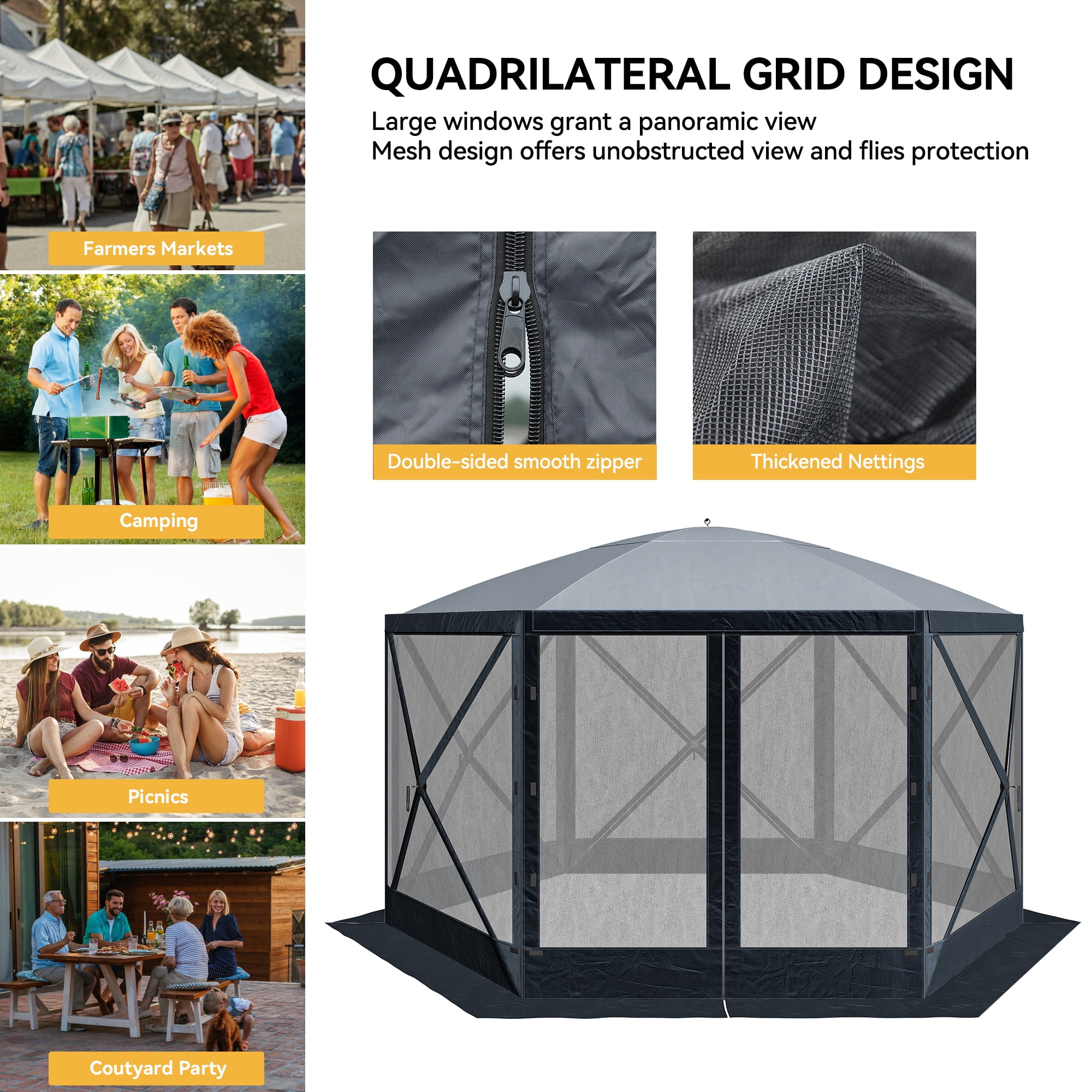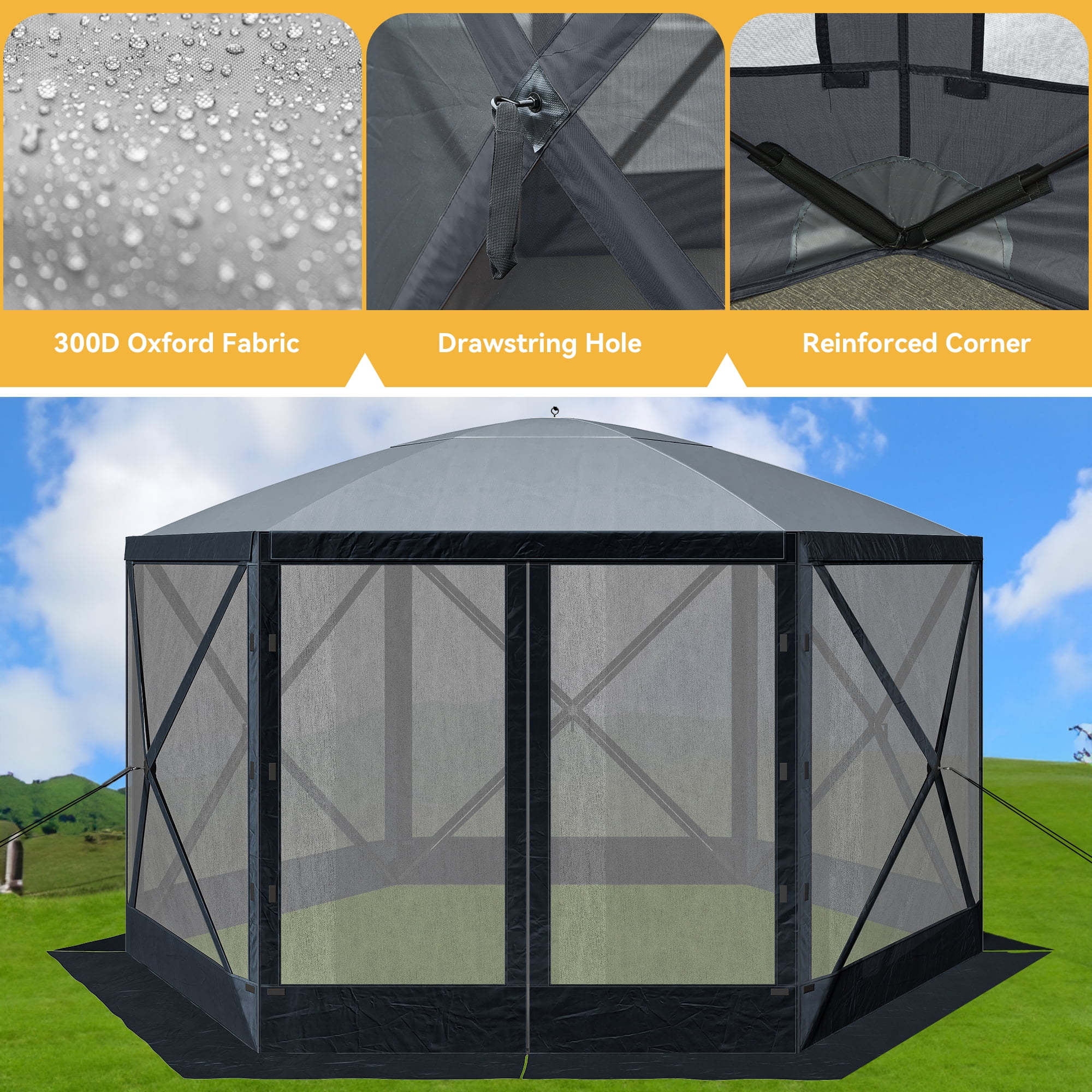 Dextrus 12x12ft Camping Gazebo, Portable Pop Up Canopy Outdoor Screen Tent 6 Sided with Mesh Windows and Carry Bag for Camping, Picnic, Backyard Party Outside Activities, Gray