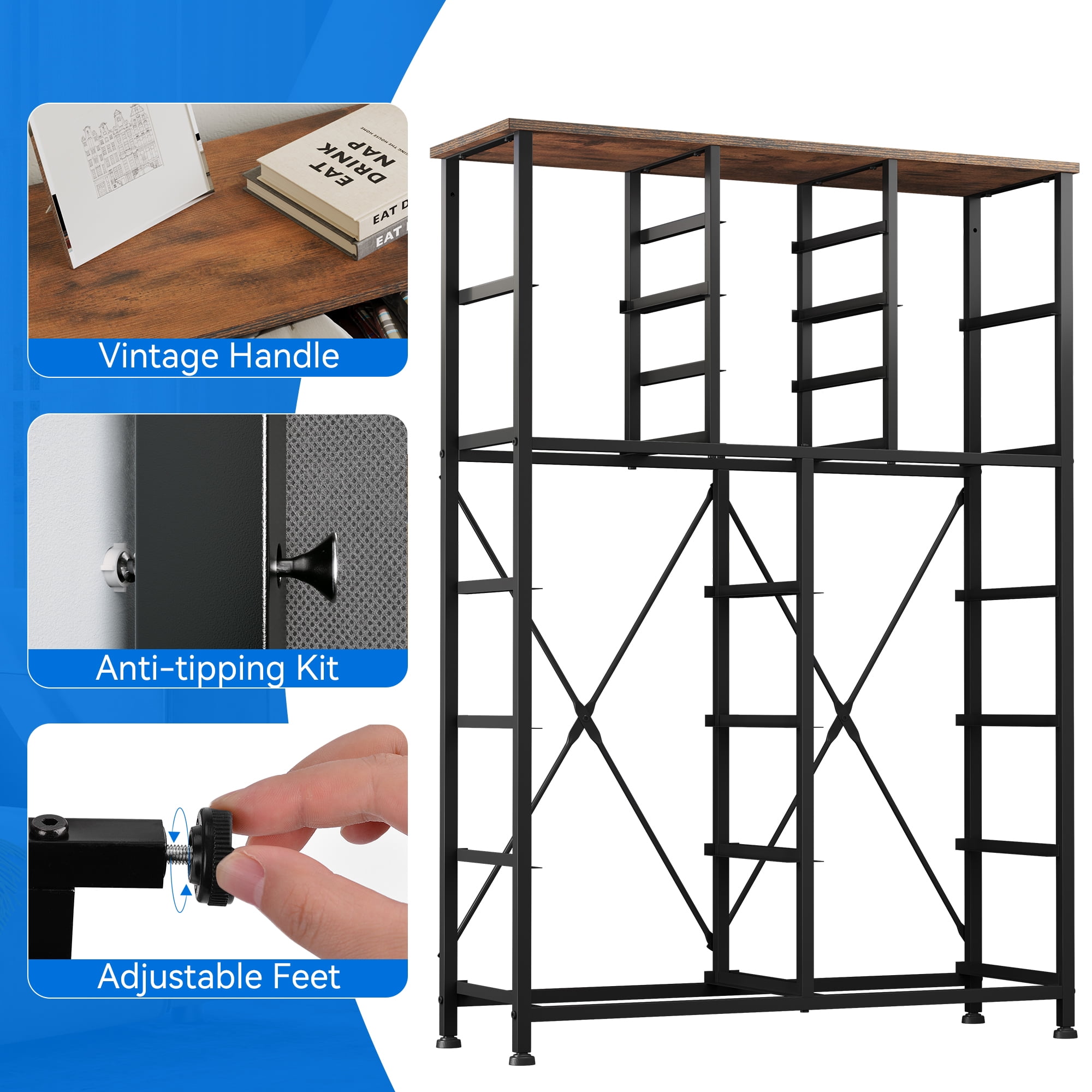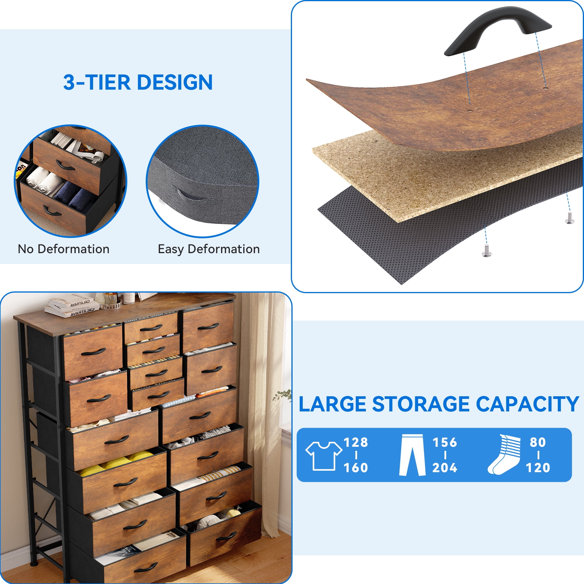 MULTIFUNCTIONAL STORAGE DRESSER – This 16-drawer fabric dresser provides high-capacity storage with a compact design. Works as a dresser, entryway table, bedside table, or sofa table, ideal for bedrooms, closets, offices, and more. 3 DRAWER SIZES FOR VERSATILE STORAGE – Features 4 small, 4 medium, and 8 large drawers to neatly organize clothes, accessories, linens, and other essentials. A great fit for both personal and shared spaces. STURDY DESIGN WITH DOUBLE SUPPORT – Built with a strong metal frame, MDF wood top, and double “X” support bars for extra strength. Includes 4 adjustable legs to prevent floor scratches and keep the unit level on uneven surfaces. USER-FRIENDLY FEATURES – Smooth pull handles provide easy access to drawers. The wide tabletop offers space for lamps, decor, or plants. Non-woven fabric drawers are easy to clean and maintain. SAFE & EASY TO ASSEMBLE – Measures 57.1″ H x 37.4″ L x 11.8″ D. Includes detailed instructions and all parts for quick assembly. Wall-anchoring is recommended for added safety. AGE GROUP – Suitable for adults.