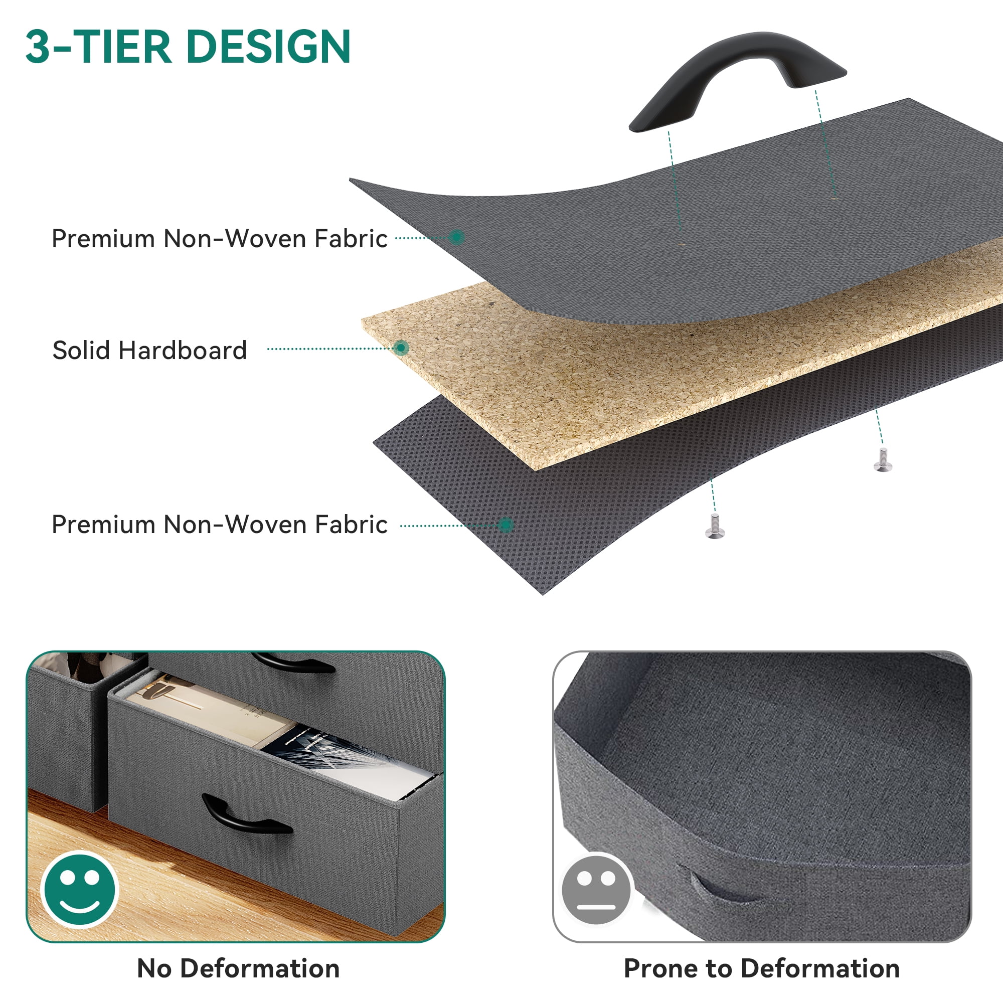 Multi-Functional Dresser: This 16-drawer dresser is designed to maximize storage while maintaining a compact footprint. It functions as an entryway table, bedside table, sofa table, or dresser. Perfect for organizing any room, including bedrooms, living rooms, hallways, offices, closets, and more. Suitable for adults, teens, and kids. Three Drawer Types for Versatile Storage: The tall fabric dresser features 3 different drawer sizes—4 small, 4 medium, and 8 large drawers—to meet diverse storage needs. Ideal for organizing underwear, socks, accessories, scarves, pants, sweaters, and bedding in one convenient place. Enhanced Stability with Double “X” Support: Built with a durable metal frame, a premium MDF wooden top, and a double X-shaped support bar on the back, providing excellent structural stability. 4 adjustable plastic legs prevent scratches and maintain balance on uneven surfaces. User-Friendly Design: A spacious wooden tabletop allows additional storage and display for items like lamps, plants, and photo frames. Smooth easy-pull handles offer a comfortable grip for effortless drawer operation. The non-woven fabric drawers are easy to clean and maintain. Safe & Easy Assembly: Overall Dimensions: 57.1″H x 37.4″L x 11.8″D. Drawer Sizes: Small: 11.4″L x 10.8″D x 4.3″H, Medium: 11.4″L x 10.8″D x 8.7″H, Large: 17.5″L x 10.8″D x 8.6″H. Simple assembly with detailed instructions included. For safety, it is recommended to anchor the dresser to the wall to prevent tipping.