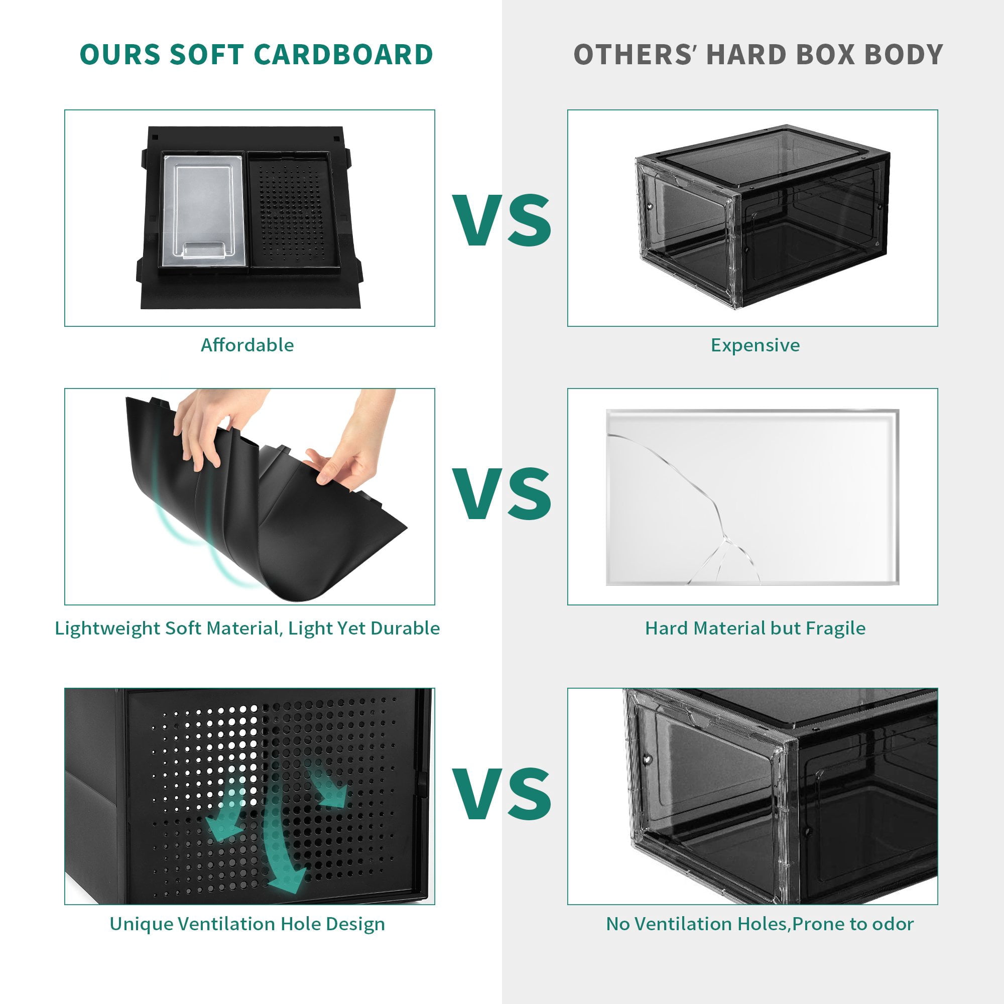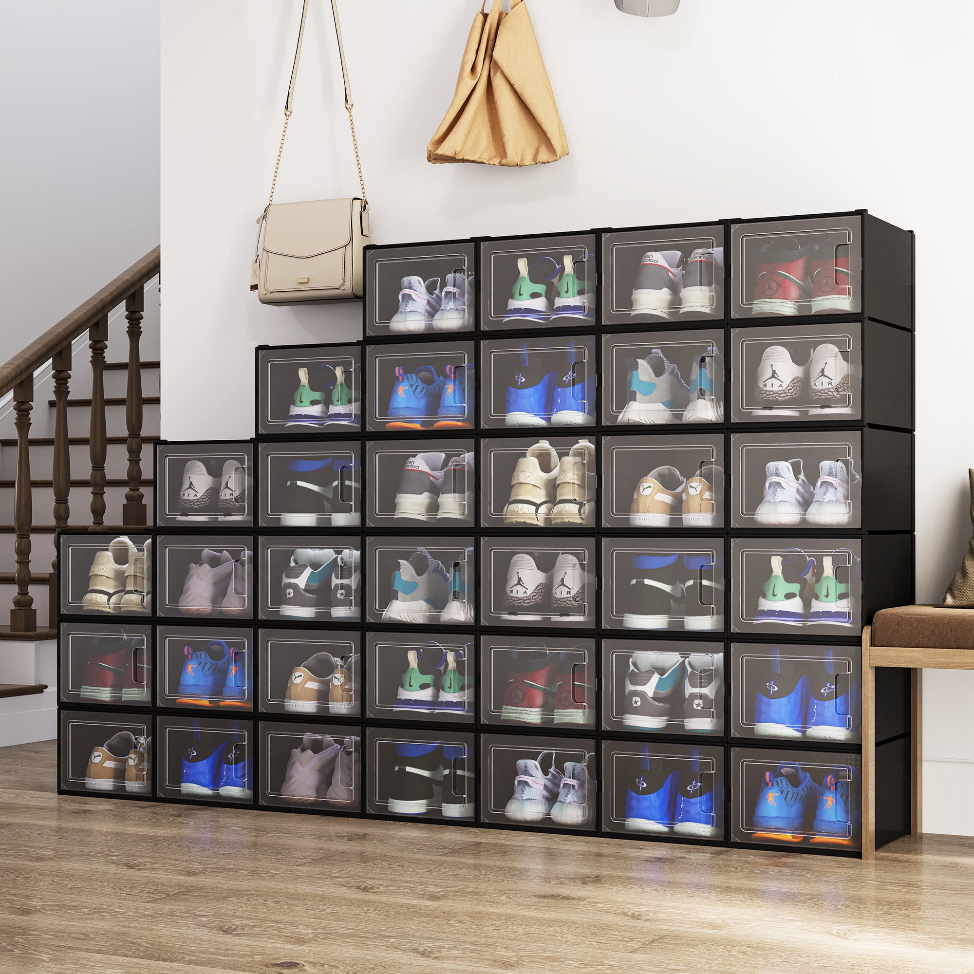 Easy Access: The stackable shoe boxes are equipped with a clear drawer allowing you to easily find the shoes you want without having to unstack any boxes. The boxes are also ventilated to prevent any odor, moisture, or mold buildup. Easy to Stack: The top and bottom edges of shoe boxes stack on top of each other seamlessly. Easily store your shoes anywhere. The top and bottom edges of shoe boxes stack perfectly onto one another for maximum stability. Eco-Friendly: The environmentally friendly and durable resin panels and ABS material are waterproof and easy to clean. The shoeboxes are designed to provide ventilation while also preventing dust from getting in. Ventilation: The boxes are ventilated to provide air circulation preventing odor, moisture, and mold buildup. Excellent Durability: High-quality ABS plastic and a sturdy design give shoe boxes an advantage in durability over other products. Keep your shoes clean and organized for longer! Space-saving: Great for saving closet space! Keep a set of stackable shoe boxes in your closet to keep it clean and neat! High-quality: Made of clear ABS plastic which allows you to easily find what you are looking for. Multifunctional: You can store much more than shoes! stackable organizers are great for cosmetics, clothing, electronics, stationery, books, and more.