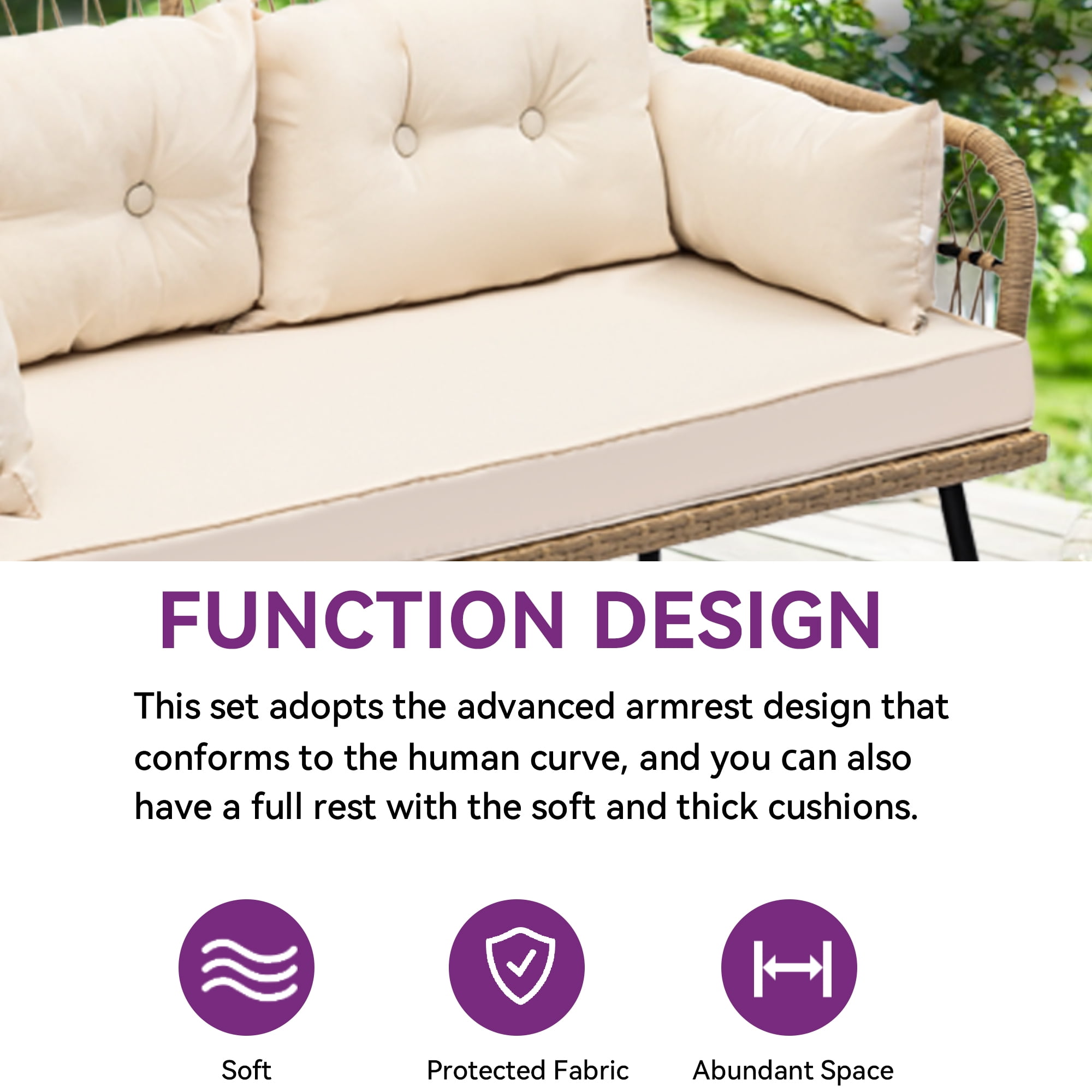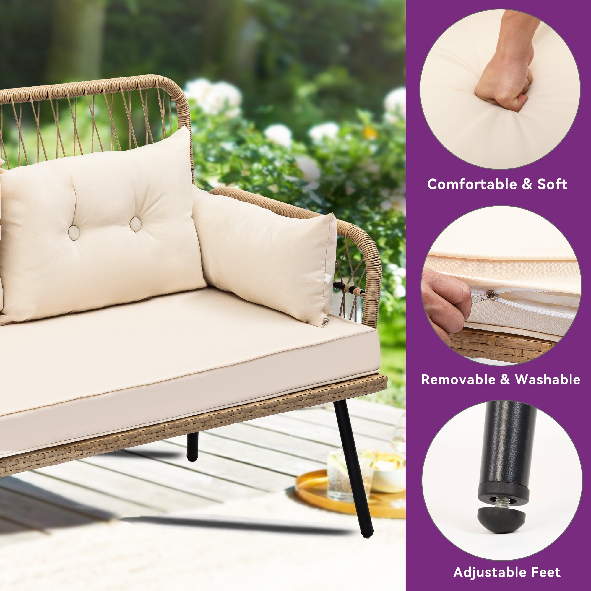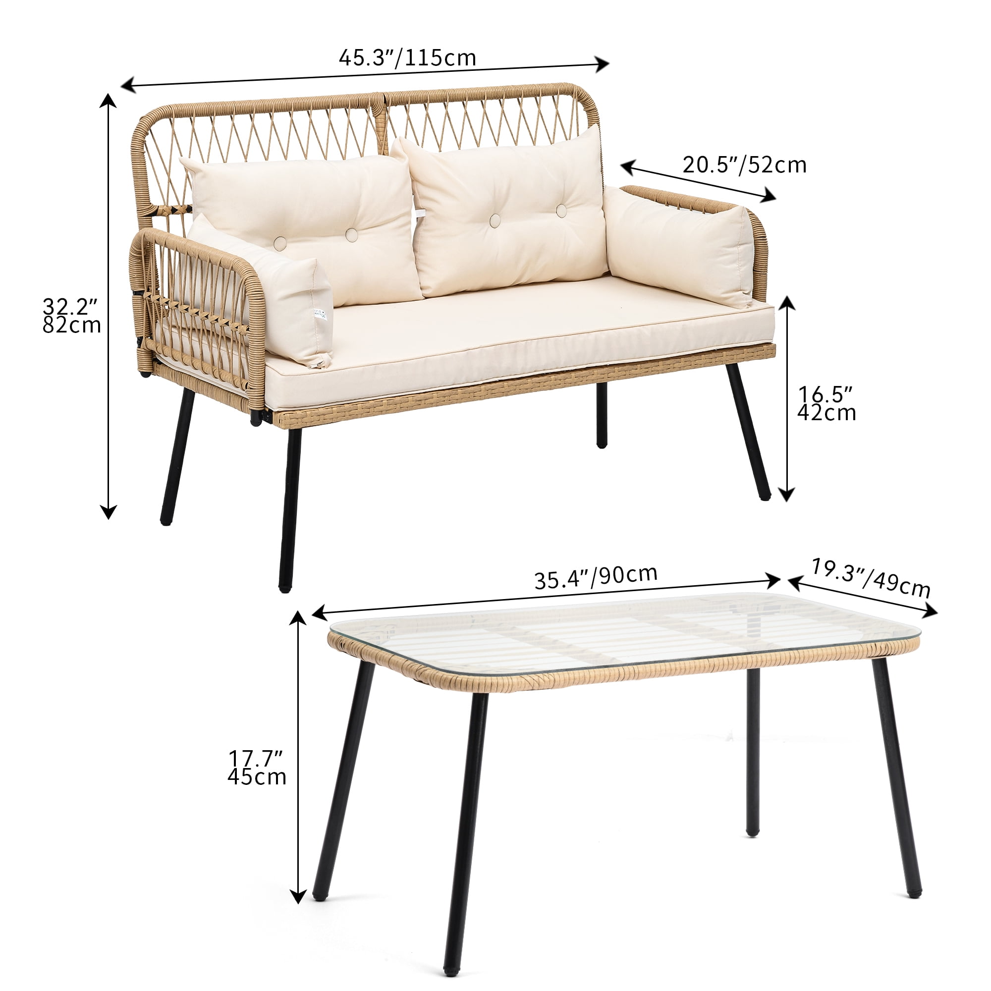 Dextrus 2-Piece Wicker Outdoor Patio Dining Set, Light Brown/Beige Luxurious Seating: Elevate your outdoor relaxation with this stylish patio loveseat Generous seating area and plush cushions provide a cozy space for quality time with loved ones or peaceful moments alone Detachable cushion covers make maintenance a breeze Sleek Side Table: Enhance your outdoor lounging experience with the sleek side table featuring a sturdy yet elegant metal frame and a tempered glass top Perfect for holding snacks, beverages, or decorative items up to 75lbs Robust & Durable: Crafted with premium handwoven rattan and reinforced with a durable steel frame, this patio furniture set is built to withstand the elements Enjoy years of comfort and style with minimal maintenance required Dimensions: Includes one coffee table measuring 354″ x 193″ x 177″ (LxWxH) and one loveseat chair measuring 453″ x 205″ x 322″ (LxWxH) Total weight capacity is 75 pounds Effortless Assembly: Assembly is quick and hassle-free with comprehensive instructions and all necessary parts included Our dedicated pre- and after-sales services guarantee a hassle-free experience from start to finish