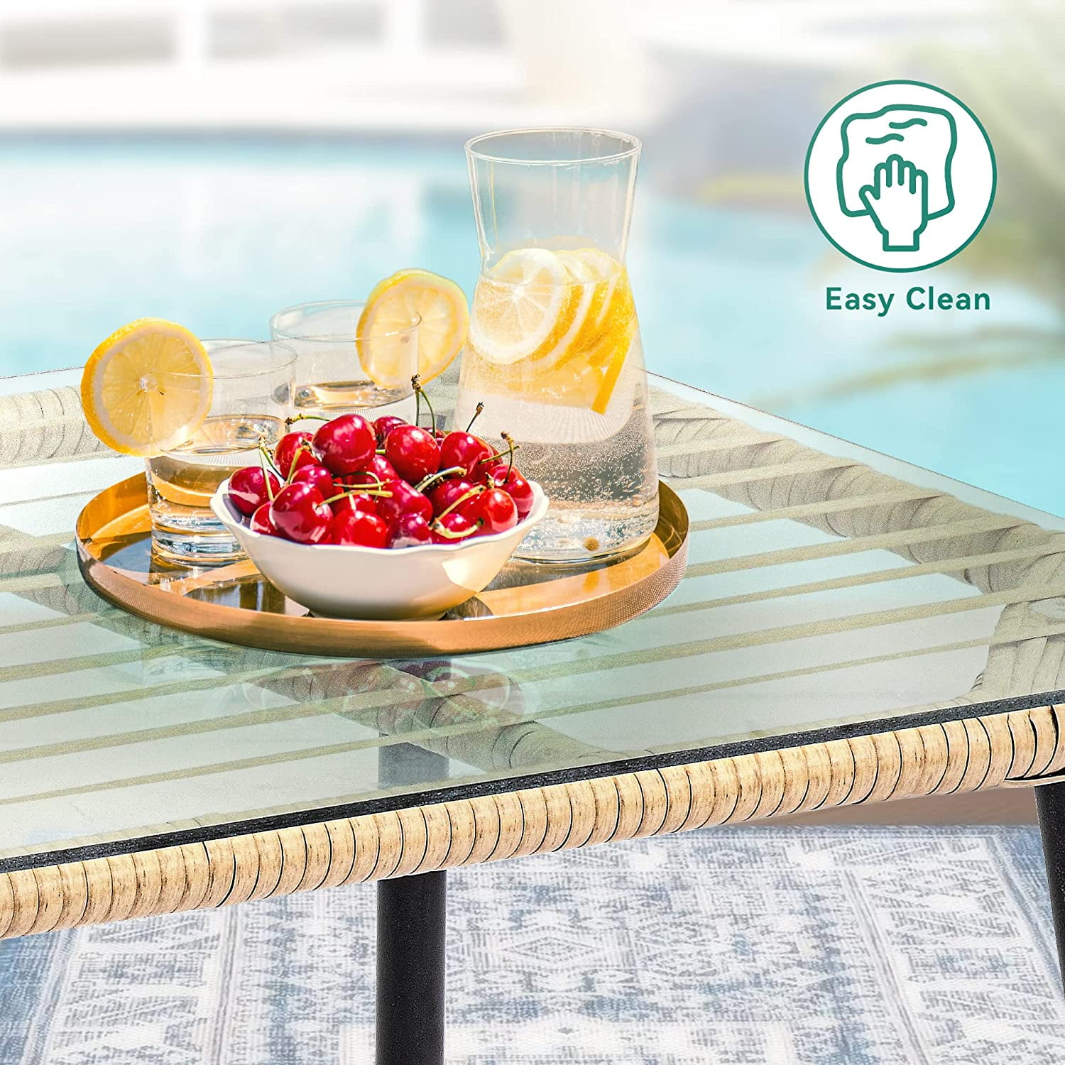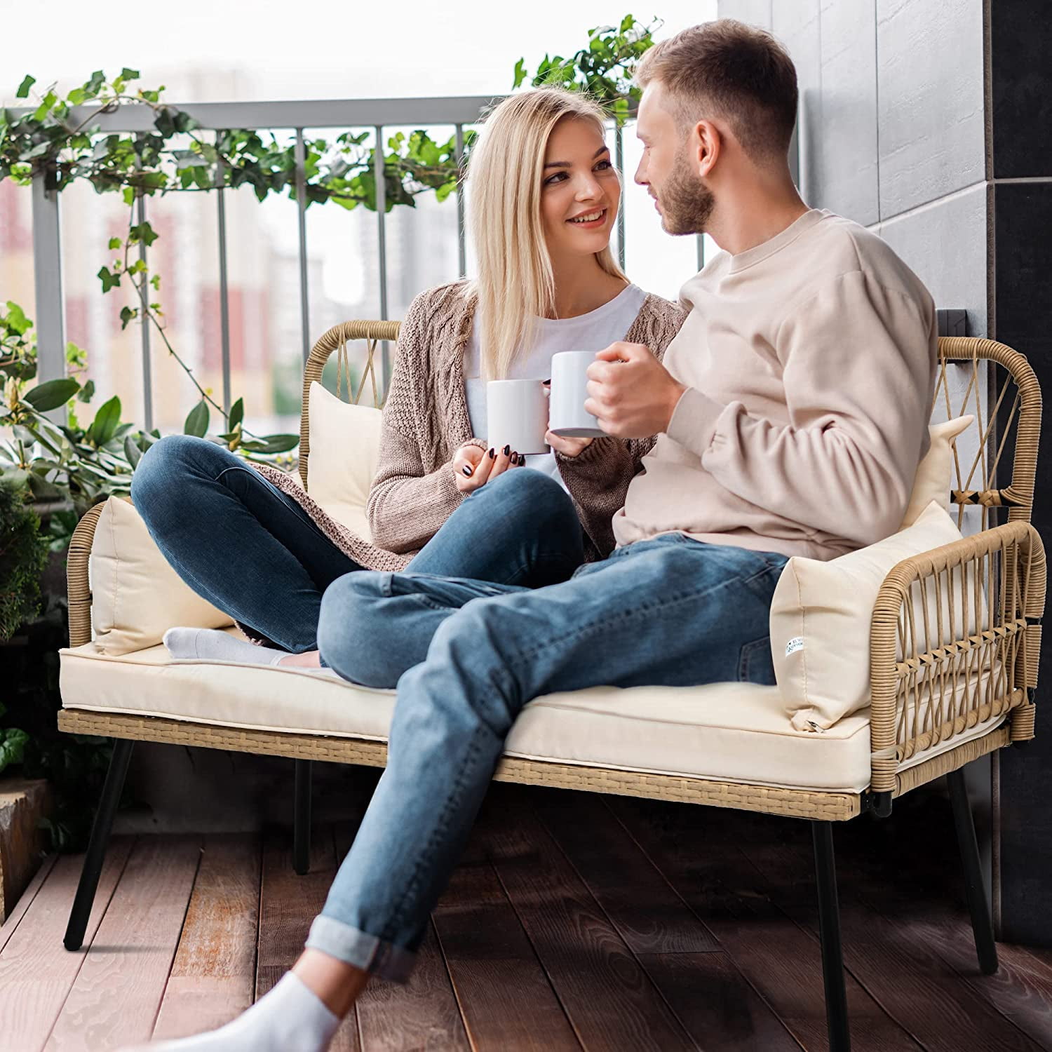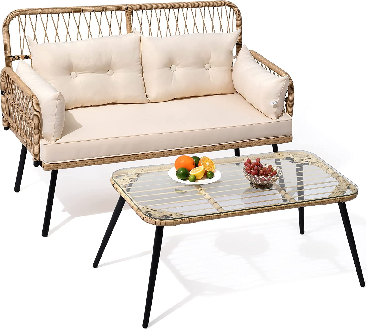 COMFORTABLE SEAT: Looking to experience outdoor leisure in style and comfort? This patio loveseat fits the bill; Ample seat space with thick cushions allows cozy parent-child time, as well as great snuggling with your pet; Cushion cover is detachable for easy maintenance GLASS SIDE TABLE: The patio loveseat features an elegant side table that features a transparent tempered glass top that gleams and provides sturdy support for foods, drinks, or other items within 75lbs. STURDY & DURABLE: High-end handwoven rattan is braced with a solid steel frame for weather resistance and enduring durability; Wide seat space, comfy cushions, and a detachable waterproof cover combine to bestow deluxe comfort & easy maintenance SPECIFICATIONS: Comes 1 coffee table measuring 35.4″(L)x 19.3″(W) x17.7″(H), and 1 loveseat chair is sized 45.3″L x 20.5″W x 32.2″H ; Total weight is 47.4 pounds EASY ASSEMBLY & RELIABLE SERVICE: Convenient assembly only takes a few minutes by following the instructions with all parts included; Our excellent pre- and after-sales services are always available to ensure your purchase is hassle-free
