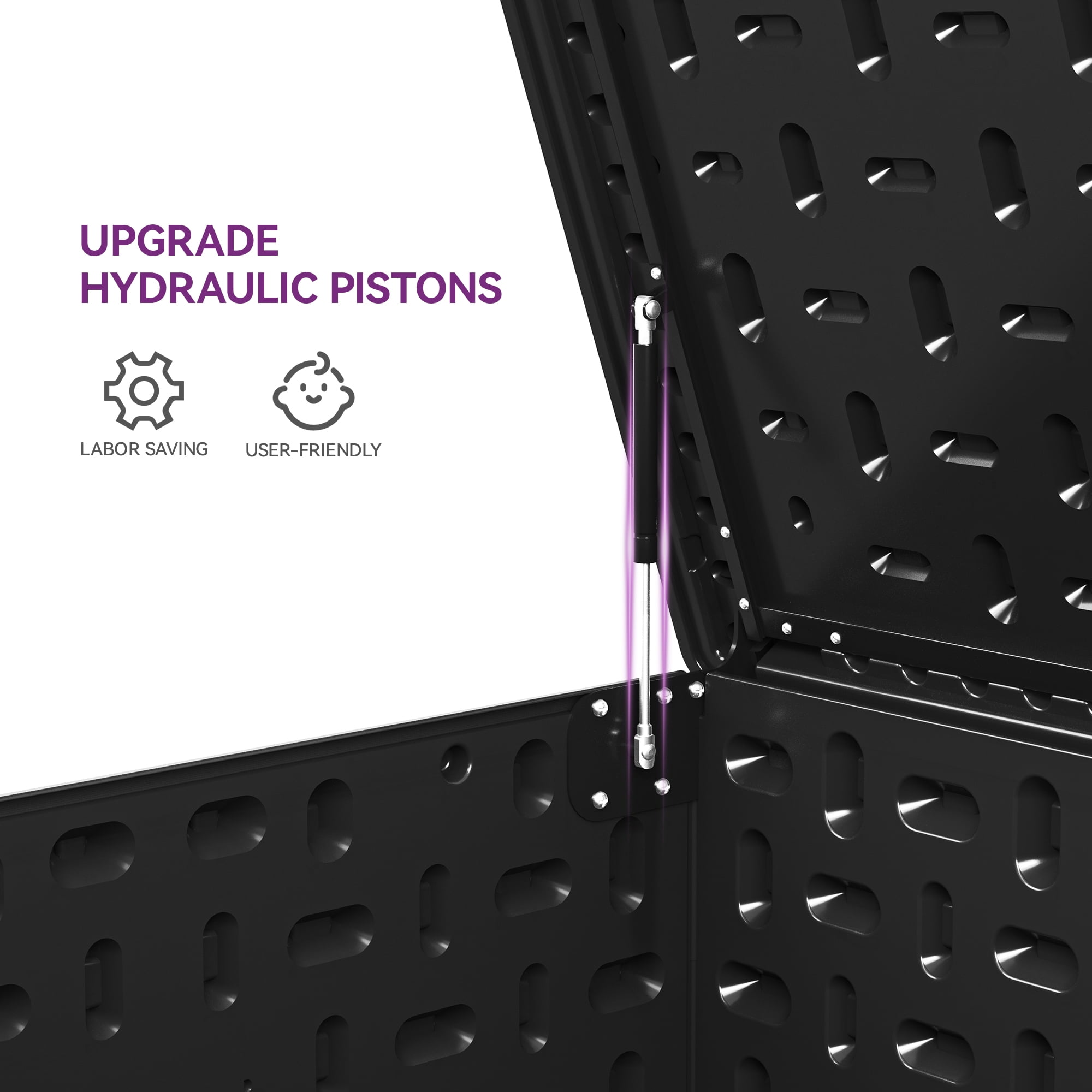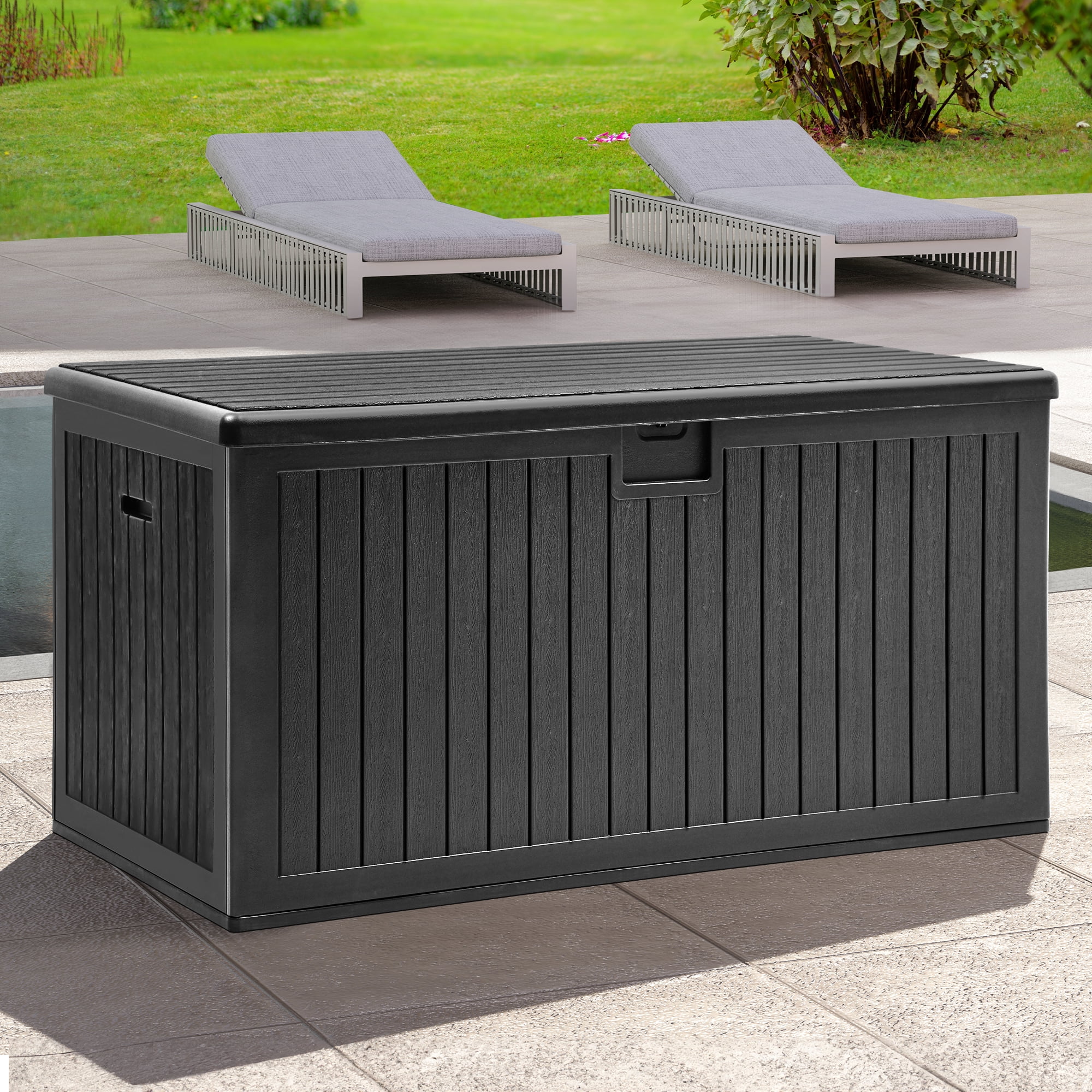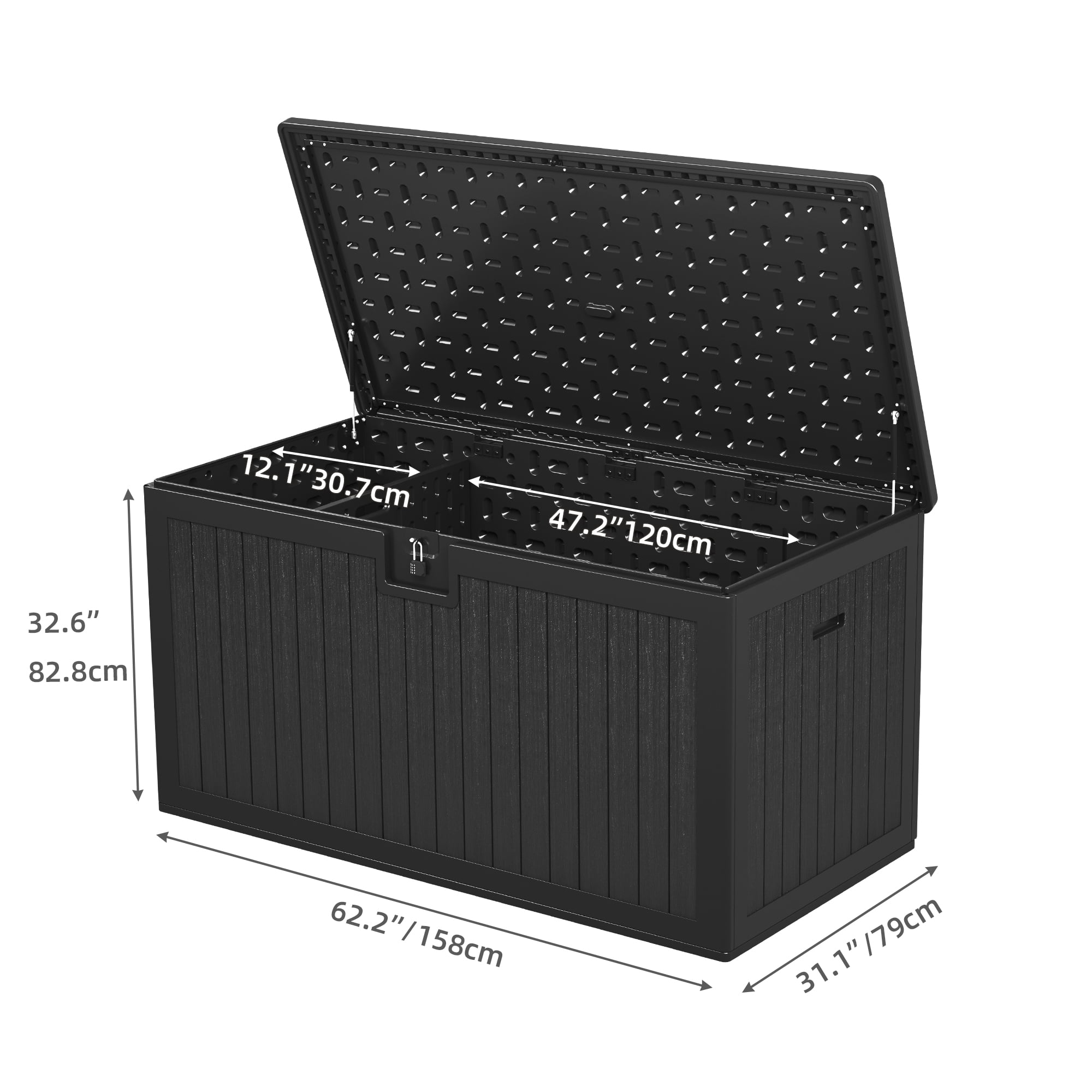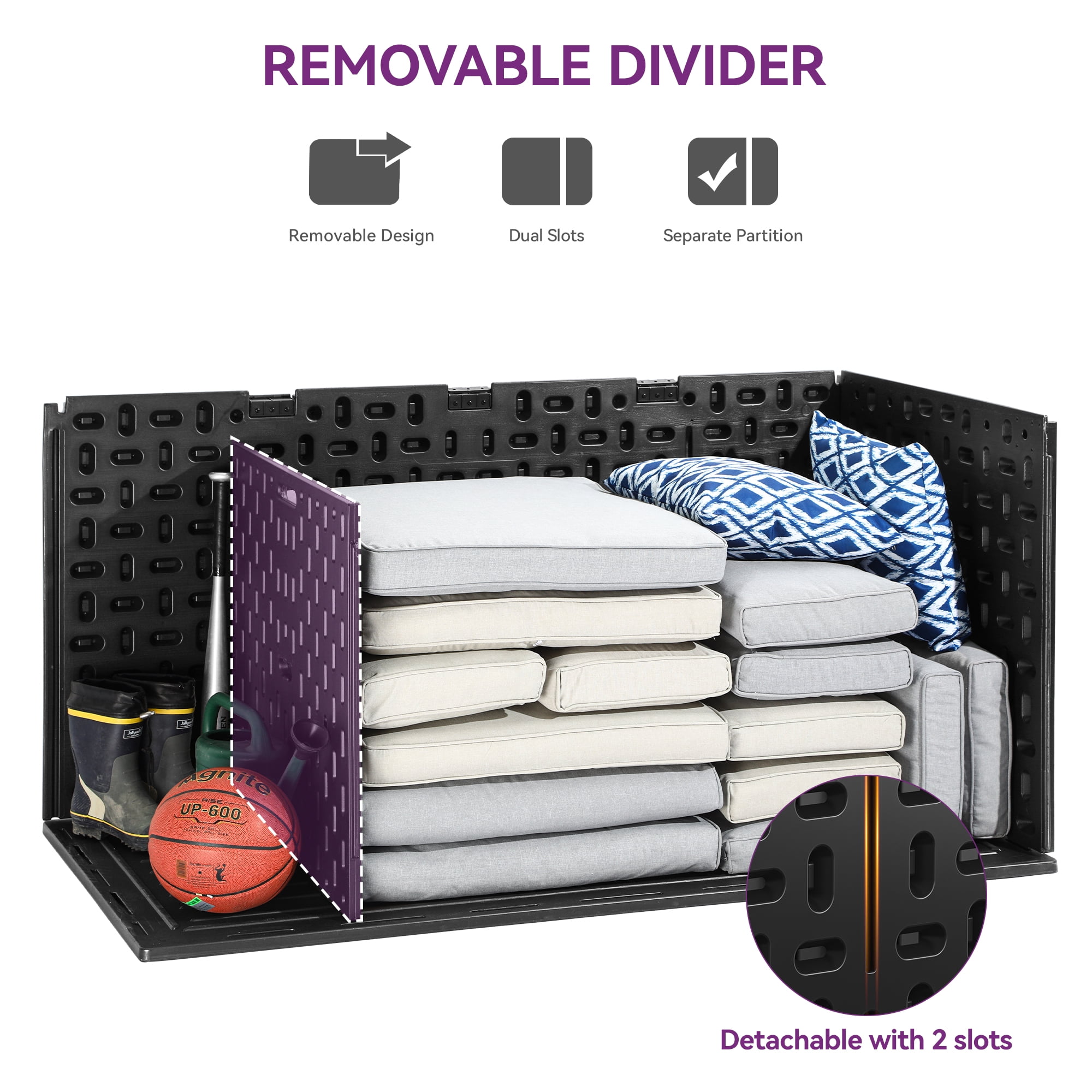 Upgraded Structural Design: This deck box features a built-in divider with two adjustable slots, allowing for flexible position adjustment. Use the divider to separate partitions for efficient classification or detach it to create extra storage space. Immense Storage Capacity: With a generous 230-gallon capacity, this XXL-sized deck box provides ample room for indoor and outdoor storage. Its dimensions of 62.2″L x 31.1″W x 32.6″H make it perfect for storing cushions, toys, tools, and more. Easy Assembly: The improved slide connections simplify the assembly process. Easily align the positions of the four panels and slide them into each other. While two people are recommended due to the large size, assembly is made easier and more convenient. Double-Wall Construction: Crafted from all-weather guard resin, this deck box is rustproof, corrosion-resistant, and maintenance-free. The double-wall construction enhances sturdiness and durability, while the wooden texture adds a touch of elegance to any decor.