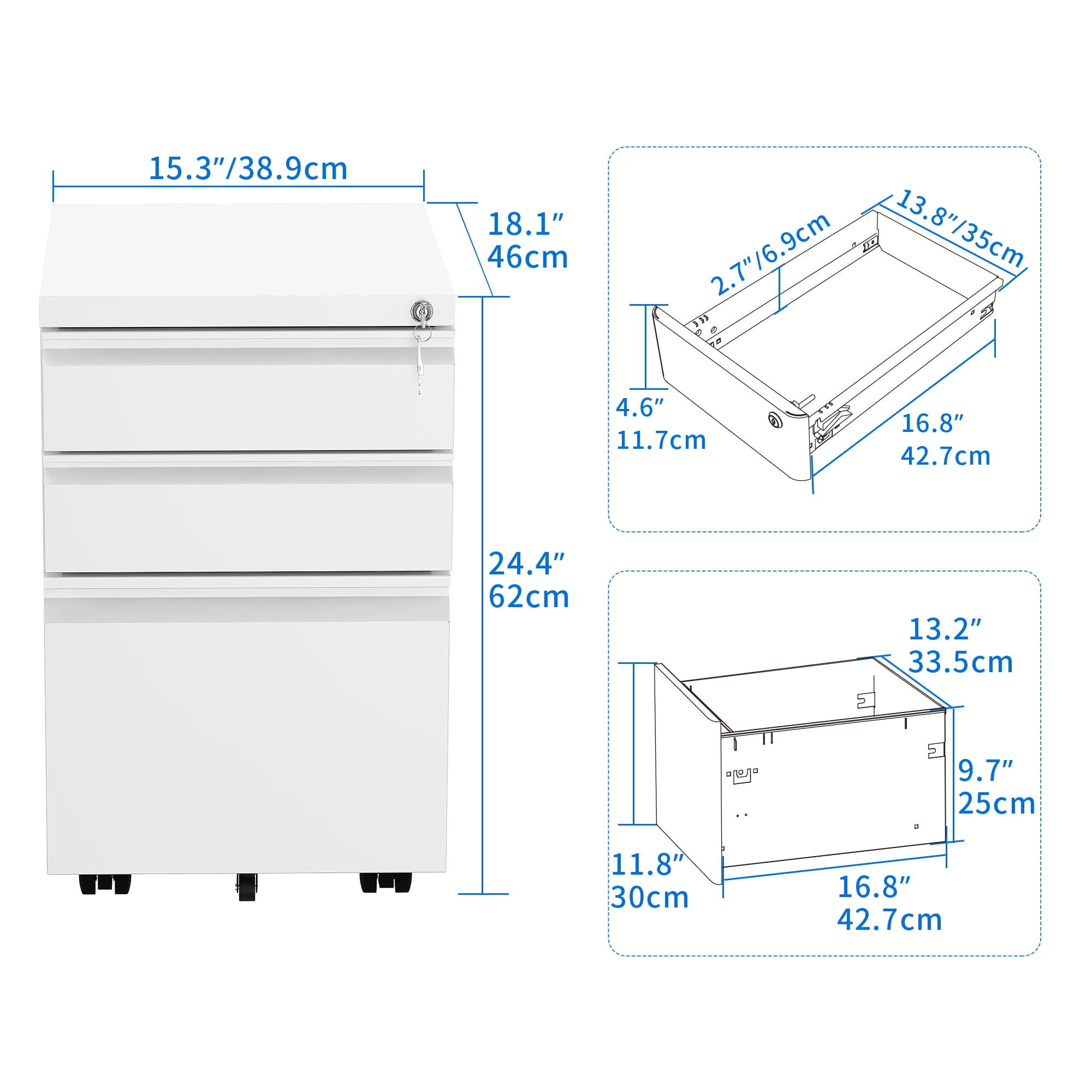 Maximize your office organization with the Dextrus Fully Assembled 3-Drawer Lockable File Cabinet, featuring ample storage capacity for file folders, snacks, cosmetics, and office supplies. Constructed from durable steel, this file cabinet is built to last, ensuring long-term use and allowing you to place a printer on top without worrying about dents or damage. The lockable design secures all drawers, providing peace of mind, and two keys are included for easy access. Designed with mobility in mind, this rolling file cabinet features two lockable casters, two 360° swivel casters, and an anti-tipping central caster for optimal mobility and stability. Enjoy hassle-free setup with the fully assembled file cabinet, and the waterproof surface can be easily cleaned with a damp cloth, ensuring long-lasting cleanliness.