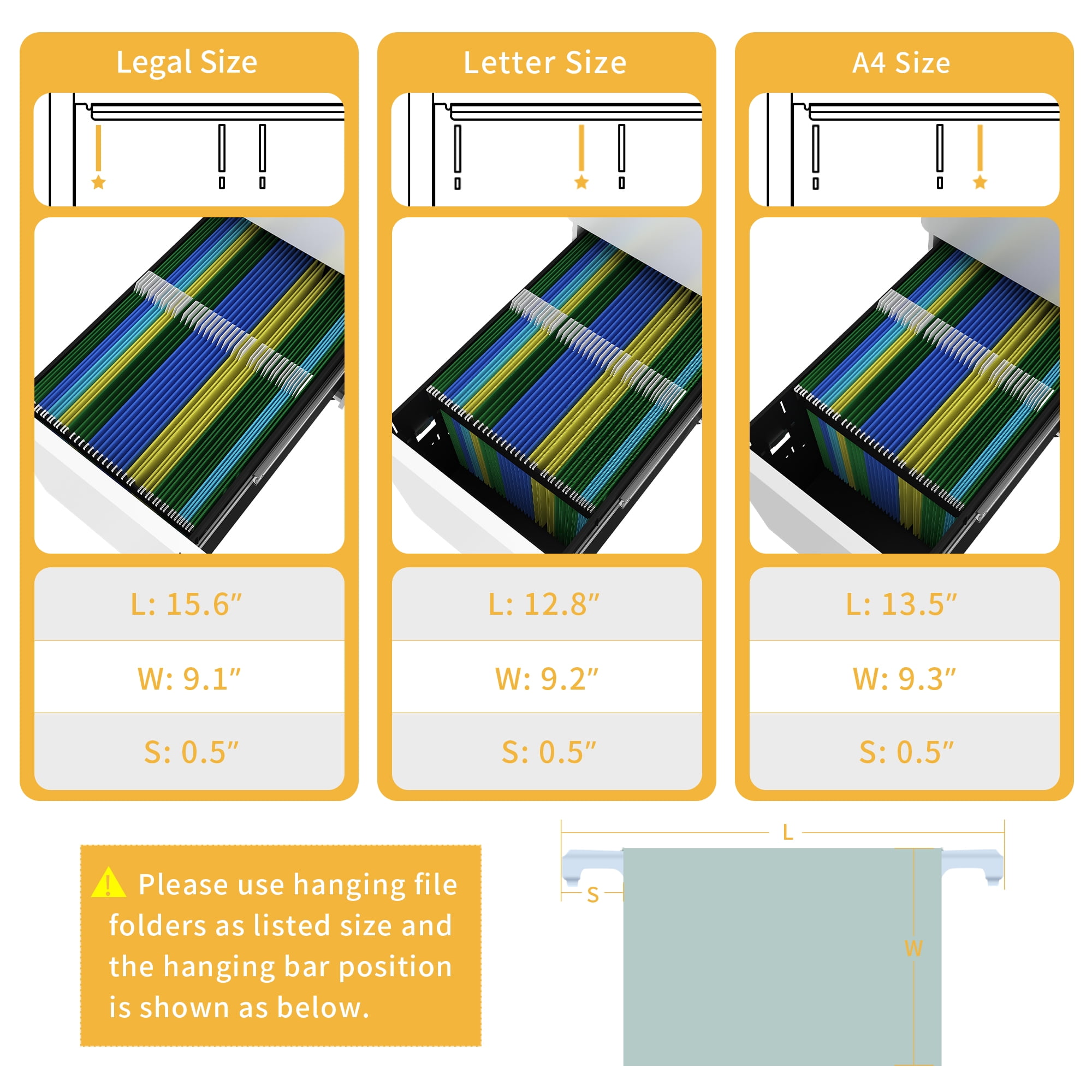 Foolproof Locking Mechanism — The interlock system secures 3 drawers and comes with two keys to protect your files and valuables. As a safety mechanism to avoid tipping, only 1 drawer can be opened at a time. Free-range Mobility with 5 Casters — 4 x swivel casters + 1x anti-tipping central caster. Easy and safe to move! 360° swivel casters provide great mobility to go any direction smoothly with little effort! Premium Drawers — The top drawer contains a removable pencil tray, and the bottom drawer features a removable hanging file bar that accommodates letter, legal, and A4 size documents. Guaranteed to keep you organized. Durable & Sturdy — The entire cabinet, including the inner lining of all drawers, is built using robust, heavy-duty steel with environmentally friendly finish for long-lasting durability. It is sturdy enough to put printer on it without any dents. Smooth and Silent Sliding Rail — Built-in sliding rail helps you open and close the drawer smoothly with little effort and it didn’t make much noise, which is a great design for office workers to create a quiet environment.