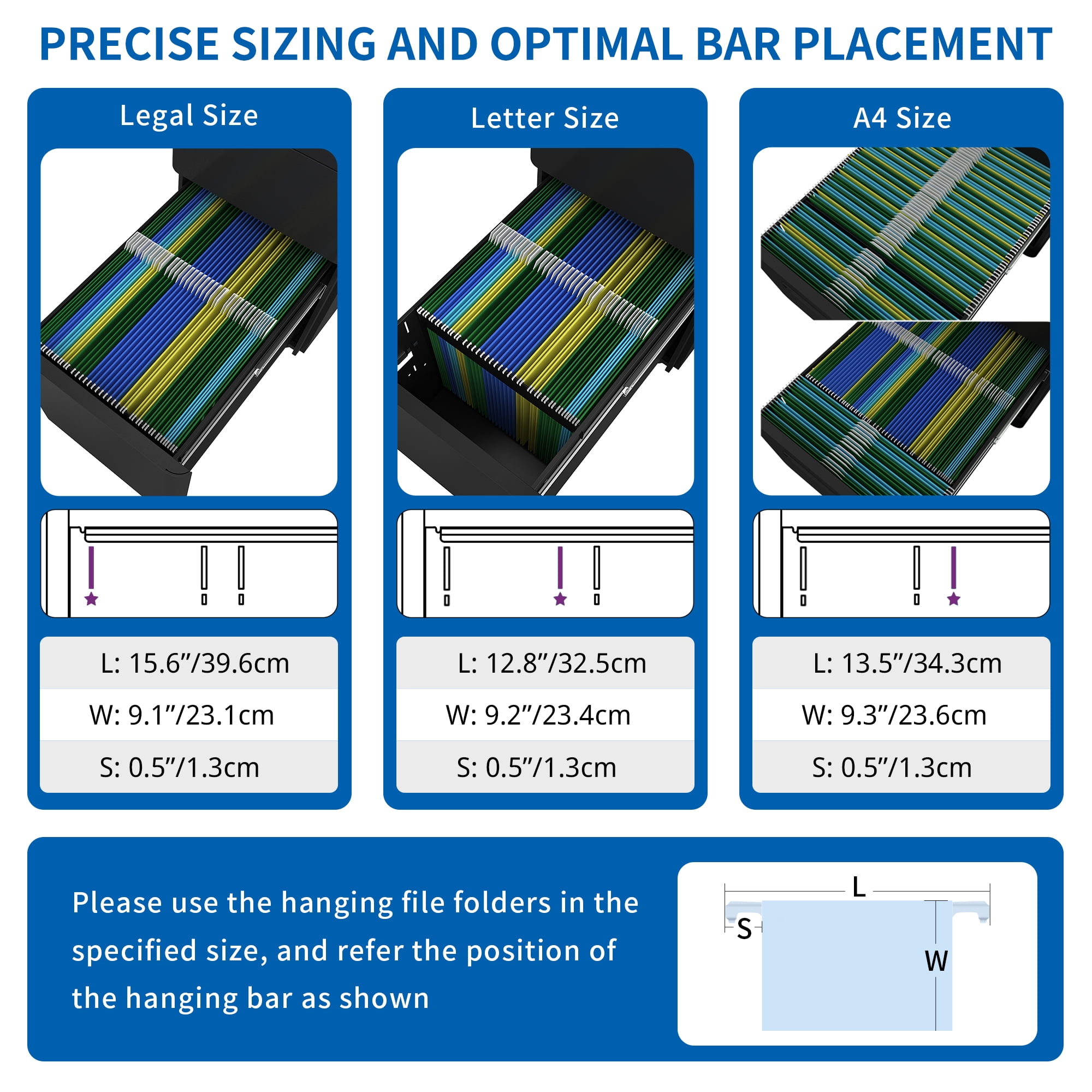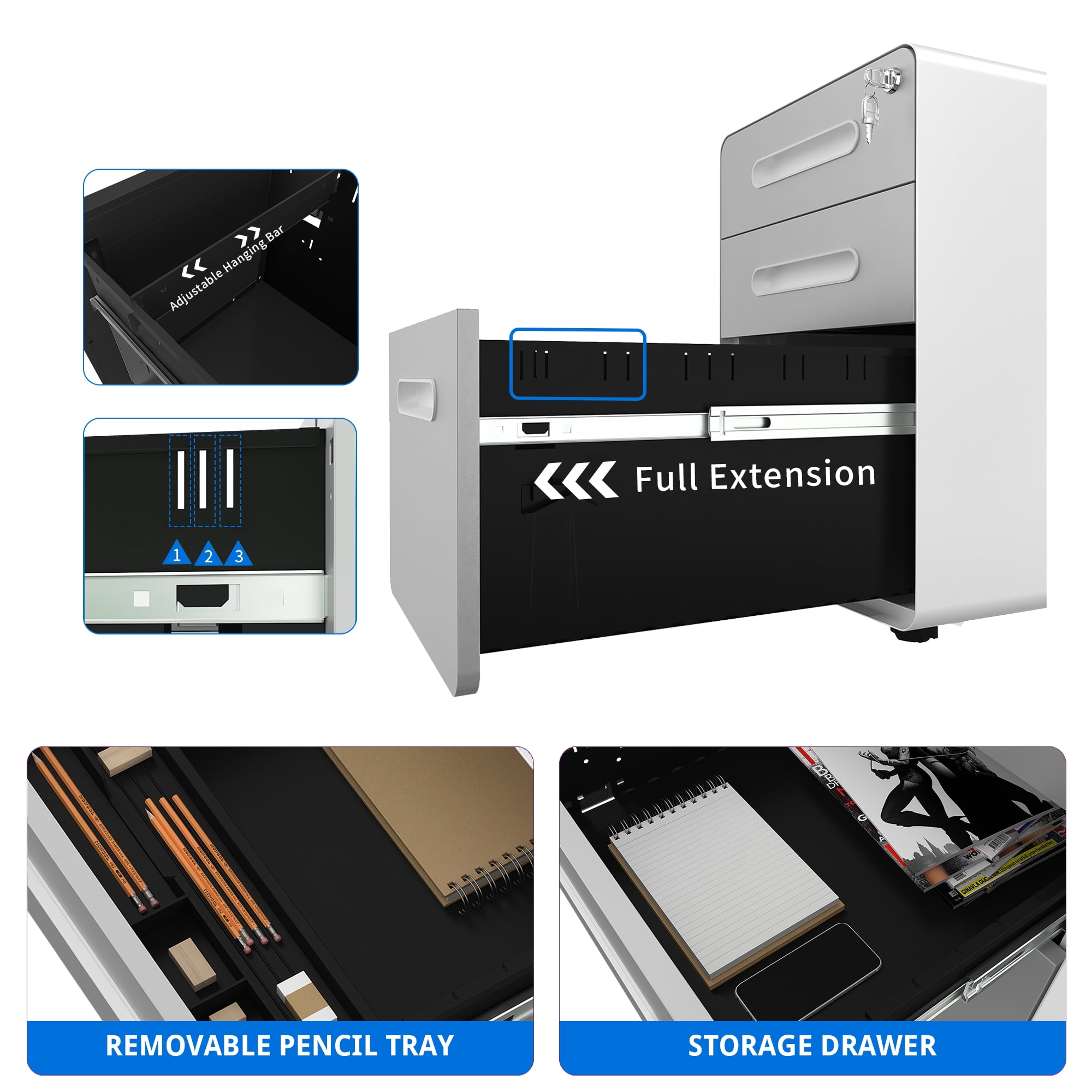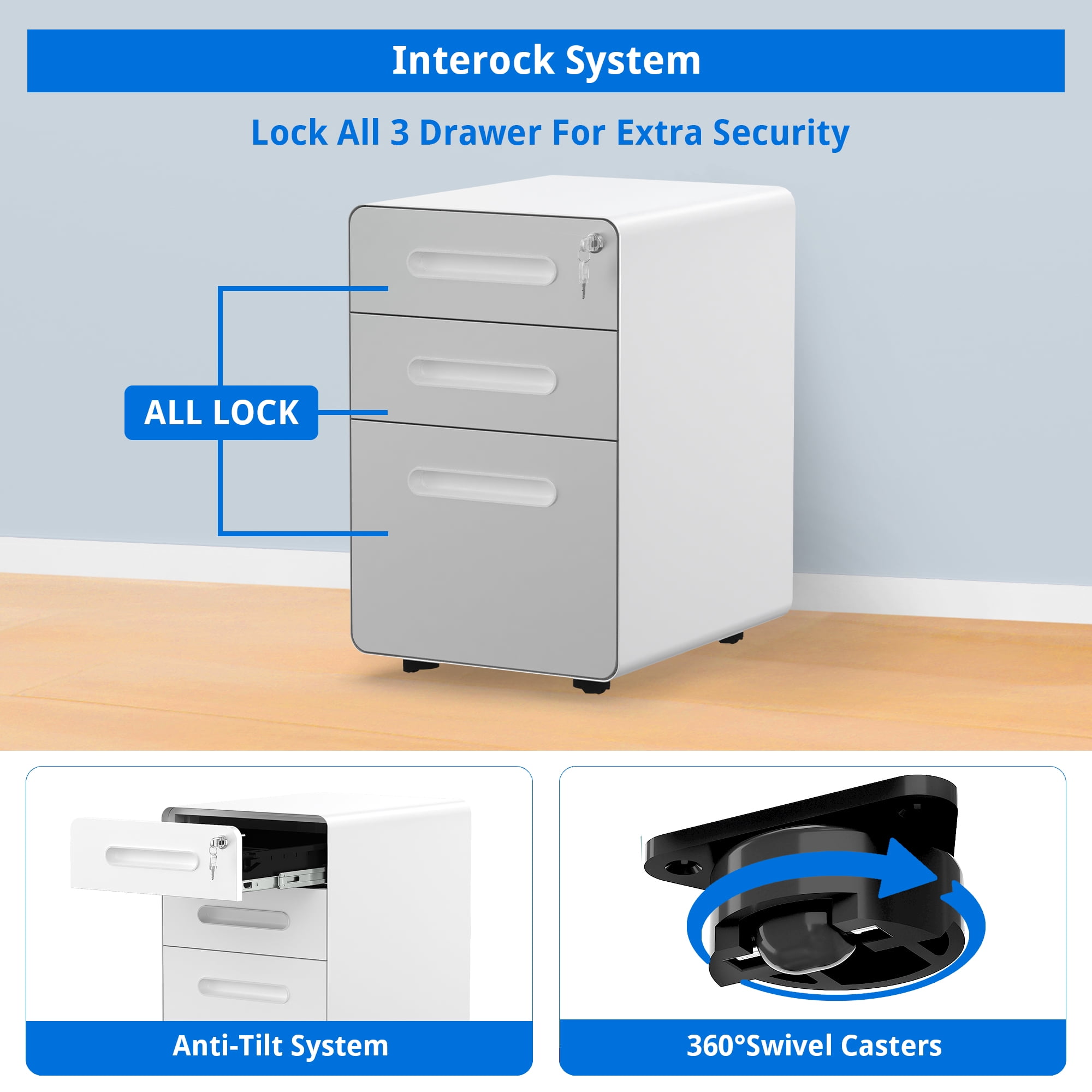 Product Description 3-Drawer Steel Rolling File Cabinet with Keys New Modern Style Contemporary minimalist design will be a great choice for office, conference, home, college, hospital, etc. Top Build Quality & Premium Core Materials We combine High-strength cold-rolled steel plate with Electrostatic phosphorus-free epoxy spray layer that provides impeccable stability and strength, making it very strong and immune to corrosion. Specifications Dimensions: 15″W x 23″H x 19″D Item Weight:55 pounds Compatible File Size: Letter, Legal, A4 Package Includes 1x Rolling File Cabinet 2x Keys 1x Pencil Tray 1x Hanging File Bar Assembly Tools