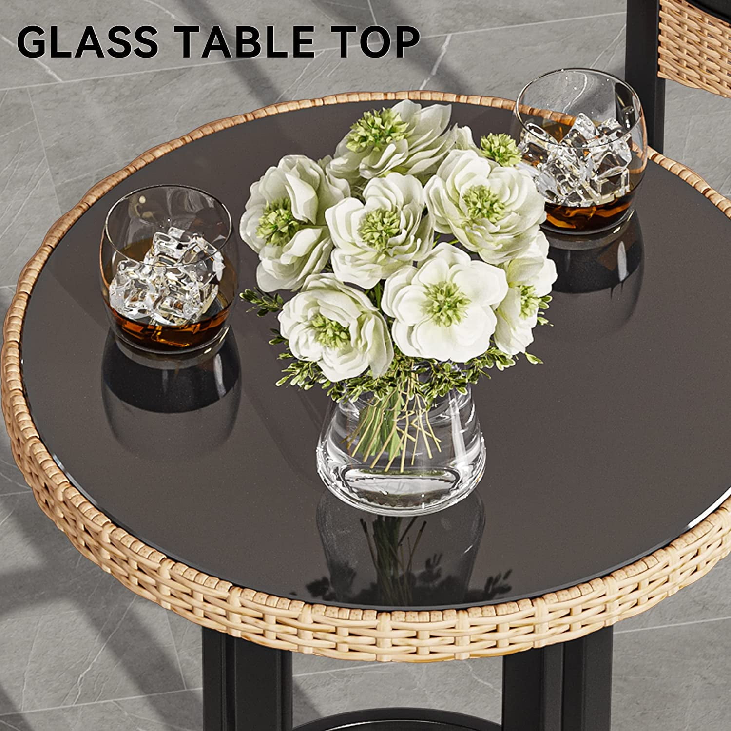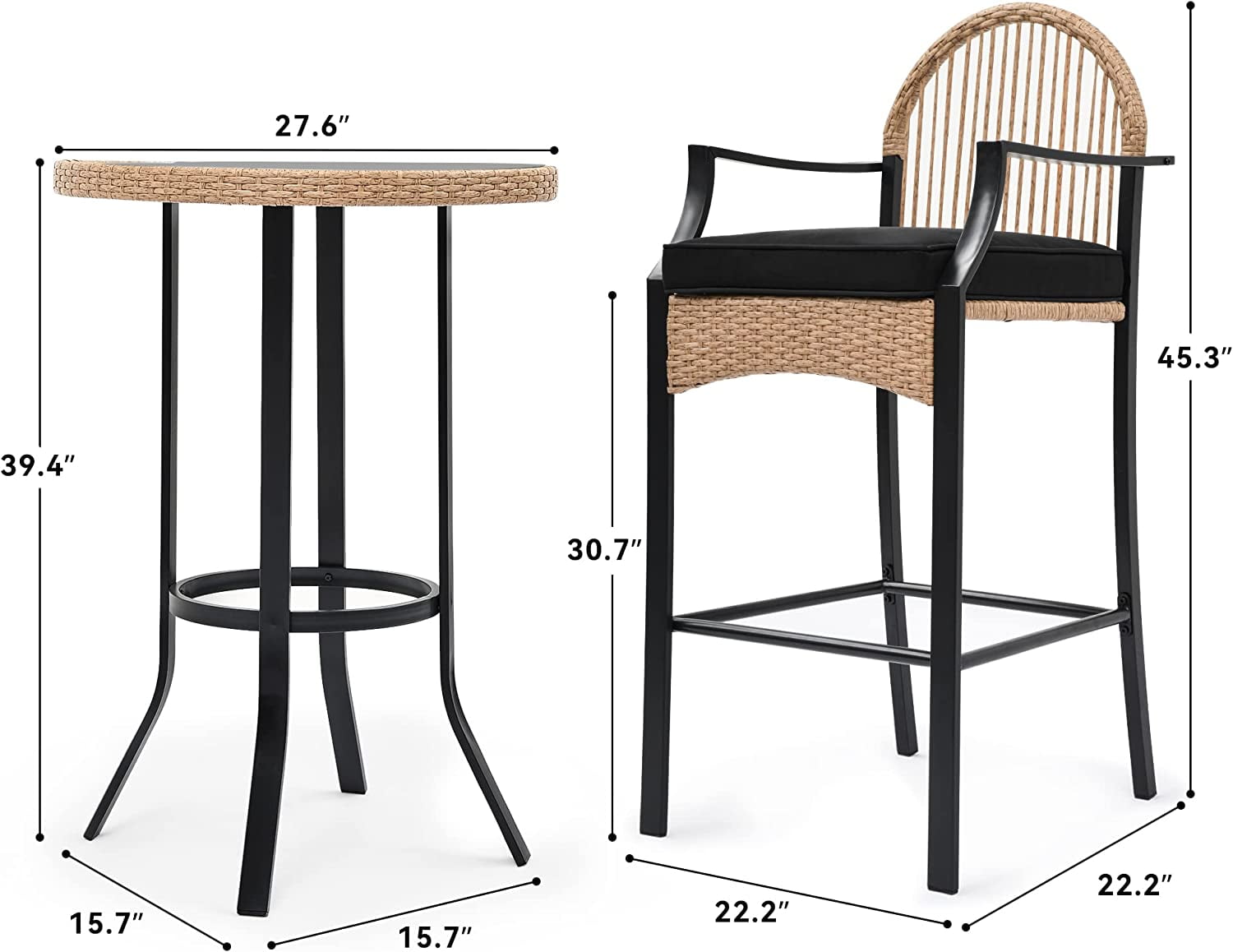 3-Piece Bar Table Set: This bar height bistro furniture is equipped with 2 high chairs and one high table; Enjoy memorable conversations with your friends Stable & Durable: The legs of both high table and high stool are made with steel frame; This bar height set is solid and stable with a loading capacity of 330LB Dimensions: Patio High chair: 22.2”*22.2”*45.3”; Patio High Table: 15.7”*27.6”*39.4”; Total Weight: 64.15 LB Rattan Chair Back: The back of the chair is composed of hand-woven rattan featuring rattan curve that perfectly integrates to bring you immense comfort Tempered Glass Tabletop: Upgrade your dining space with this robust tempered glass tabletop; A stylish and secure option that grants hassle-free dining with an added touch of elegance to your decor