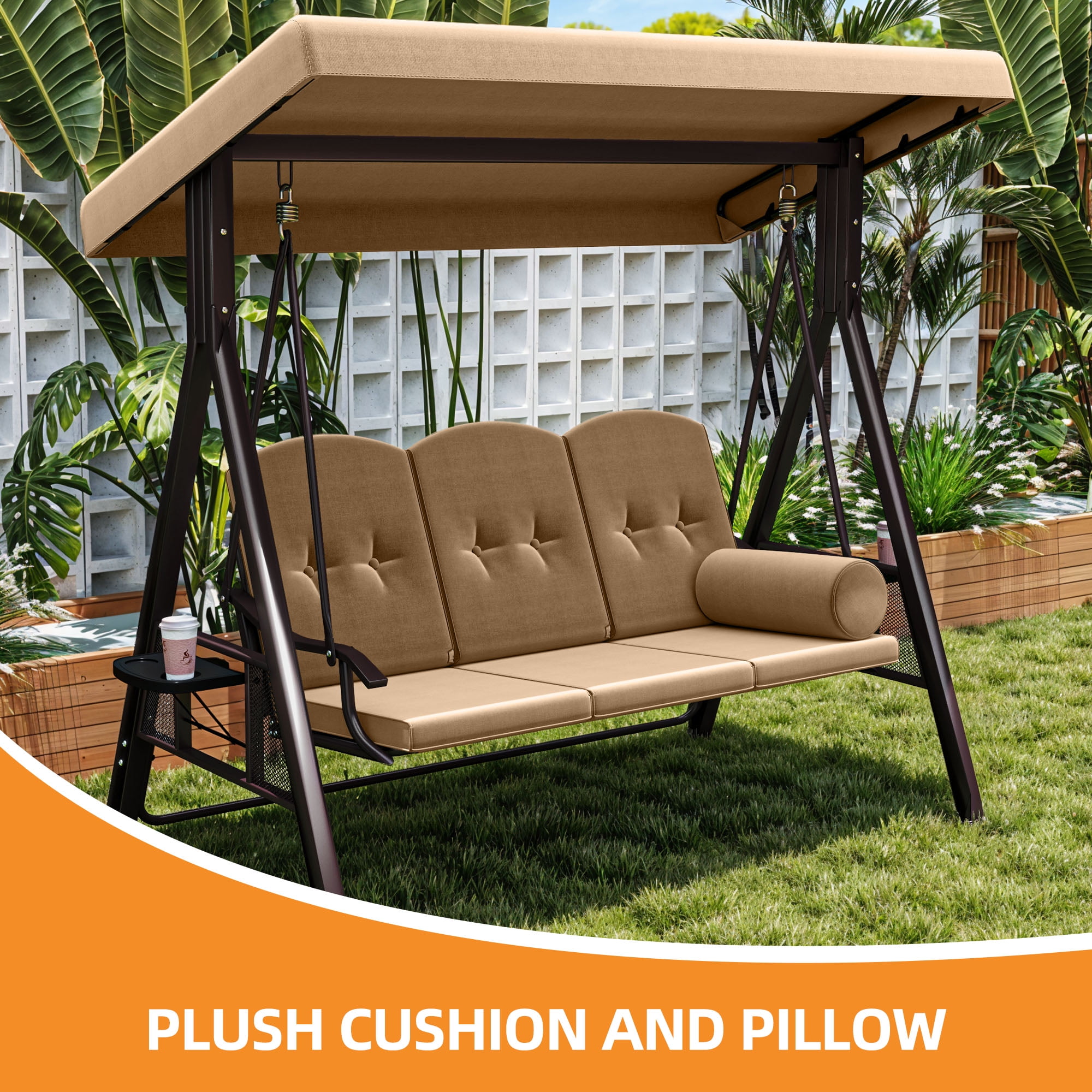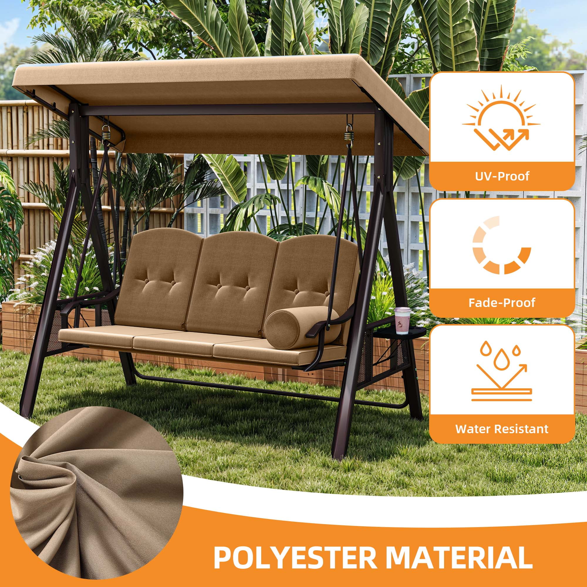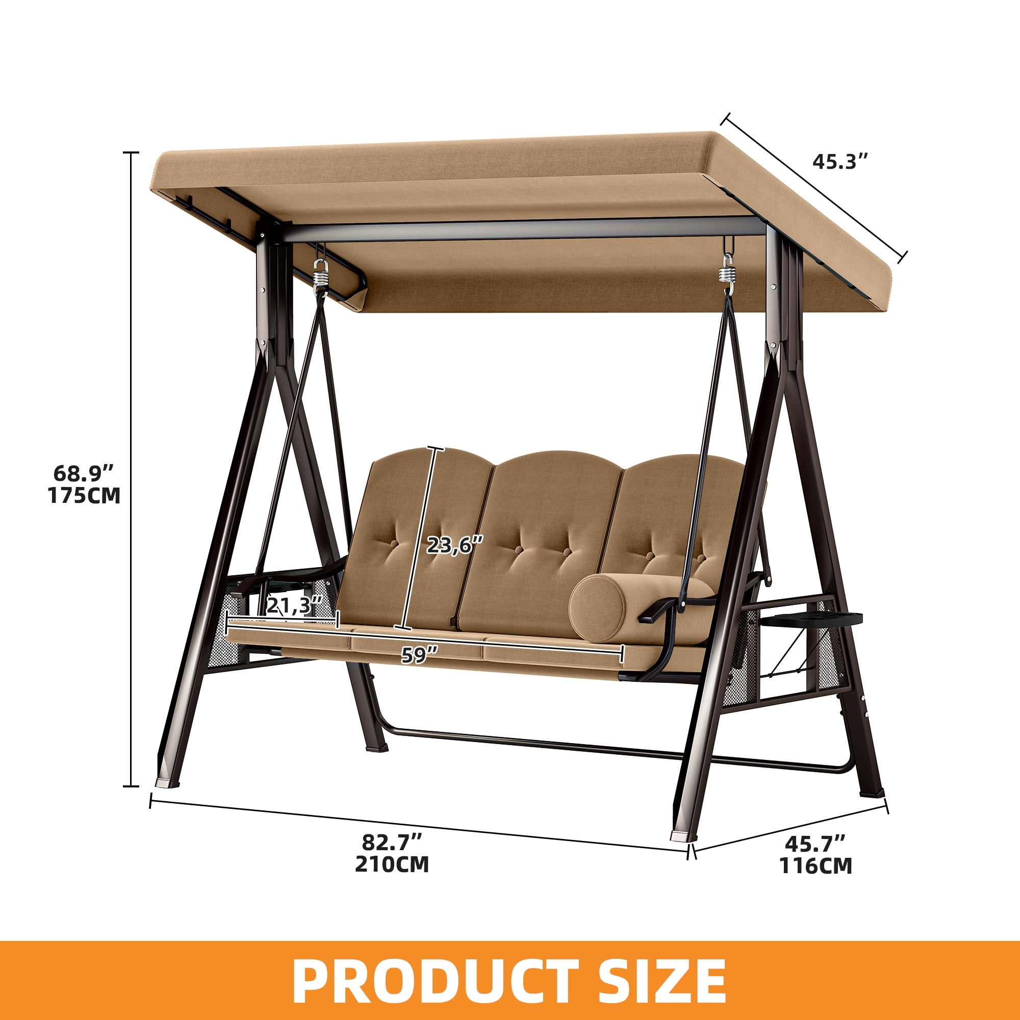 TWO TRAYS: The trays on both sides can be opened for your drinks or snacks, which won’t shake because of the swing of the swing chair. Enjoy a pleasant afternoon on the swing chair IMMENSE WEIGHT CAPACITY: Heavy-duty steel spring lock allows our swing chair to hold up to 595lbs, 60” swing bench boasts enough space to accommodate comfortably for 3 people enjoy and relax together ADJUSTABLE CANOPY: The canopy can be rotated to any angle through the knob for optimal shade coverage and block the sun all day long STURDY & DURABLE: We’re using high quality metal with powder-coated finish steel frame, ensure our swing chair last for long time, bring you a smooth, gentle swing feeling VERSATILE APPLICATIONS: This outdoor swing chair is ideal for home use; Enjoy outdoor leisure time on patios, decks, backyards, balcony, and more. Safety measures and professional installation are highly recommended. TWO TRAYS: The trays on both sides can be opened for your drinks or snacks, which won’t shake because of the swing of the swing chair. Enjoy a pleasant afternoon on the swing chair|IMMENSE WEIGHT CAPACITY: Heavy-duty steel spring lock allows our swing chair to hold up to 800lbs, 60” swing bench boasts enough space to accommodate comfortably for 3 people enjoy and relax together|ADJUSTABLE CANOPY: The canopy can be rotated to any angle through the knob for optimal shade coverage and block the sun all day long|STURDY & DURABLE: We’re using high quality metal with powder-coated finish steel frame, ensure our swing chair last for long time, bring you a smooth, gentle swing feeling|VERSATILE APPLICATIONS: This outdoor swing chair is ideal for home use; Enjoy outdoor leisure time on patios, decks, backyards, balcony, and more. Safety measures and professional installation are highly recommended.