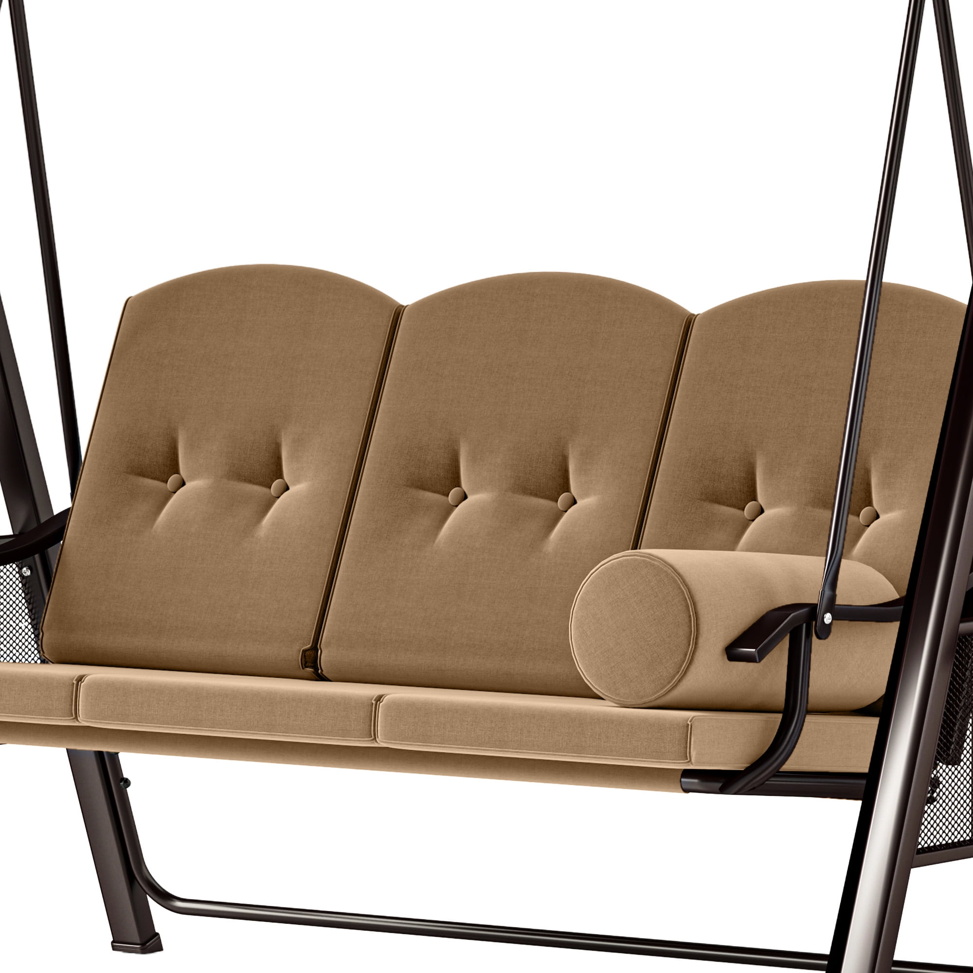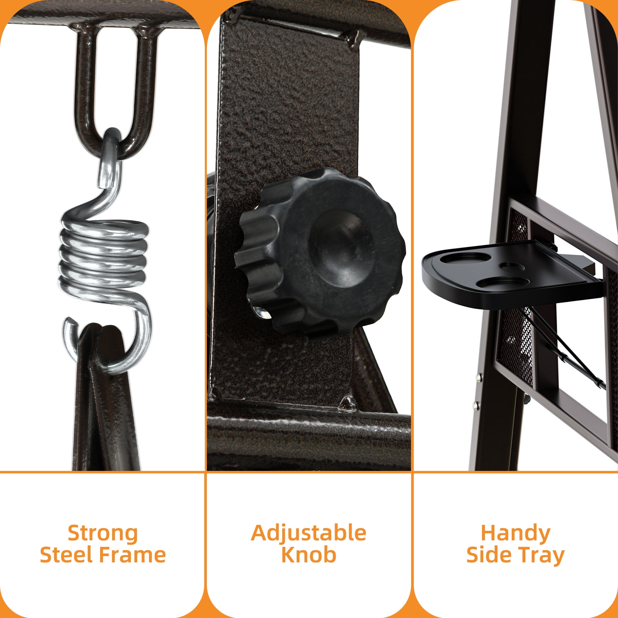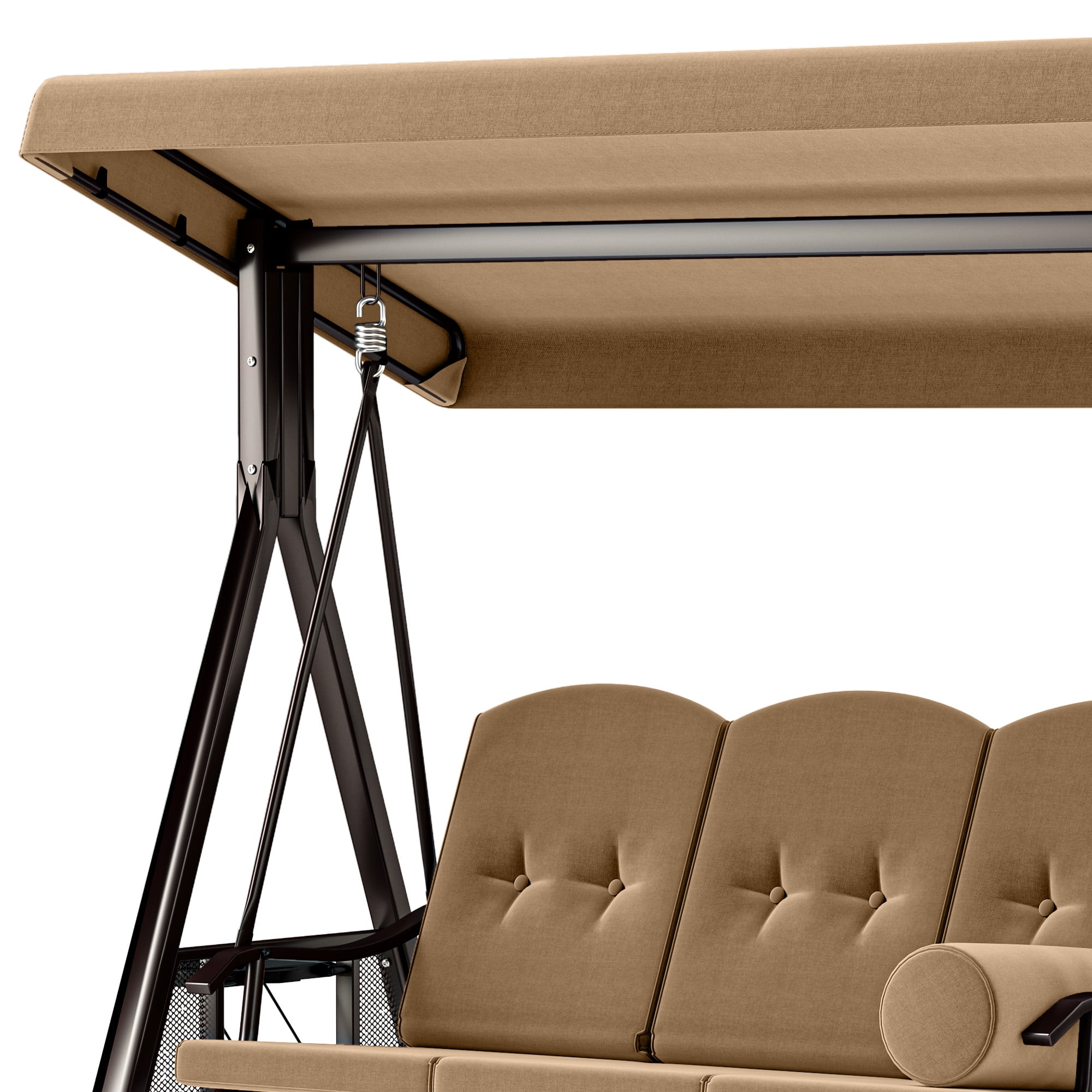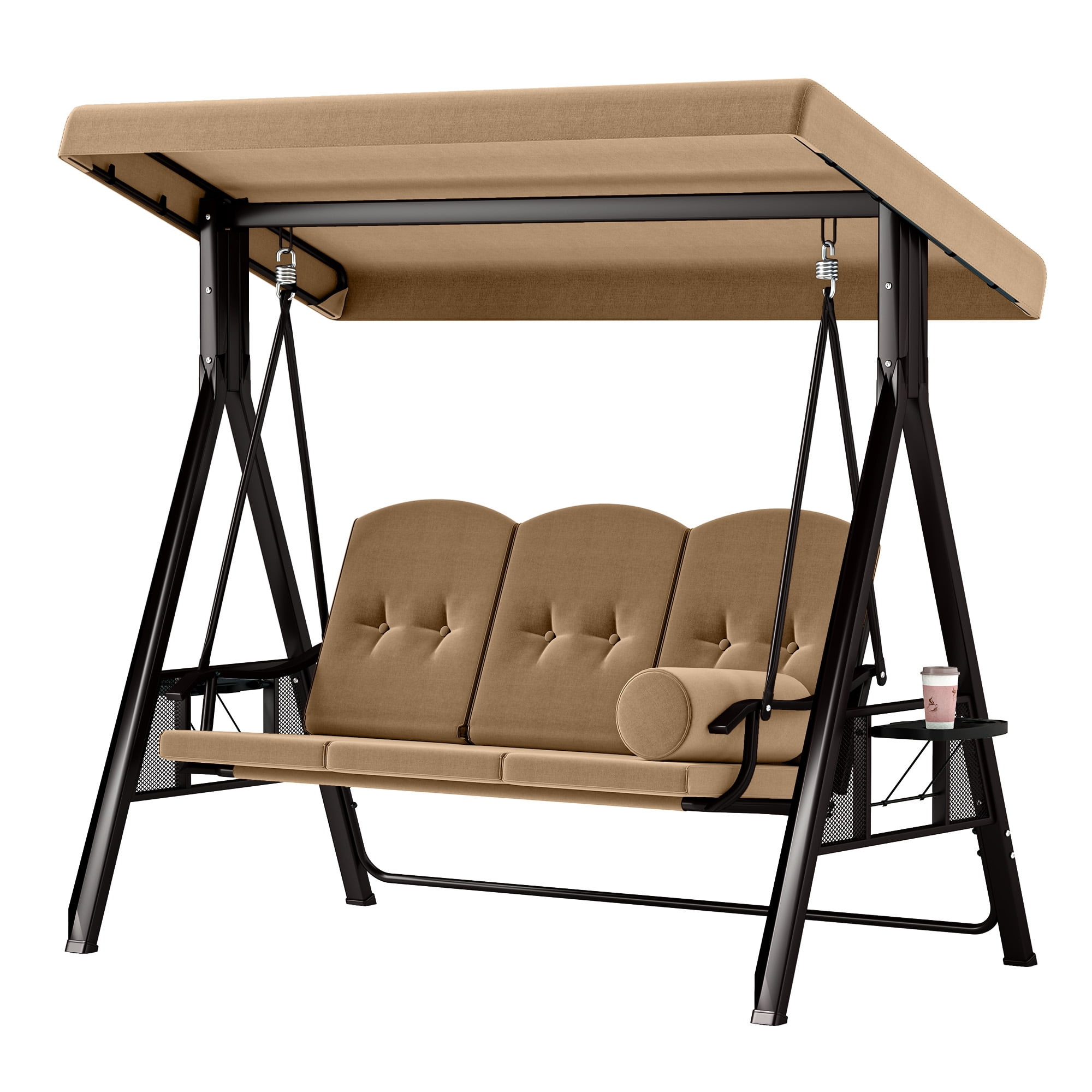 TWO TRAYS: The trays on both sides can be opened for your drinks or snacks, which won’t shake because of the swing of the swing chair. Enjoy a pleasant afternoon on the swing chair IMMENSE WEIGHT CAPACITY: Heavy-duty steel spring lock allows our swing chair to hold up to 595lbs, 60” swing bench boasts enough space to accommodate comfortably for 3 people enjoy and relax together ADJUSTABLE CANOPY: The canopy can be rotated to any angle through the knob for optimal shade coverage and block the sun all day long STURDY & DURABLE: We’re using high quality metal with powder-coated finish steel frame, ensure our swing chair last for long time, bring you a smooth, gentle swing feeling VERSATILE APPLICATIONS: This outdoor swing chair is ideal for home use; Enjoy outdoor leisure time on patios, decks, backyards, balcony, and more. Safety measures and professional installation are highly recommended. TWO TRAYS: The trays on both sides can be opened for your drinks or snacks, which won’t shake because of the swing of the swing chair. Enjoy a pleasant afternoon on the swing chair|IMMENSE WEIGHT CAPACITY: Heavy-duty steel spring lock allows our swing chair to hold up to 800lbs, 60” swing bench boasts enough space to accommodate comfortably for 3 people enjoy and relax together|ADJUSTABLE CANOPY: The canopy can be rotated to any angle through the knob for optimal shade coverage and block the sun all day long|STURDY & DURABLE: We’re using high quality metal with powder-coated finish steel frame, ensure our swing chair last for long time, bring you a smooth, gentle swing feeling|VERSATILE APPLICATIONS: This outdoor swing chair is ideal for home use; Enjoy outdoor leisure time on patios, decks, backyards, balcony, and more. Safety measures and professional installation are highly recommended.