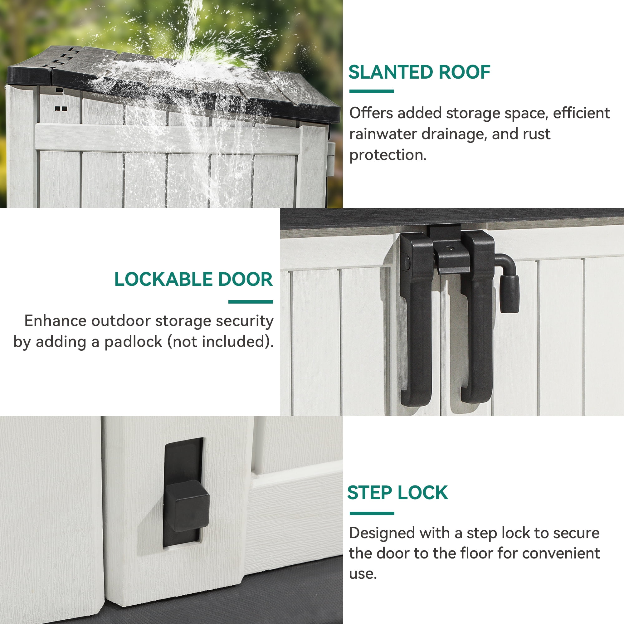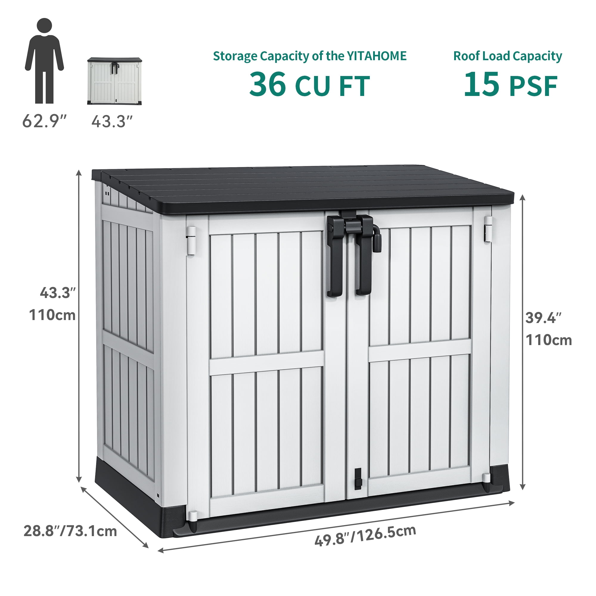 Large Storage Shed: With outer dimensions of 49.8”L x 28.8”W x 43.3”H and ample 36 cu ft capacity, this plastic storage shed is spacious enough to hold garden tools, small lawn mowers, bikes, 2 small trash cans Premium Material & Technology: This outdoor storage shed features weather-resistant resin panel construction that’s processed with advanced injection-moulding technology for stronger wind and impact resistance, and won’t bend or puncture easily; A safe haven for your valuable tools and equipment All-Weather Durability: Our tool shed is made from UV-proof resin that’s suitable for all season use and facilitates effortless cleaning and maintenance; Attractive wooden texture provides fading protection; Creative waterproof lid helps to ensure durability after frequent use regardless of weather conditions Functional Designs: The outdoor storage box is designed with a sloping roof that enables extra storage space while preventing rainwater accumulation and rusting; Lockable door (padlock not included) improves storage security, and the step lock secures the door to the floor for convenient use Easy Assembly & Disassembly: Dextrus tool shed outdoor storage can be easily put together and taken apart in less than 20 minutes using simple tools by following the detailed instructions included, saving your time and energy