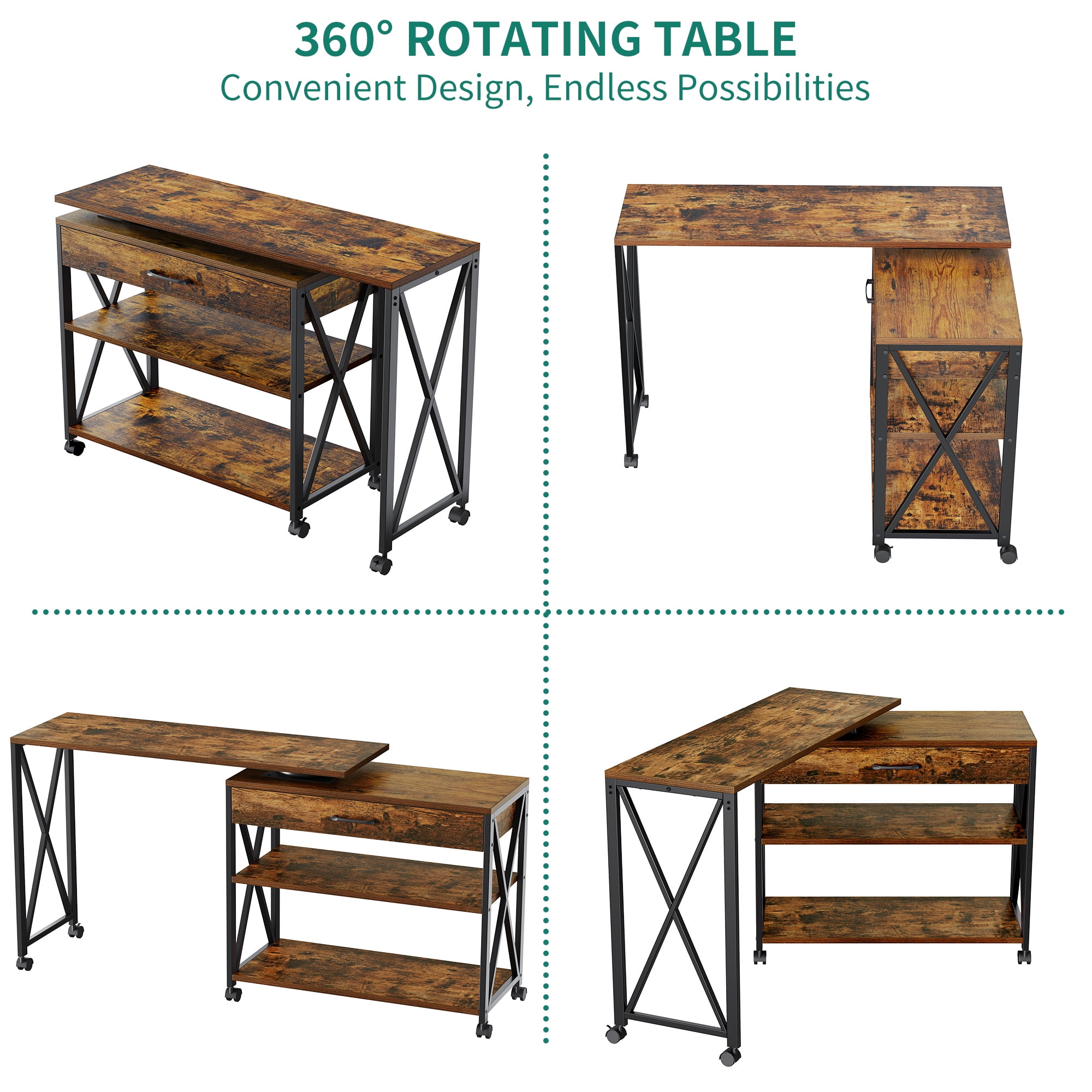 REVOLUTIONARY 360° CONFIGURATION: Embrace the future of flexible living with our connected writing desk, complete with a central groove that allows the desktop to rotate 360°. No tools, no fuss—just effortless customization for every need. ON-THE-GO FLEXIBILITY: With 360° smooth-rolling wheels, you can transport this writing desk from the living room to the bedroom with ease. Two brake-equipped wheels provide stability, and the strong rubber material minimizes noise and floor scratches. ORGANIZED ABUNDANCE: This computer desk boasts a drawer and two storage shelves, providing a home for plants, books, ornaments, and more. It liberates your desktop while accommodating your coffee and laptop. Elevate your comfort with clever storage. SECURE AND SMOOTH: Safety meets style with rounded corners and a smooth surface that safeguards against potential scratches. The iron frame is built for lasting durability, featuring rust resistance and heightened hardness for an extended lifespan. VERSATILE STYLE FOR EVERY SPACE: Whether it’s a TV snack table, laptop workstation, or living room display, this L-shaped corner desk is your multipurpose companion. Its simple yet elegant design seamlessly integrates into your home, adapting to various occasions with grace.