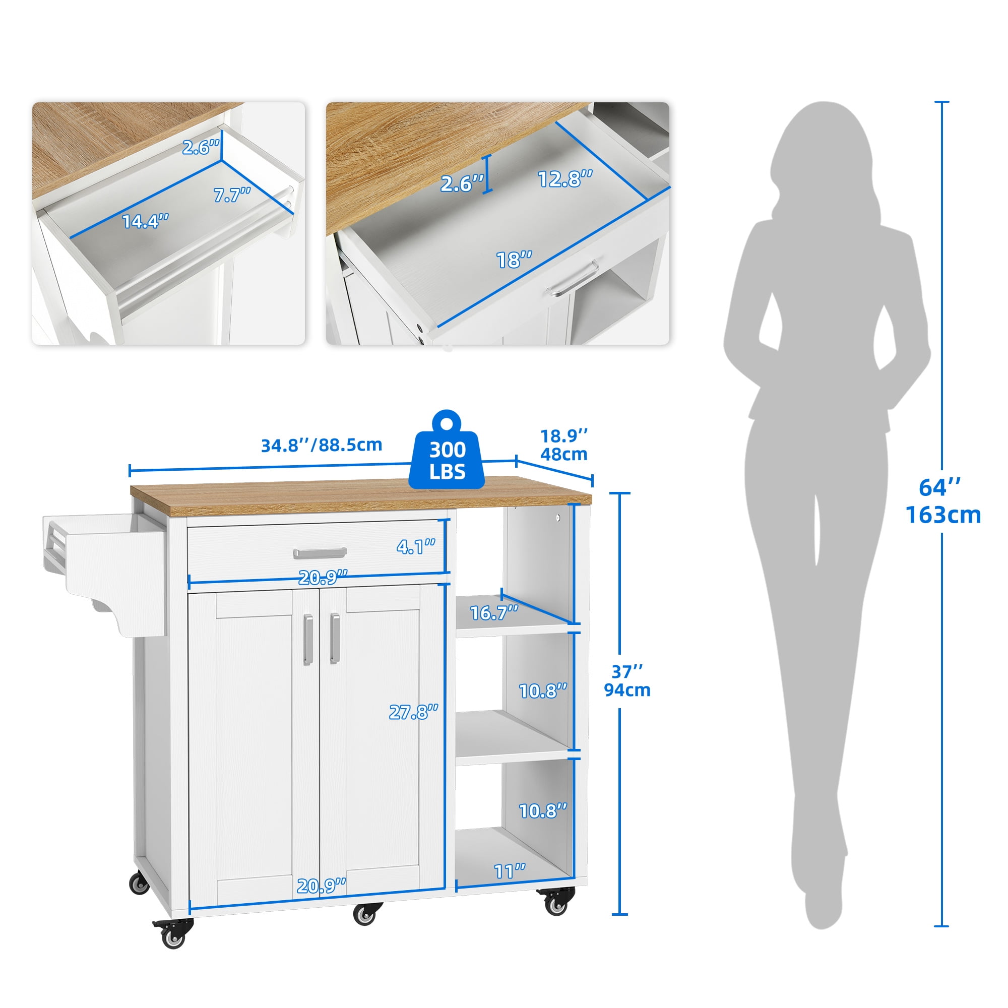 [Waterproof and Scratch-resistant] The pinewood top of this kitchen cart, boasting a thickness of 2.7 inches, is painted with a smooth, food -safe finish, rendering it both waterproof and resistant to scratches. it facilitates effortless cleaning the countertop surface after food preparation. [Durable Material and Magnetic Closure] Crafted with a thick pinewood top supported by four sturdy legs and P2 grade MDF, capable of withstanding weights of up to 300 lbs without any wobbling. Additionally, the storage shelf can be adjusted according to your needs. Moreover, the magnetic closure system not only provides a quieter closing experience compared to ordinary door handles but also reduces damage during using it. [Ample Storage Space] it features a spacious storage cabinet, 3 opening shelves and1 drawers, allowing for efficient organization of cutlery, pots, spice rack, pans, and other essentials for ensuring orderly storage and easy cleaning. addtionally, boasting a towel rack greatly lift the usage experience. [Smooth Telescopic Channel] The kitchen island cart channel can slide in and out with ease, which has been tested many times in the factory. Metal sliding channel makes pull comfortable, drawers glide smoothly. A cabinet with hinges and a magnet keeps the door closed tightly. The drawer has a smooth telescopic channel, moving in and out with ease. [360° Swivel Casters] The kitchen cart is equipped with 360° industrial wheels that effortlessly facilitate movement to any desired location. These wheels are exceptionally sturdy, capable of bearing 300lb heavy loads without any risk of breakage. Moreover, two of the wheels are lockable, ensuring optimal stability when the cart is stop.