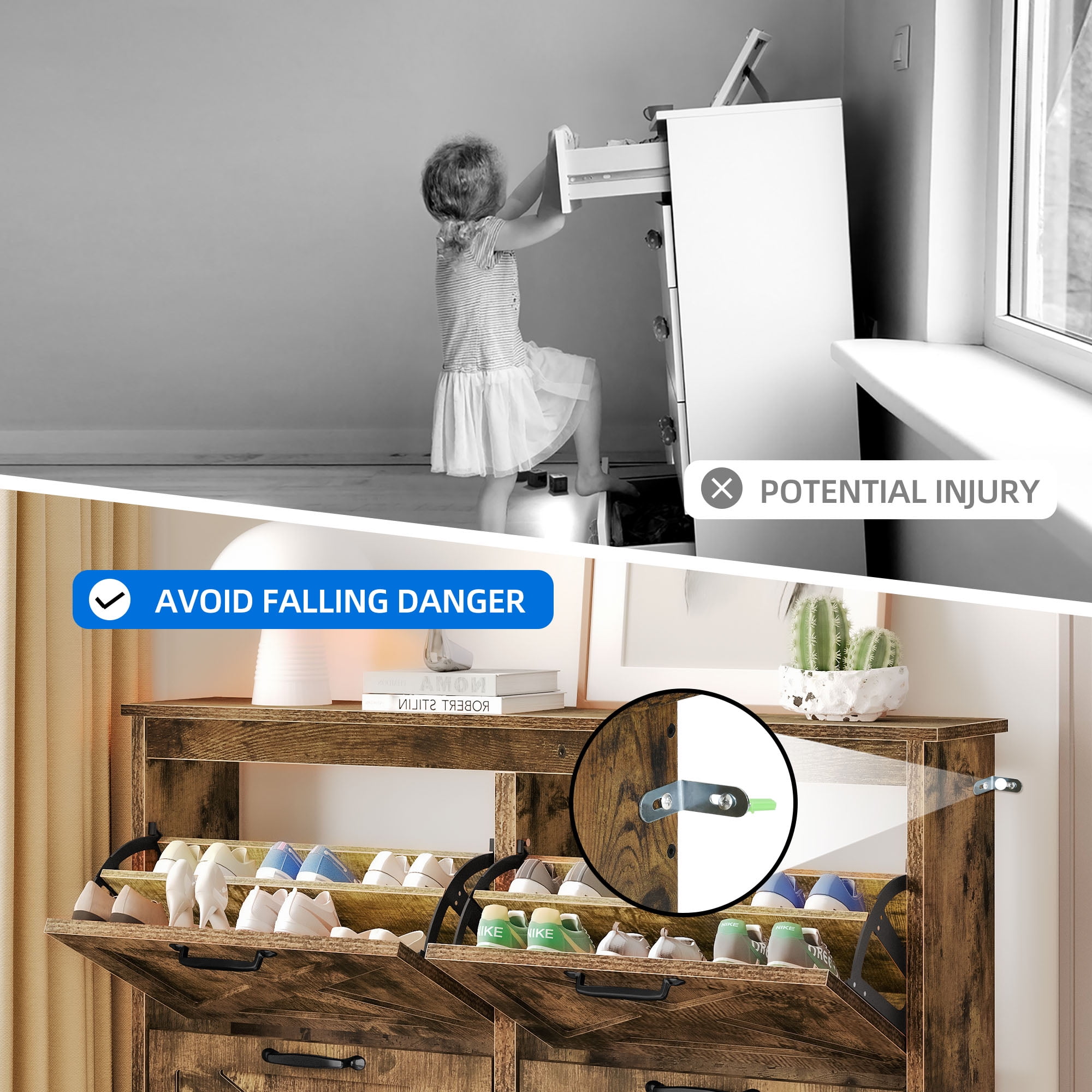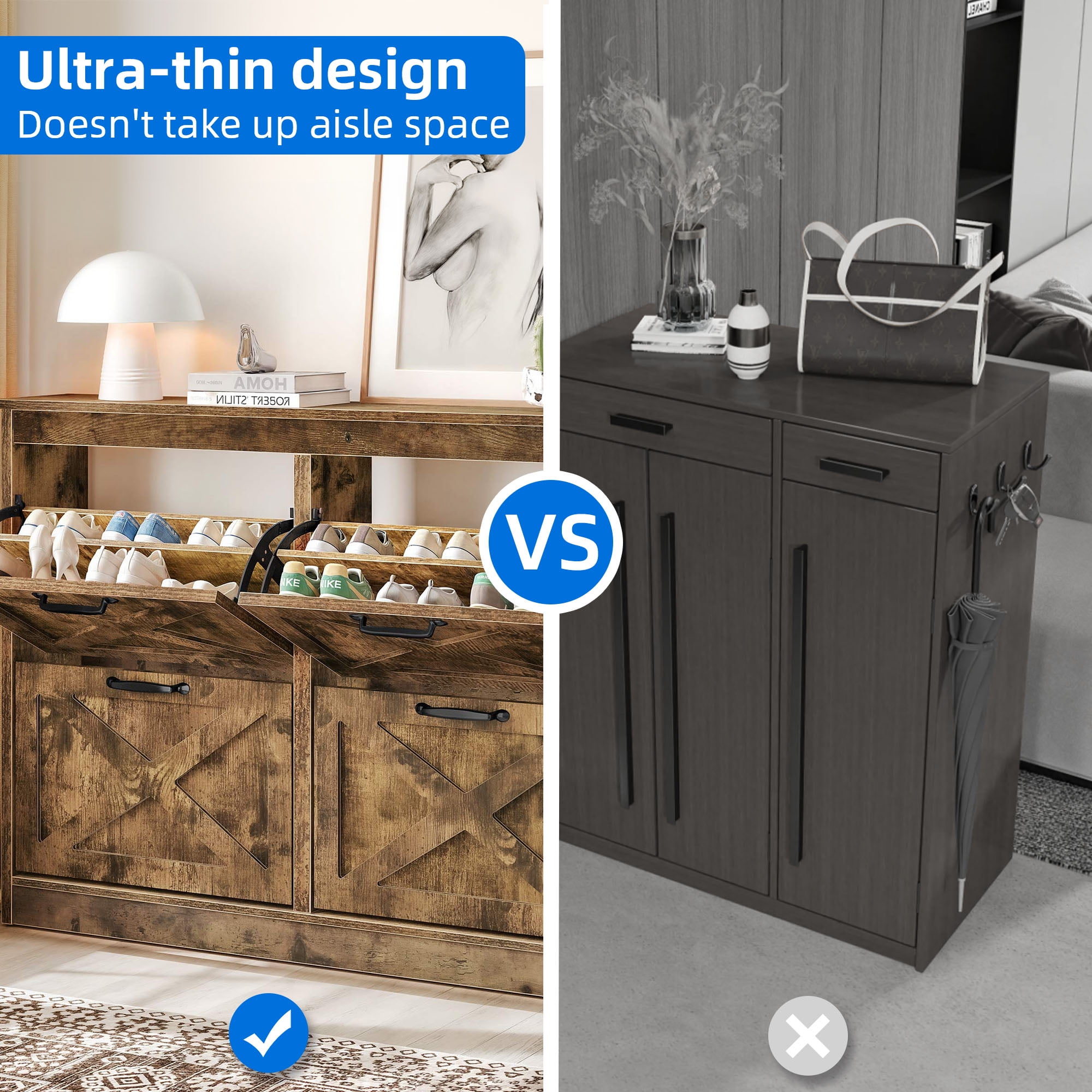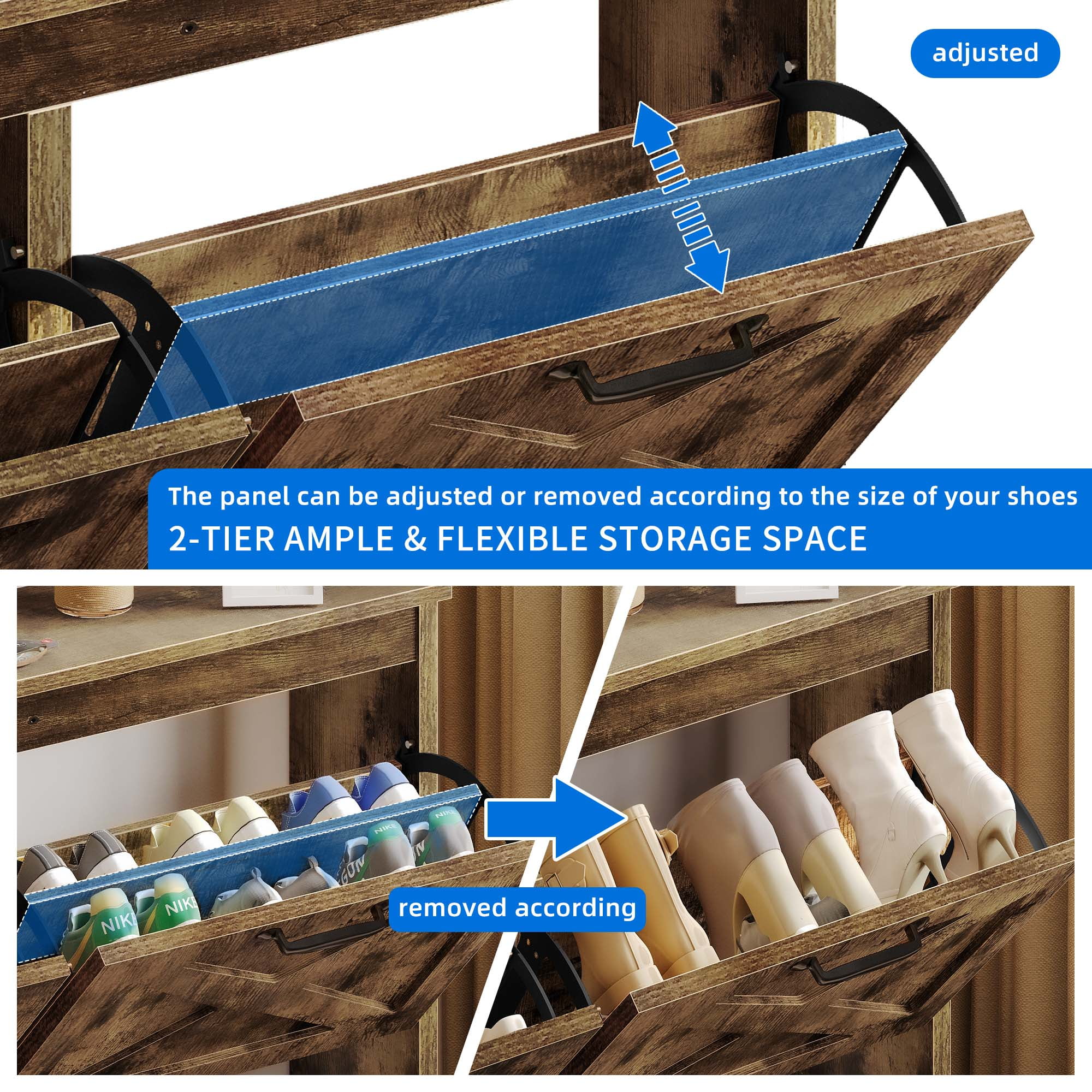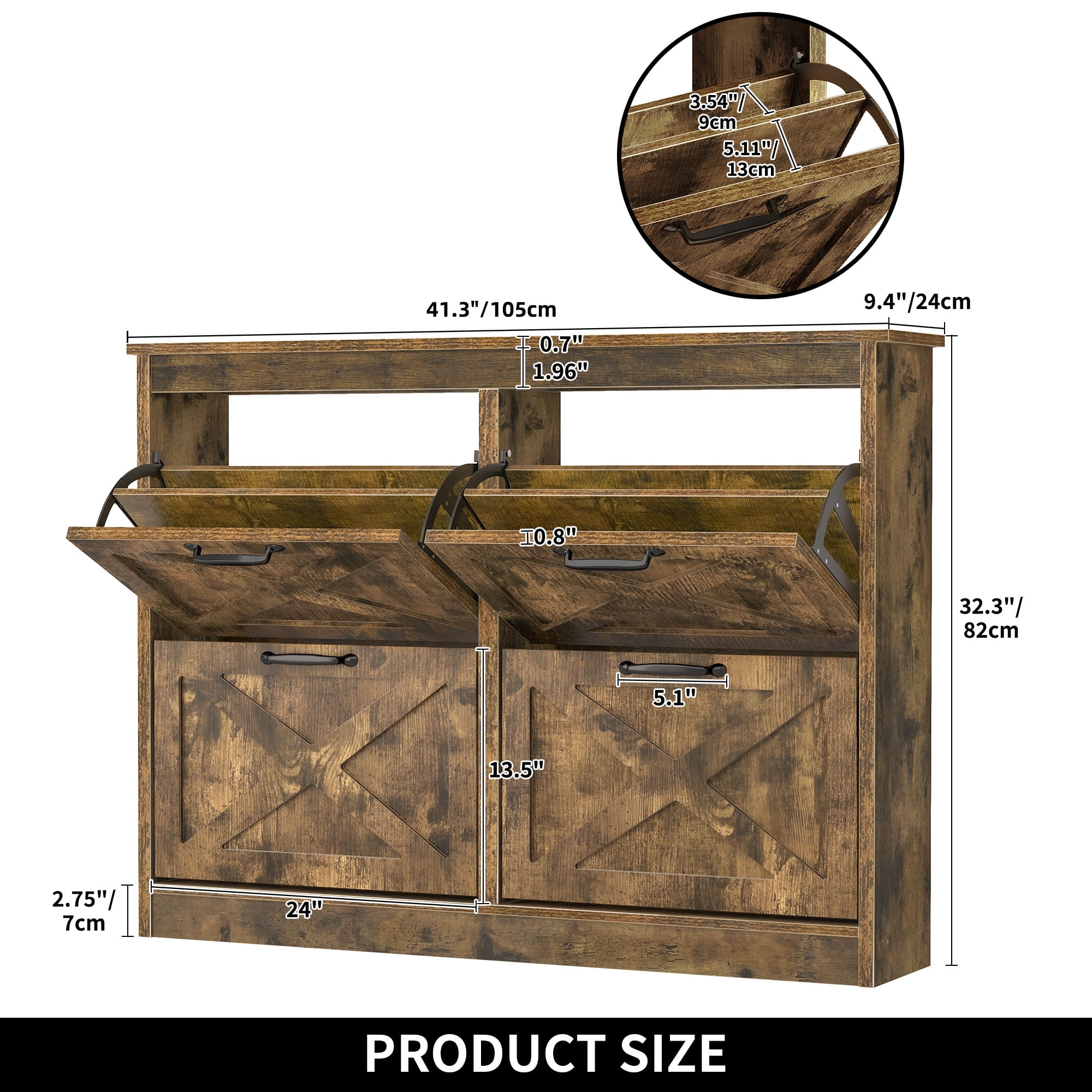 Elegant Shoe Storage Solution: Step into sophistication with Dextrus captivating entryway shoe cabinet. This rustic brown masterpiece infuses any room with a touch of refinement. Whether placed in your entryway, hallway, living room, or porch, this sleek shoe cabinet effortlessly combines functionality with charm. Innovative Flip Drawer Design: Are you tired of stumbling over scattered shoes? Our revolutionary flip drawers provide seamless access to your footwear collection. Say goodbye to the woes of pets getting a hold of your favorite pairs. Keep your entryway pristine and poised for your next adventure. Spacious Storage Capacity: Our drawer shoe cabinet offers ample room, accommodating 24-32 pairs with ease. Bid farewell to the days of squeezing shoes into tight corners. The adjustable panels ensure each pair finds its own snug spot, regardless of its size or shape. Safety and Reliability: Featuring an anti-tipping mechanism and robust construction, our slim concealed shoe cabinet mitigates the risk of tip-over incidents. Not only does it add a touch of flair to your space, but it also prioritizes the safety of your loved ones. Effortless Assembly: Even beginners can effortlessly assemble this shoe rack with the aid of detailed instructions and pre-labeled components. Should you encounter any challenges, our committed team is just a message away, poised to provide you with timely assistance.