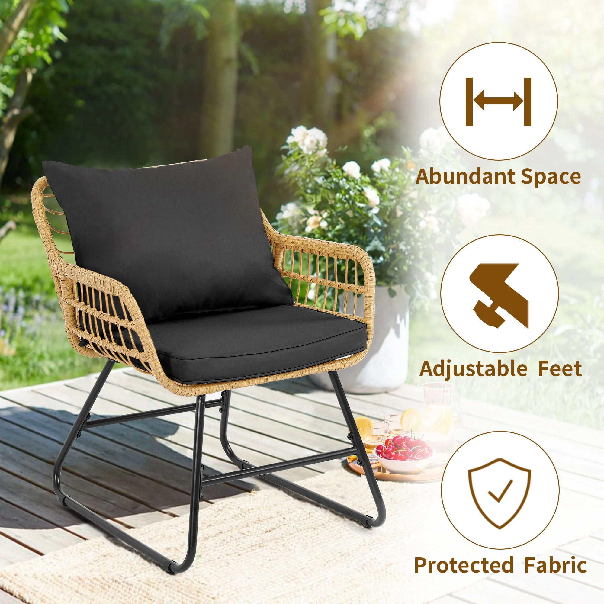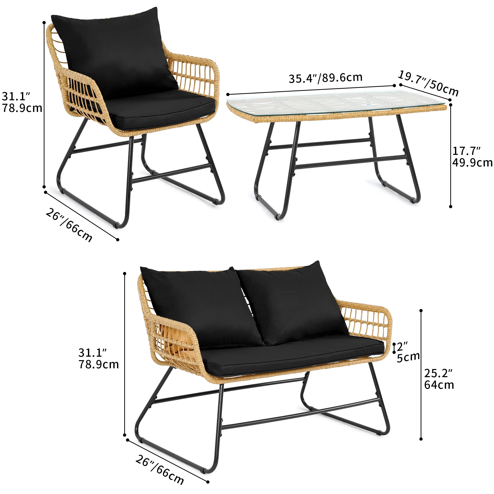 COMFORTABLE SEAT: Looking to experience outdoor leisure in style and comfort? This patio furniture set fits the bill; Ample seat space with thick cushions allows cozy parent-child time, as well as great snuggling with your pet; Cushion cover is detachable for easy maintenance GLASS SIDE TABLE: The patio furniture set features an elegant side table that features a black/transparent tempered glass top that gleams and provides sturdy support for foods, drinks, or other items within 75lbs. SLEEK & STURDY: Durable structure gives the chair a huge 250 pounds weight capacity; Added adjustable feet allow more enhanced stability; Exquisite weaving technology helps to accentuate your home’s modern style SPECIFICATIONS: Comes with 2 chairs, each with dimensions of 26″(L) x 24.4″(W) x 31.1″(H), 1 coffee table measuring 35.4″(L)x 19.7″(W) x17.7″(H), and 1 loveseat chair is sized 47″L x 26″W x 31.1″H ; Total weight is 74.52 pounds EASY ASSEMBLY & RELIABLE SERVICE: Convenient assembly only takes a few minutes by following the instructions with all parts included; Our excellent pre- and after-sales services are always available to ensure your purchase is hassle-free Easy to assemble|Indoor & Outdoor use|Durable and Stable