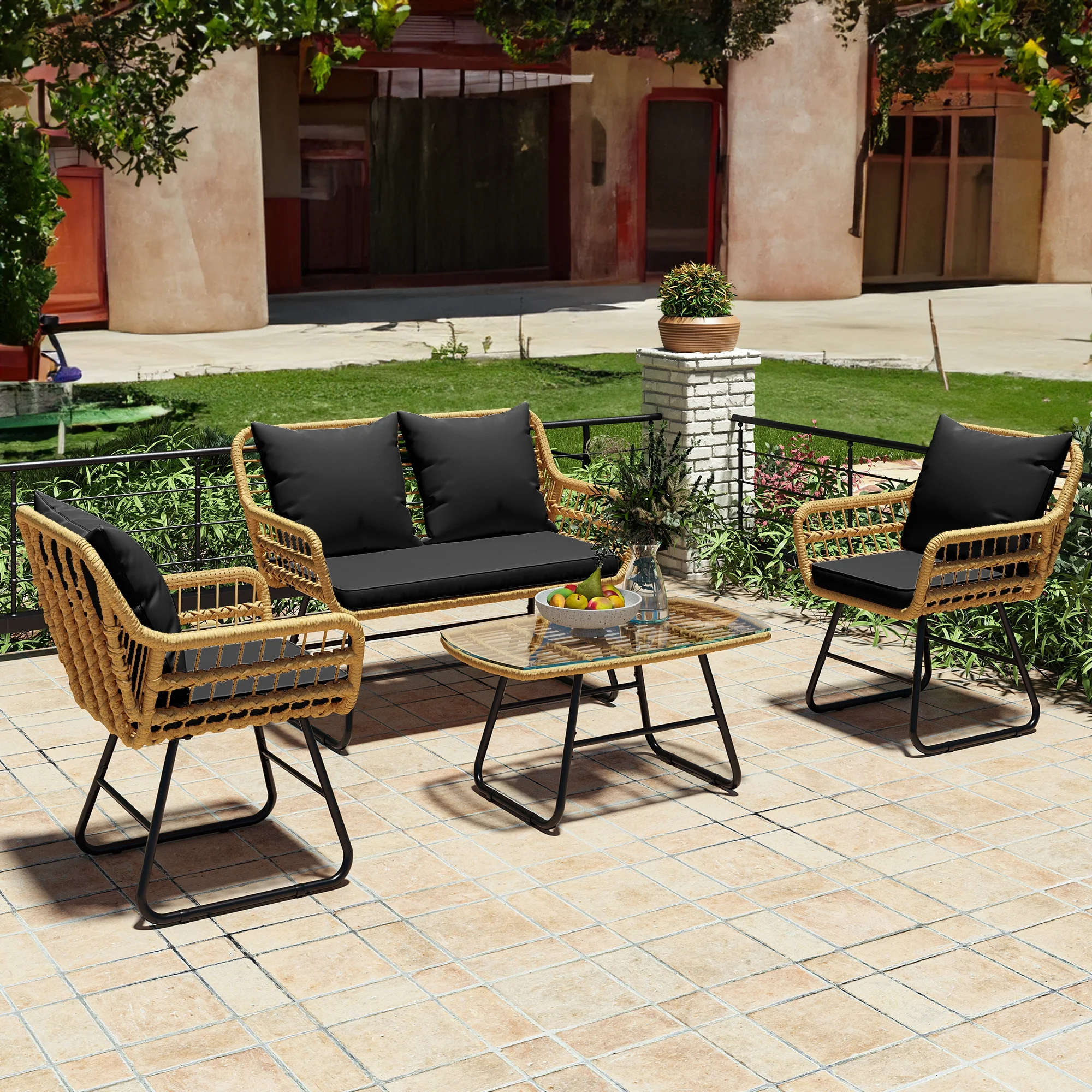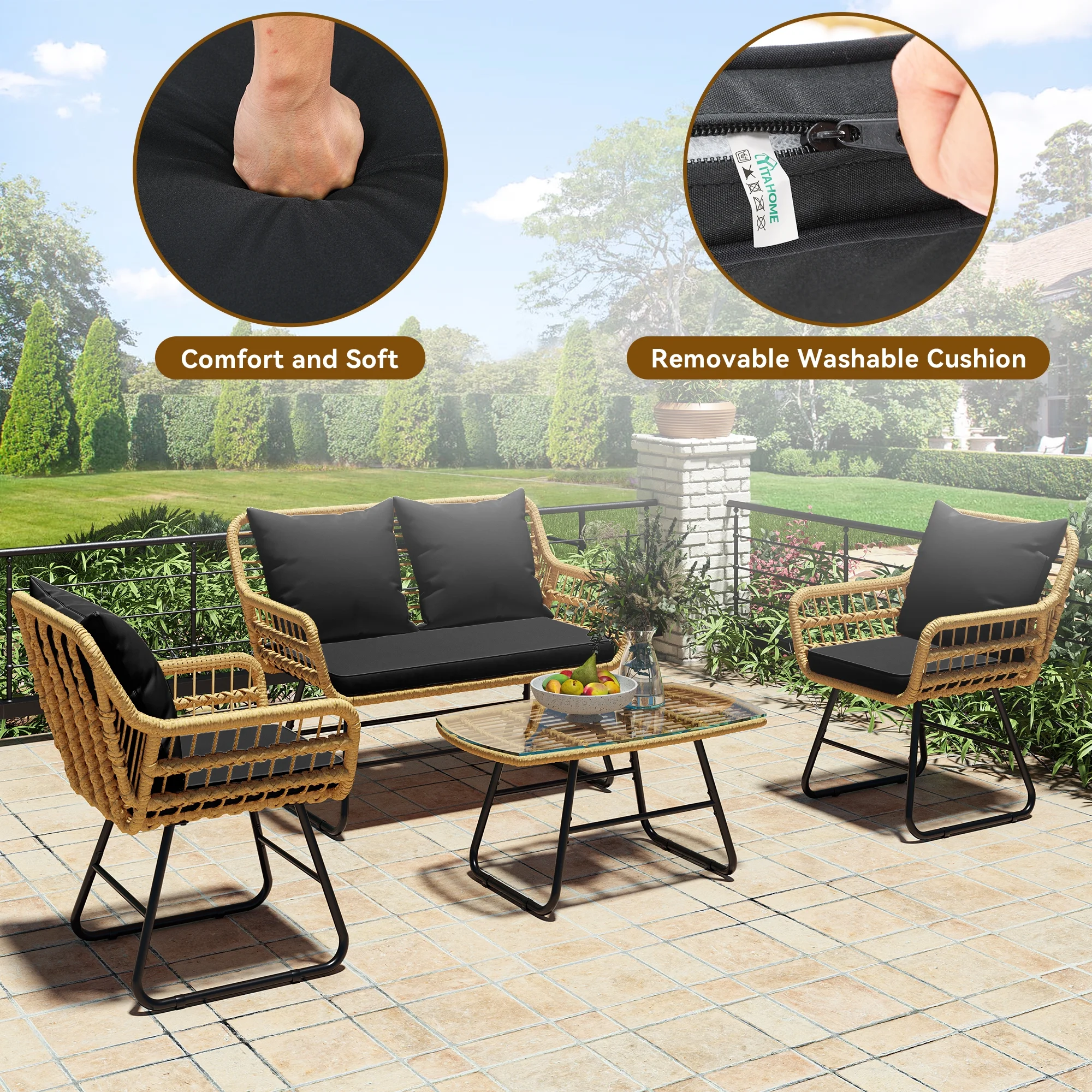 Dextrus 4-Piece Patio Furniture Wicker Outdoor Bistro Set, All-Weather Rattan Conversation Loveseat Chairs for Backyard, Balcony and Deck with Soft Cushions and Metal Table (Light Brown+Black)