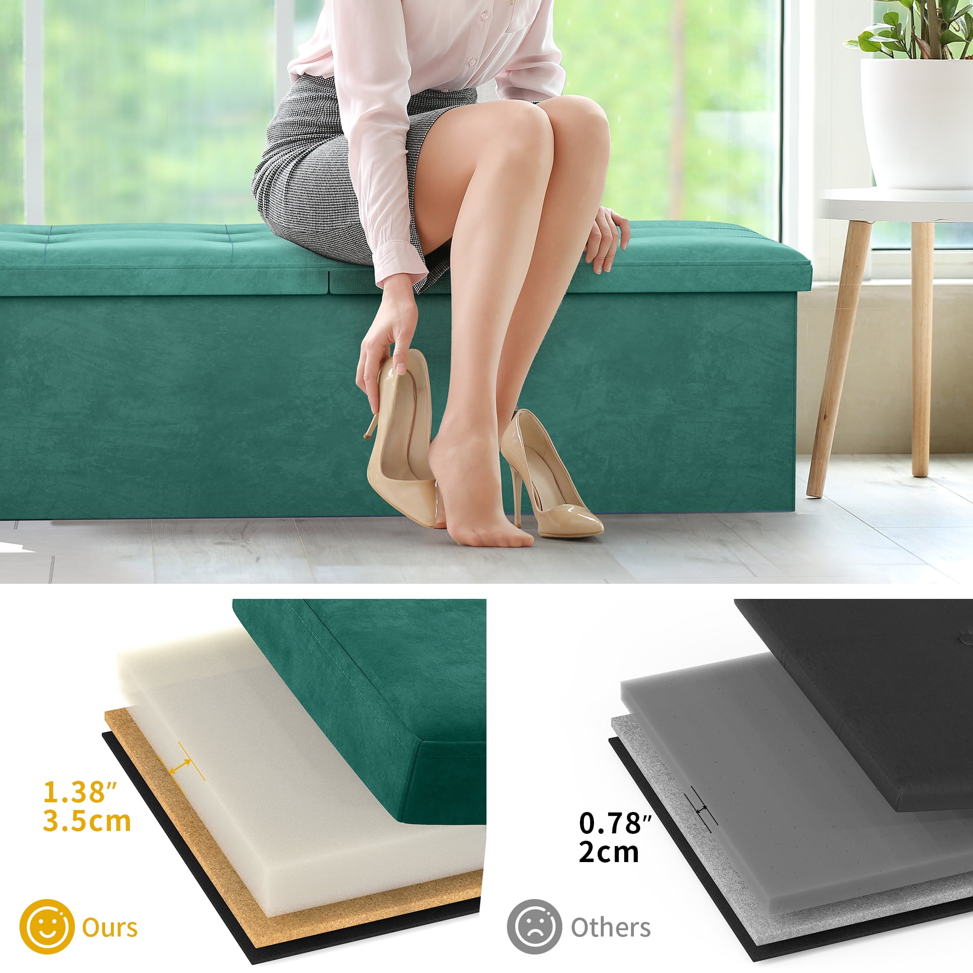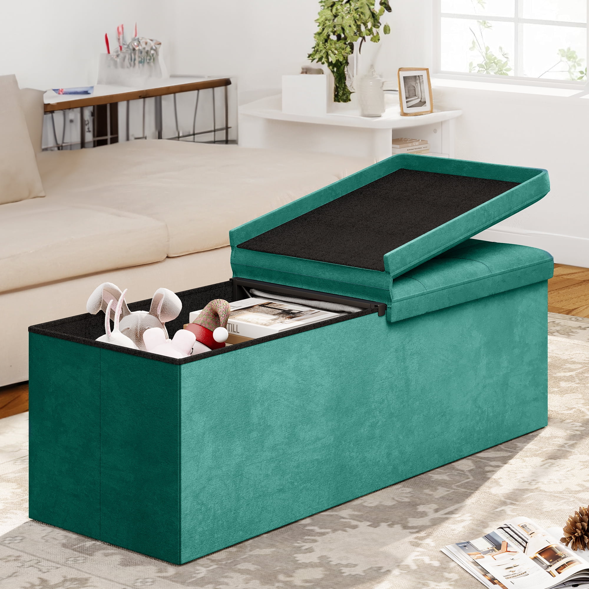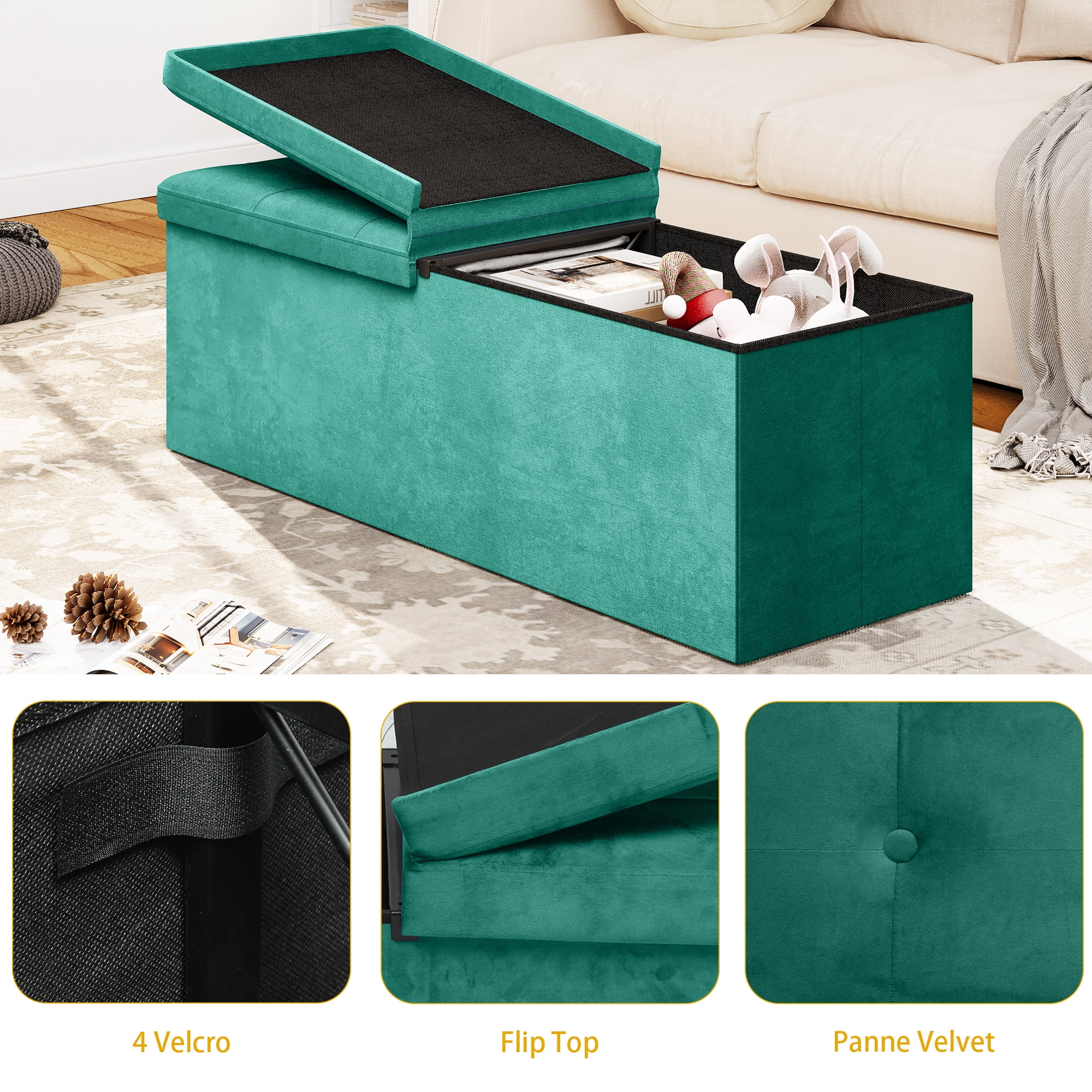 Dextrus 43 Inches Folding Storage Ottoman Bench, Dutch Velvet Footrest with 35mm high Elasticity Sponge seat and Metal Frame for Sturdiness (Green)