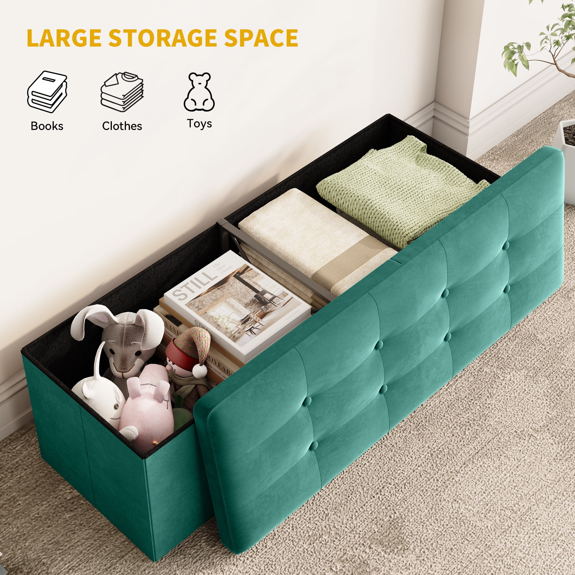 LARGE STORAGE SPACE: Make your living space more organized with this stylish ottoman bench with storage, it is spacious enough to store bedsheets, blankets, clothes, pillows, toys, books, and many other items. This charming storage ottoman is the perfect way to add elegance to your room. MULTIFUNCTIONAL: Elegant ottoman provides additional seating and storage space in your living room, bedroom, office. Storage chest provides ample storage space for organizing pillows, blankets or magazines neatly. While bringing an elegant, classical and noble atmosphere to your entrance, living room or bedroom, it also fully demonstrates comfort and functional diversity, providing the greatest convenience for your life. DESIGN: This ottoman with storage is made of solid engineered wood and iron frame to ensure stability. The collapsible ottoman can be stored away when not in use to save space. PREMIUM MATERIAL AND DURABLITY: Use of dutch velvet provides it a very classy and premium look, also 35mm thickened sponge padding gives great seating comfort. Beautiful durable velvet upholstery with thick sponge and MDF construction is comfortable and elegant ensures the ottoman’s place in your home for a long time. DIMENSIONS: The dimensions of this ottoman bench is 43″ *13.5″ * 15″