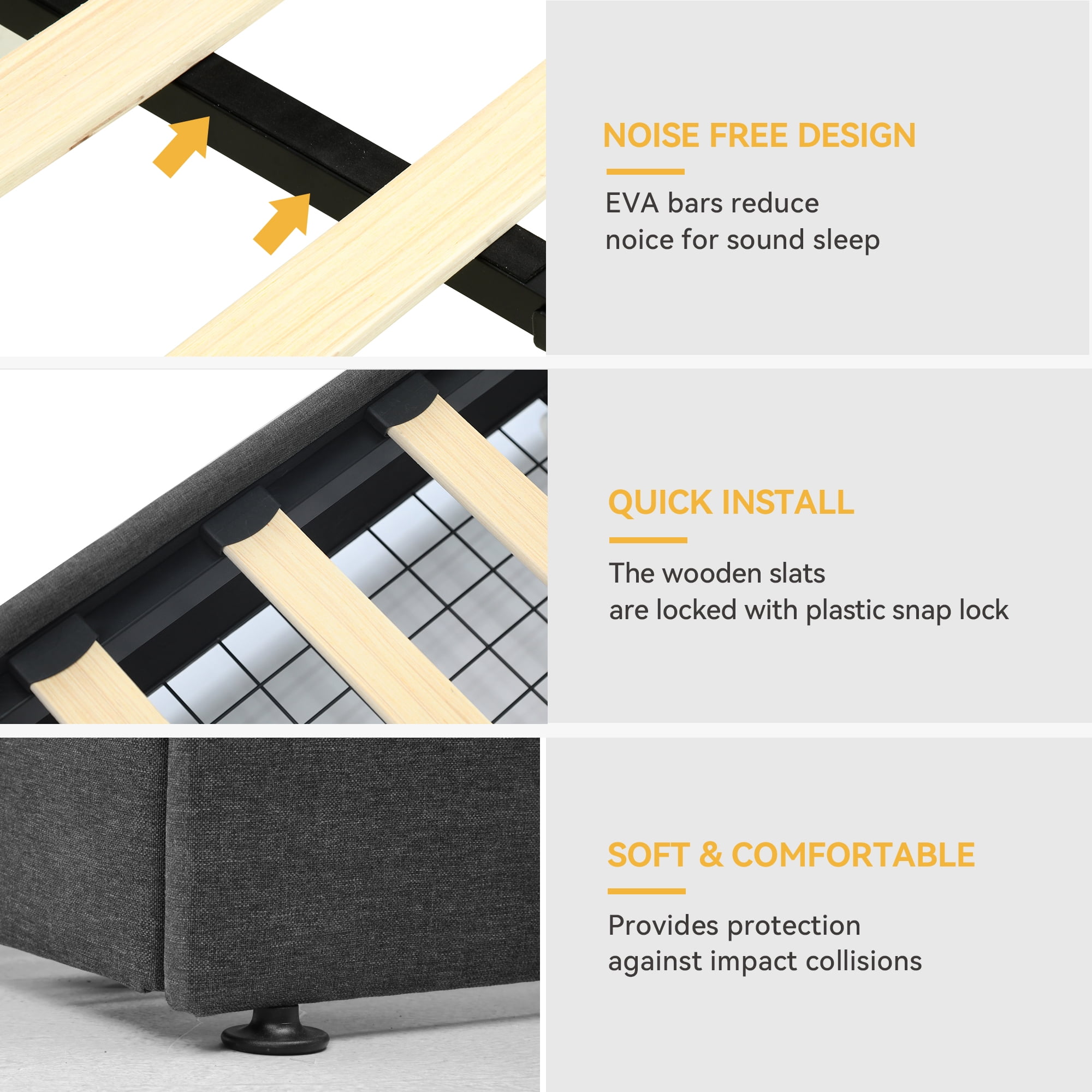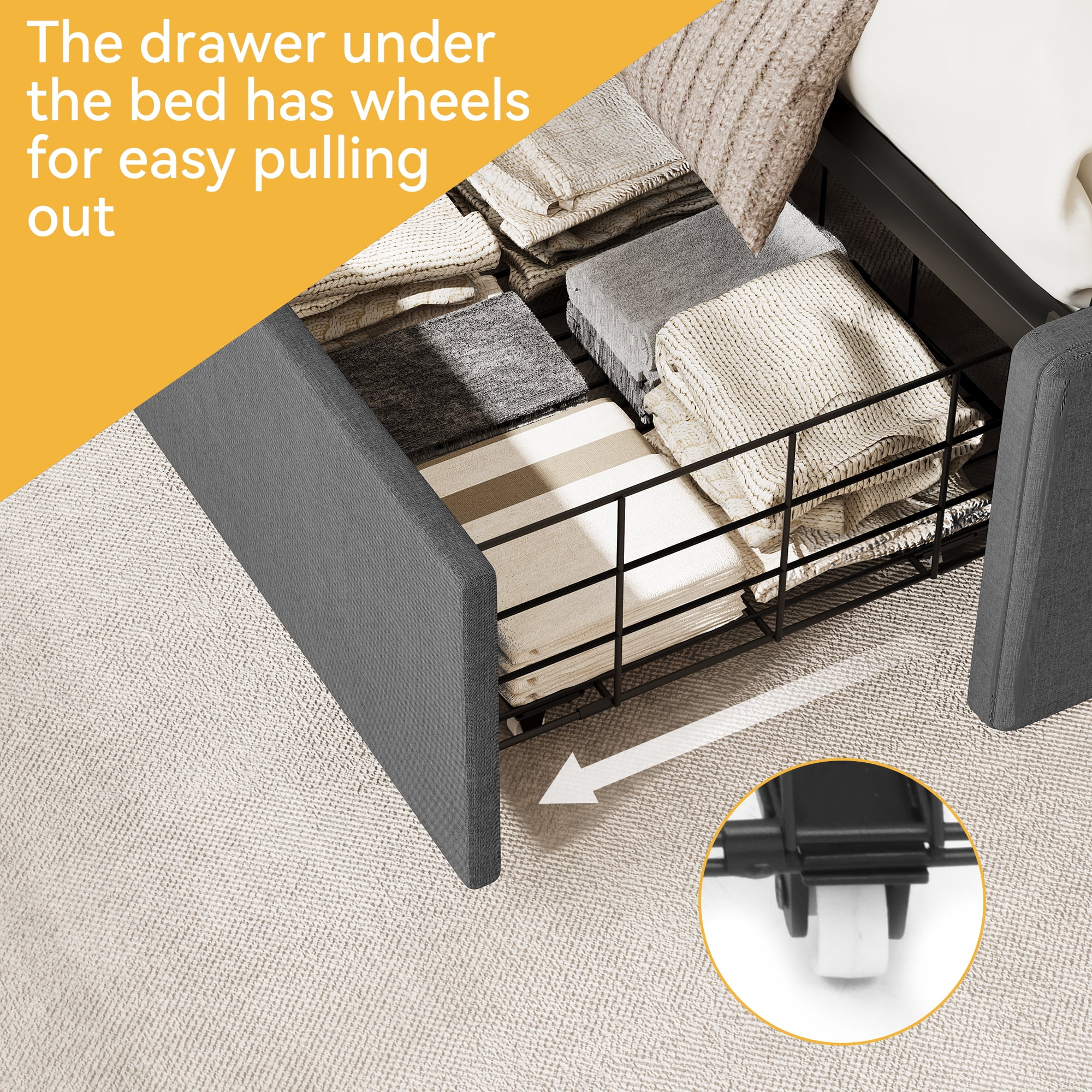 Dextrus 44.6″ Durable Wood Slats No Box Spring Bed Frame, Queen Efficient Storage: 4 large drawers with wheels for easy access and organization Integrated Charging: Headboard with 2 outlets and 2 USB ports for convenient device charging Distinctive Wingback: Wide wingbacks and rhombic tufted button design for added style Easy Assembly: Includes all tools, hardware, and clear instructions for straightforward setup Solid and Quiet: Sturdy metal frame with 12 wooden slats, supporting up to 1100 lbs and reducing noise