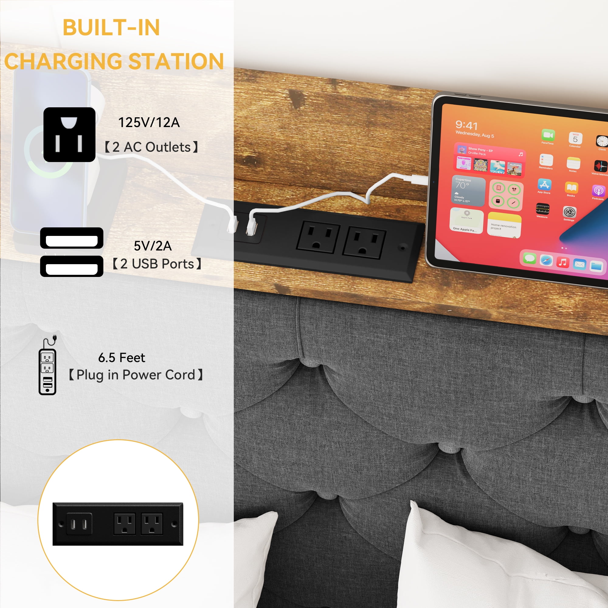 Dextrus Queen Bed Frame, a perfect blend of style and utility. With 4 spacious drawers, a multifunctional headboard with built-in outlets and USB ports, and wide wingbacks, it offers ample storage and convenience. The sturdy metal frame and 12 wooden slats ensure durability and support up to 1100lbs. Enjoy a noiseless, comfortable sleep with our bed frame that requires no box spring and is easy to assemble. Specifications Size: Queen Product Dimensions: 86.2″L x 63.1″W x 44.6″H Special Feature: Sturdy Color: Grey Included Components: Bed Frame Components