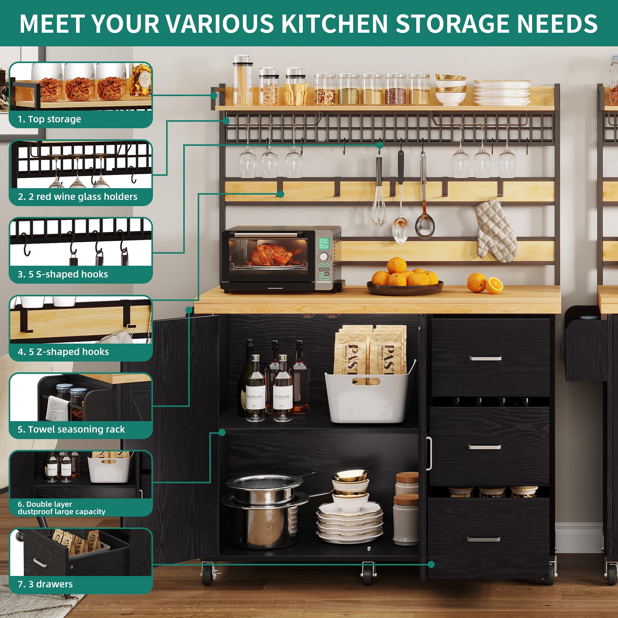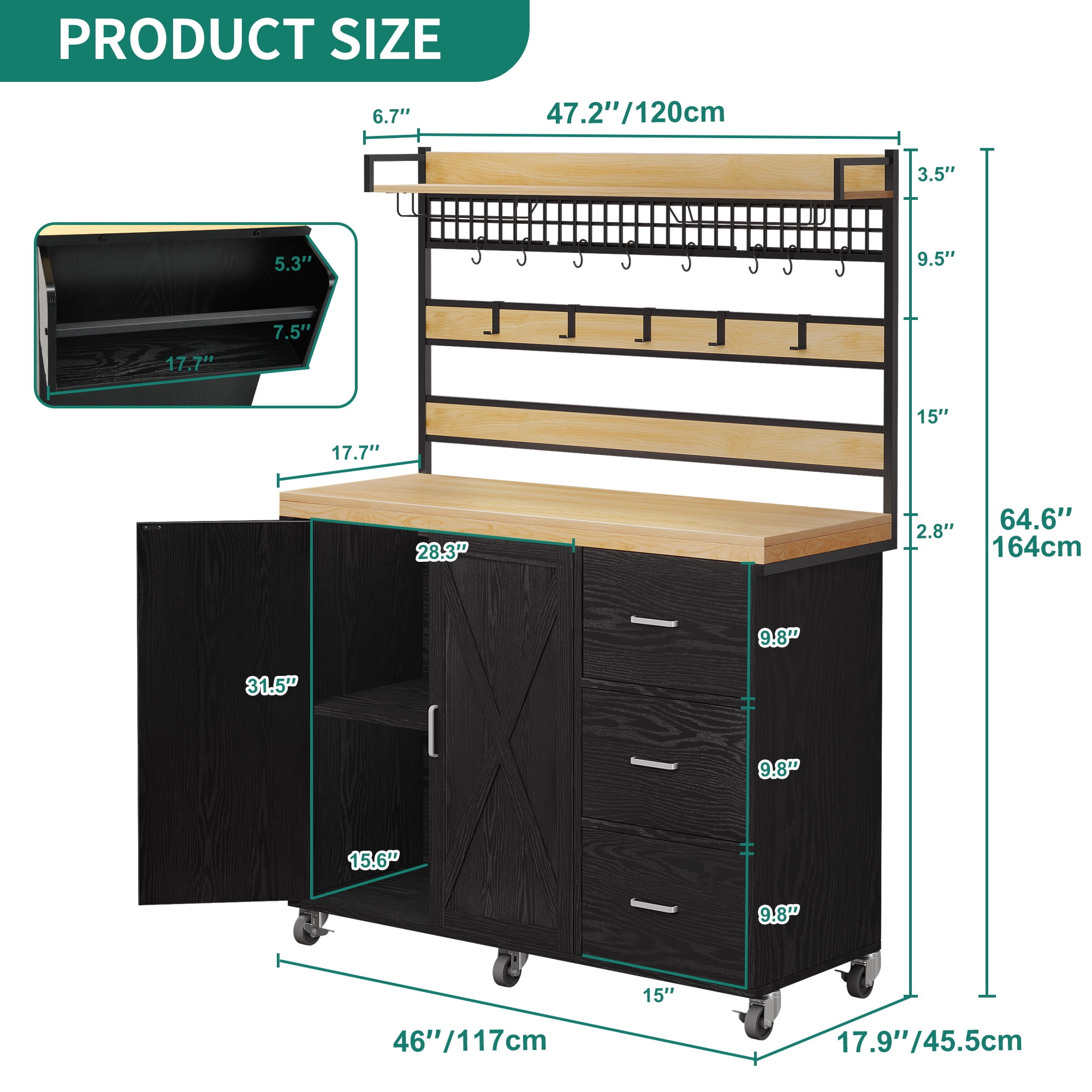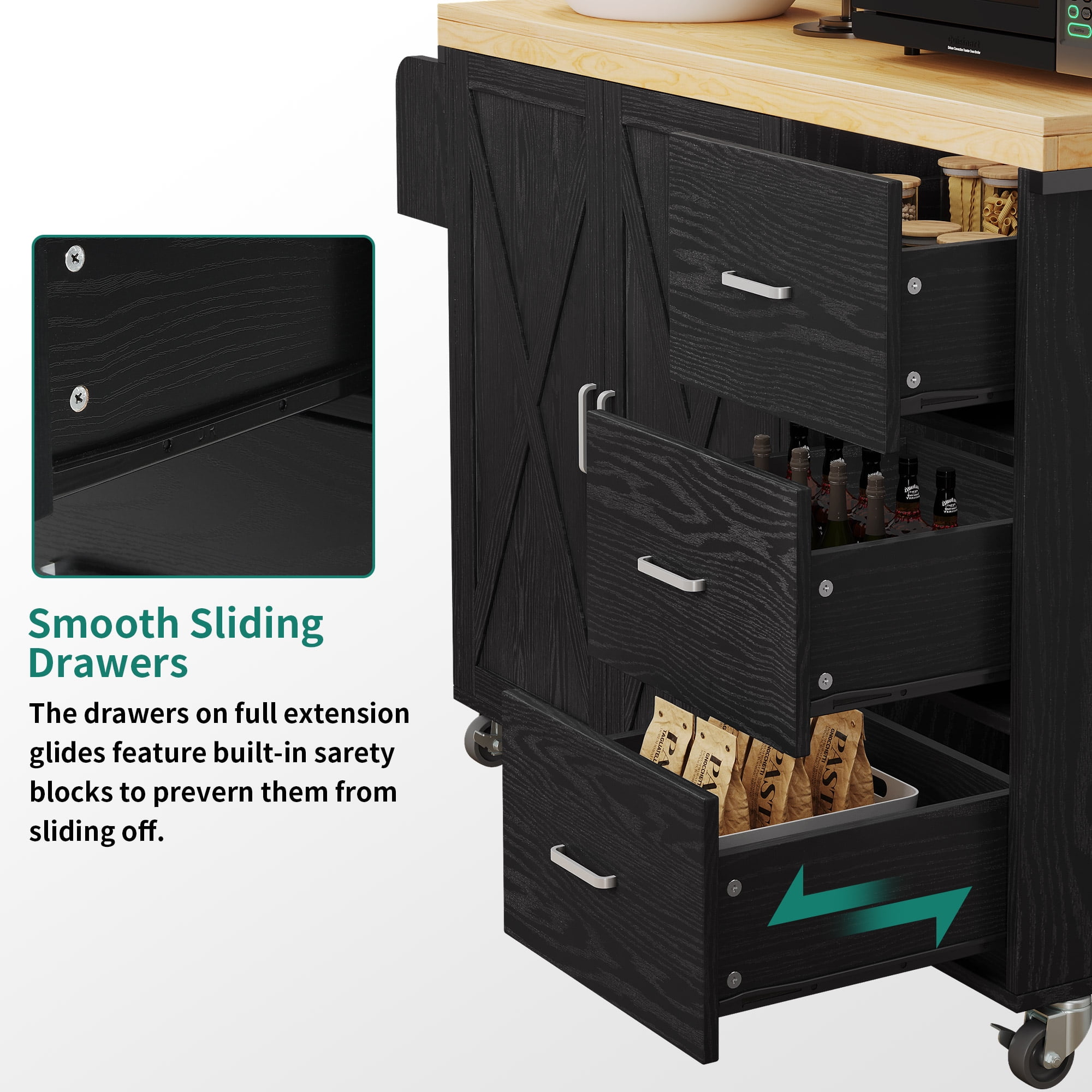 【Stable Structure】 Thick pinewood top on 4 sturdy legs & P2 grade MDF can support weight up to 300 Lbs without shaking; Painted in the smooth food-safe finish makes them waterproof and scratch-proof for easy cleaning and food preparation. 【Large Storage Space】The wide top of this rolling storage cabinet can be used as a cutting board or stand to put a microwave oven or roaster; Cabinet shelve & 3 drawers to classify cutlery, pots, pans & other essentials to keep your culinary space neat & clean. 【Easy To Move】360° industrial wheels are easy to move anywhere needed and can bear heavy loads without breaking, sturdier than other plastics; 2 of them are lockable to ensure high stability when stopped. 【Smooth Telescopic Channel】The kitchen island cart channel can slide in and out with ease, which has been tested many times in the factory. Metal sliding channel makes pull comfortable, drawers glide smoothly. A cabinet with hinges and a magnet keeps the door closed tightly. The drawer has a smooth telescopic channel, moving in and out with ease.